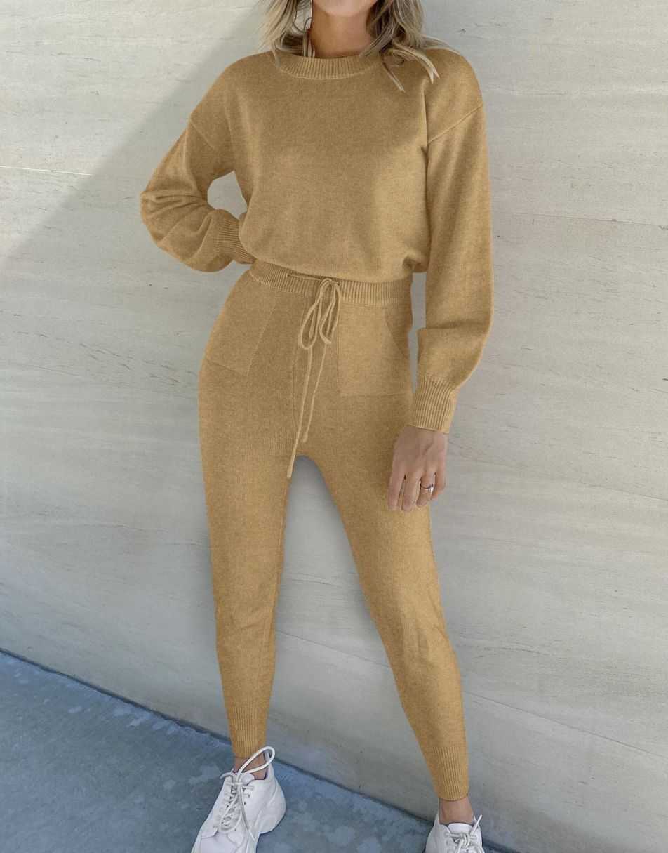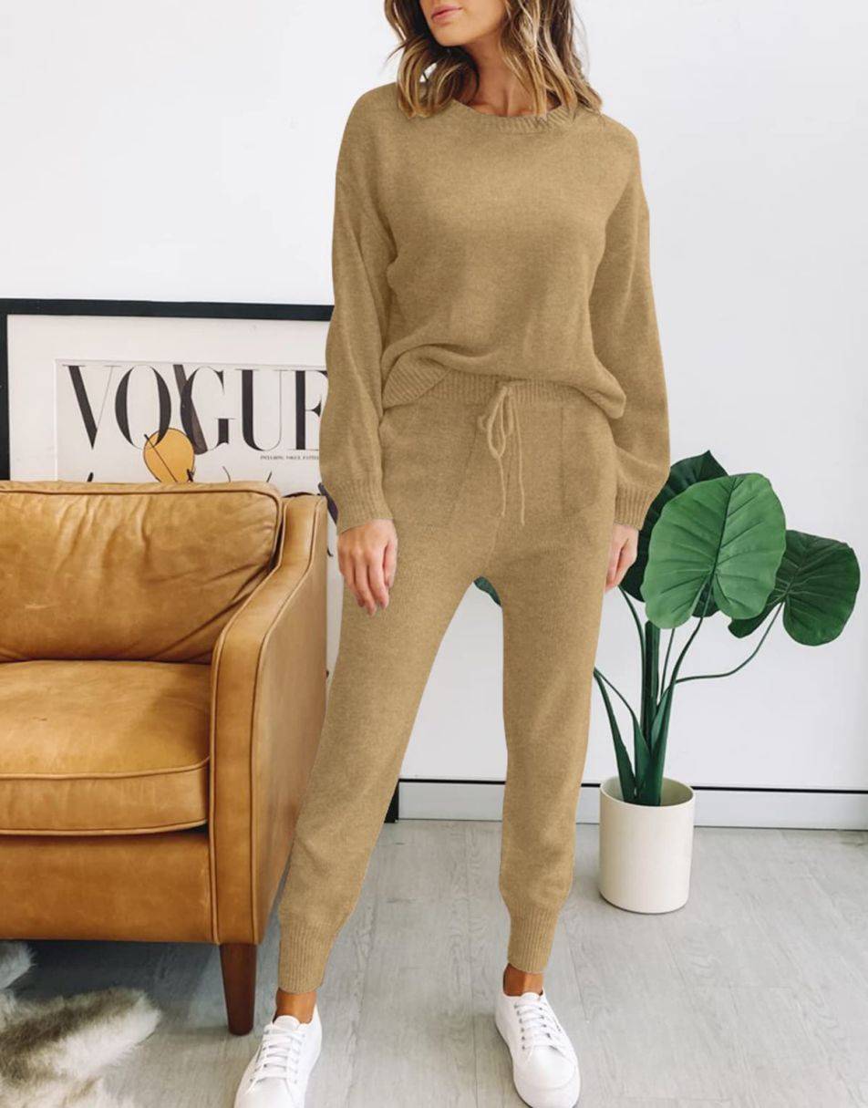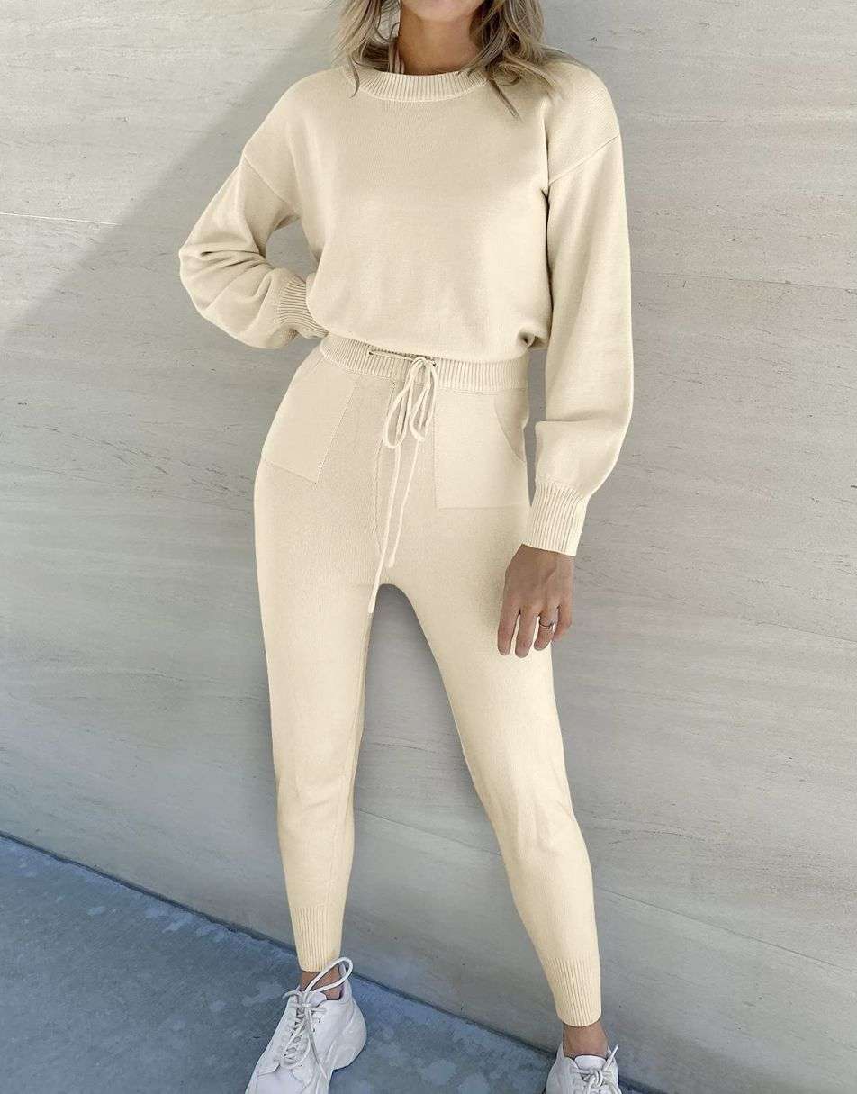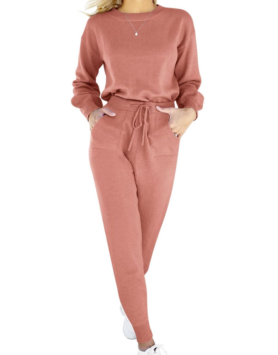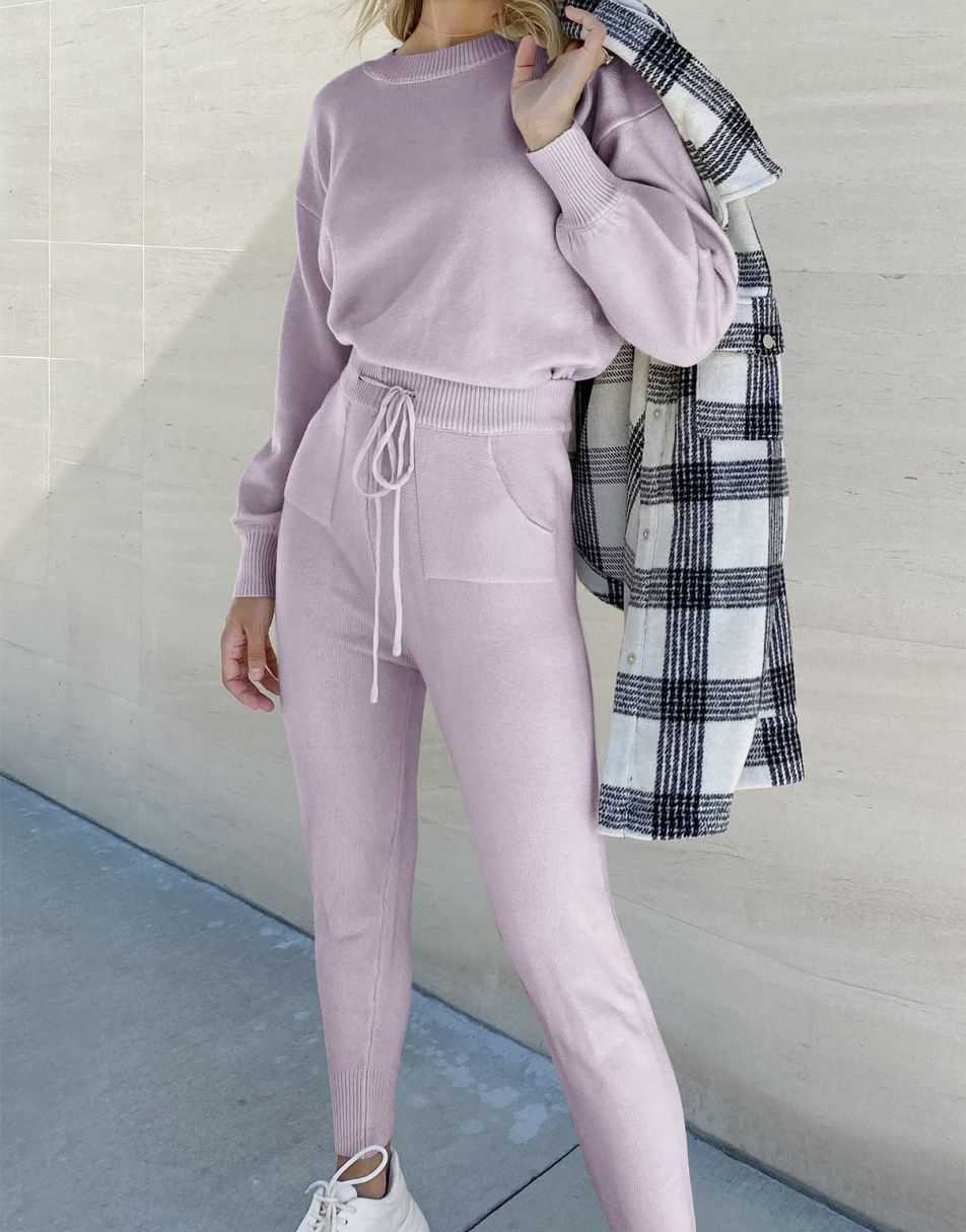 • STYLE: Two-piece set/long sleeve pullover tops/crew-neck/solid color/drawstring high waist pants/beam foot