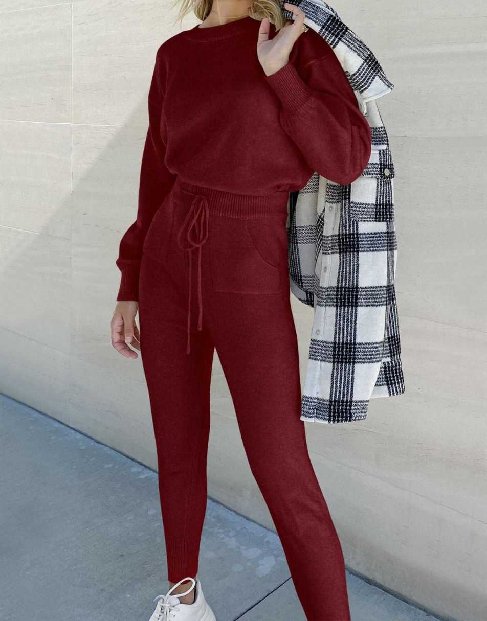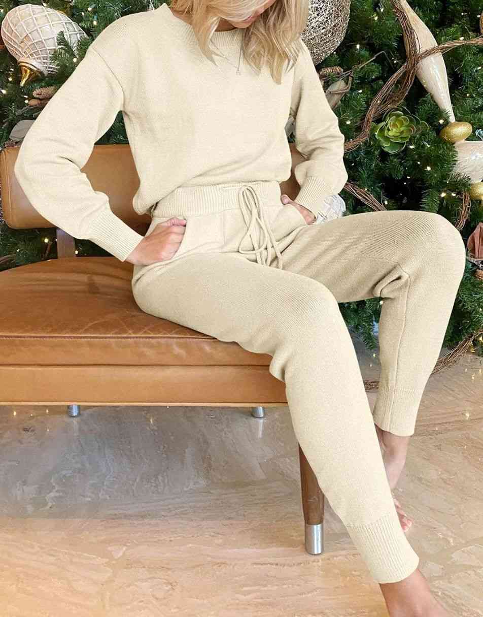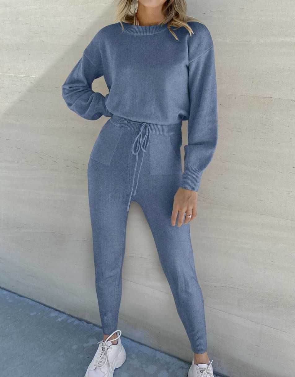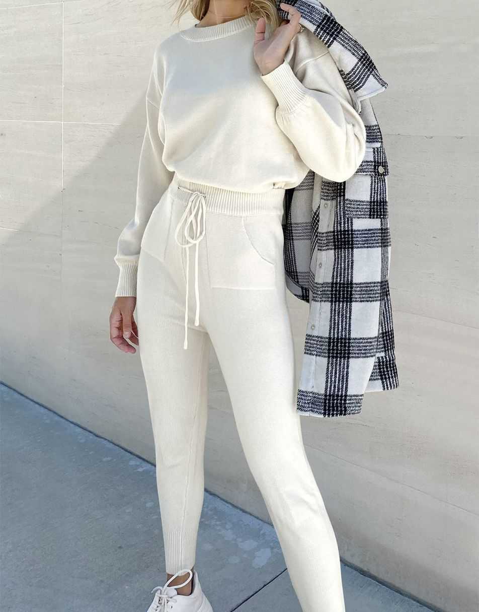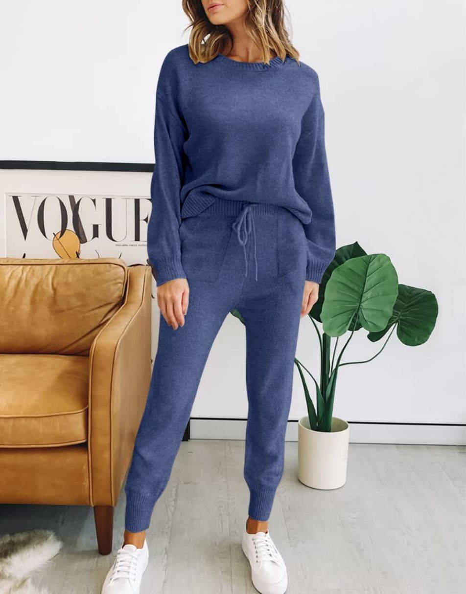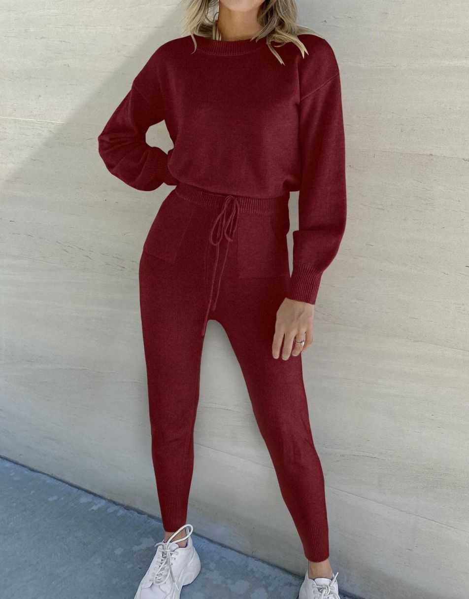 • STYLE: Two-piece set/long sleeve pullover tops/crew-neck/solid color/drawstring high waist pants/beam foot