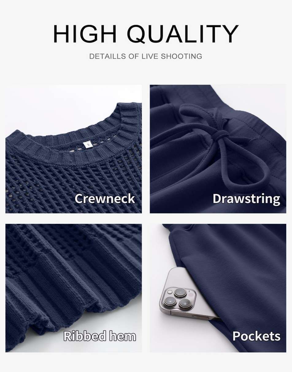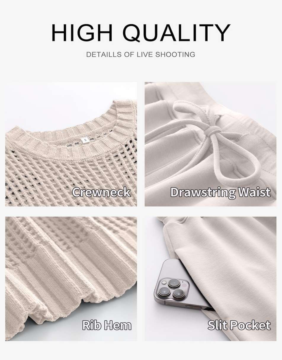 • Features - Women's Two Piece Outfits, hollow-carved design, crew neck, sheer pointelle stitch, short sleeve. This women's sweater set is perfect for daily wear, work, office, business, vacation.