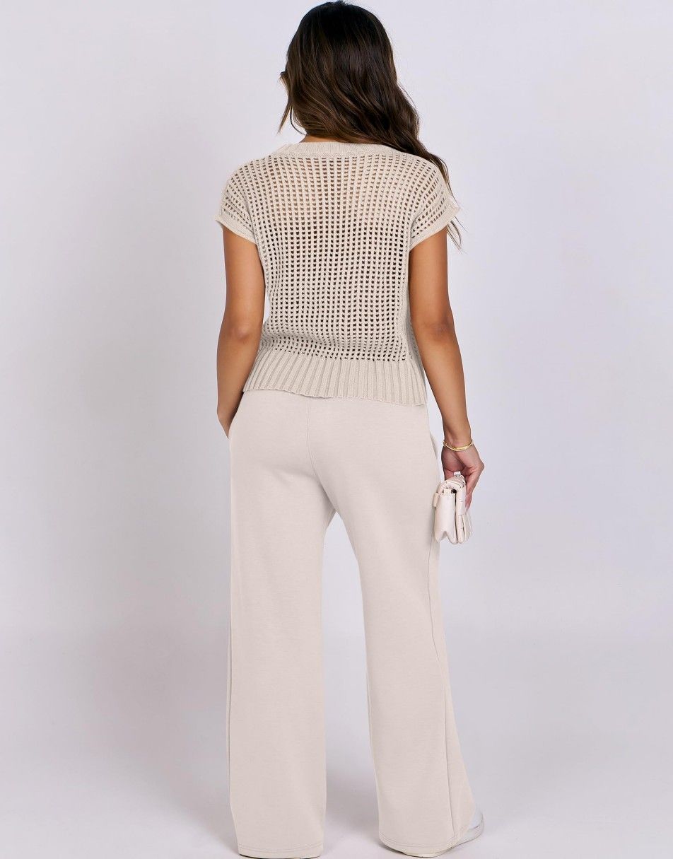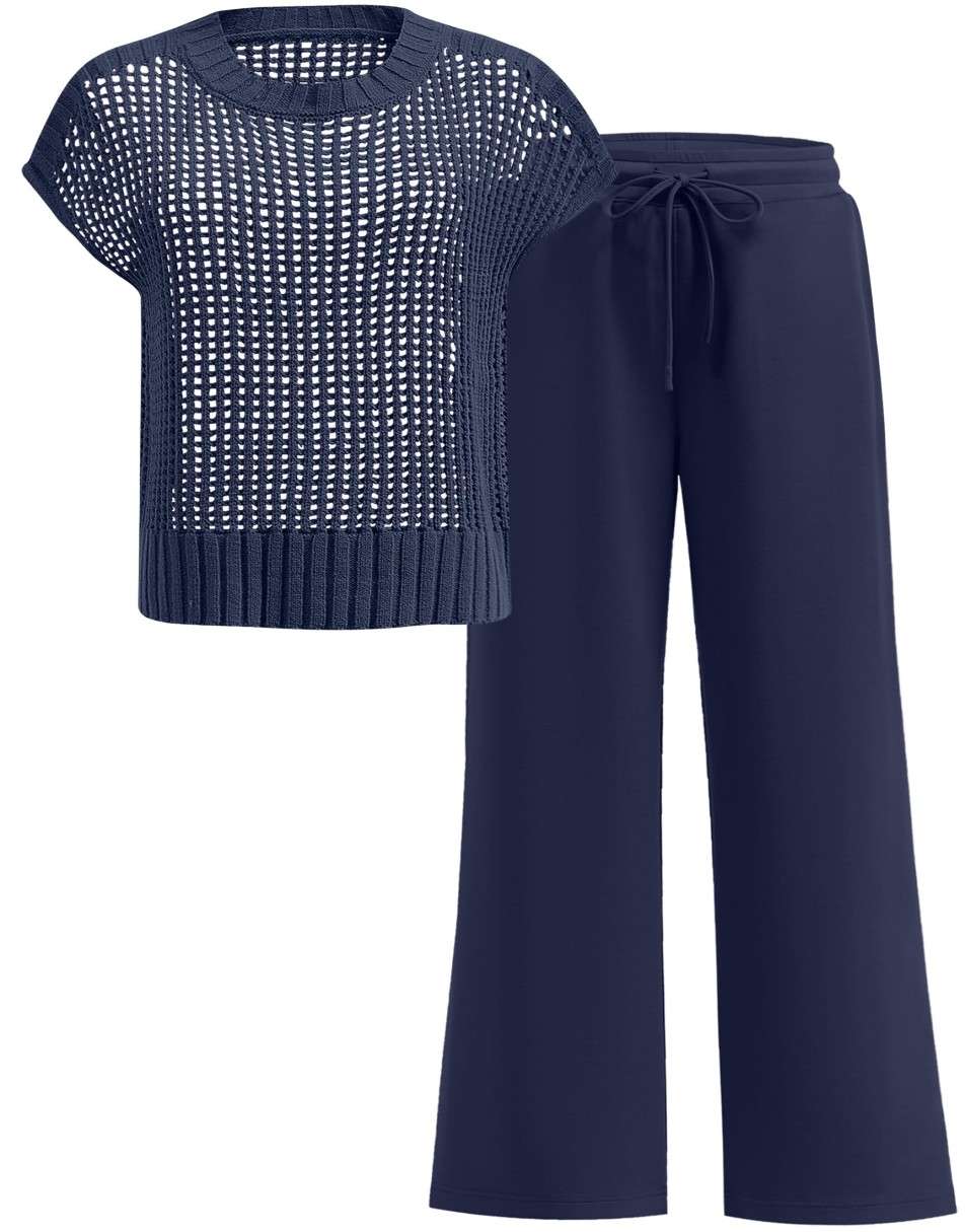 • ANRABESS Women Two Piece Outfits Crochet Sheer Knit Sweater Top Wide Leg Pants Lounge Matching Sets Sweatsuit Travel Clothes