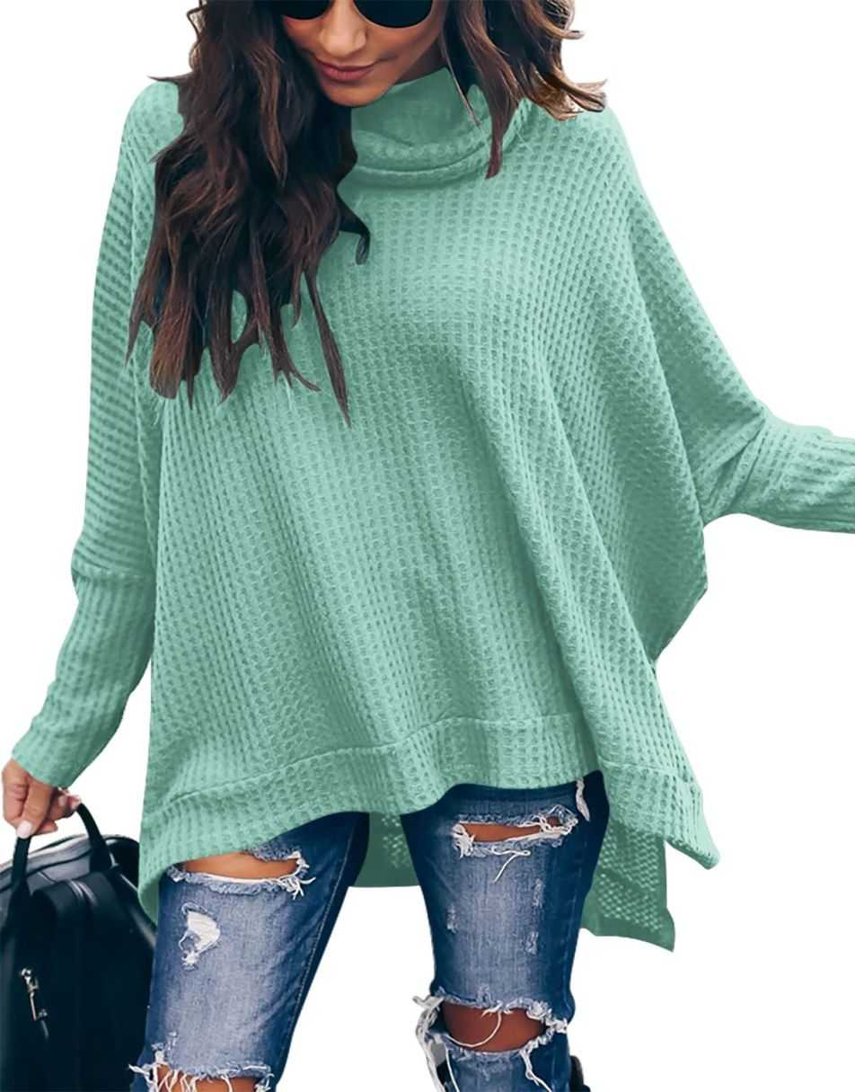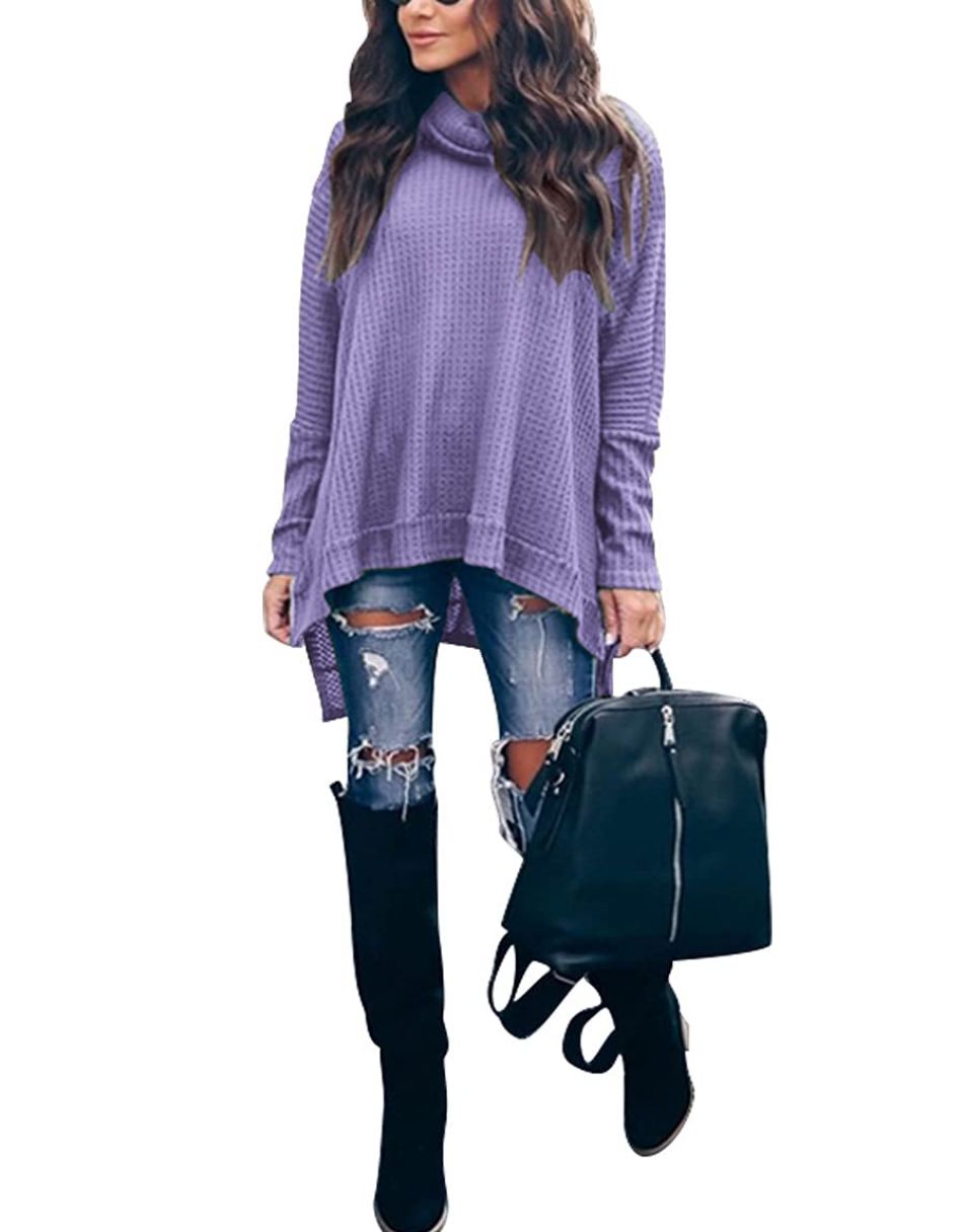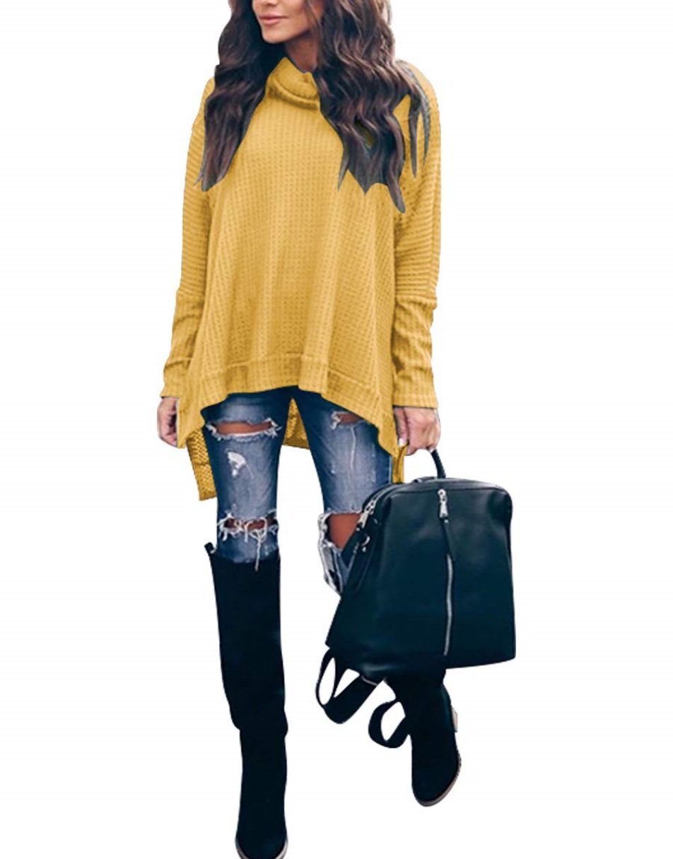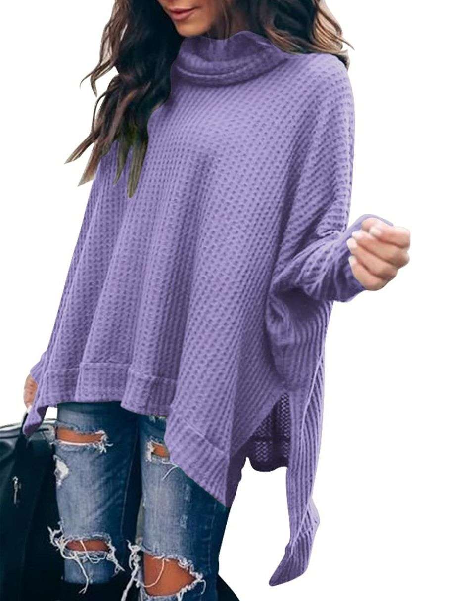 Features - This casual oversized pullover sweaters designed turtle cowl neck,waffle knit fabri锛�batwing sleeve,high low hem锛�side slit锛�flattering tunic tops.