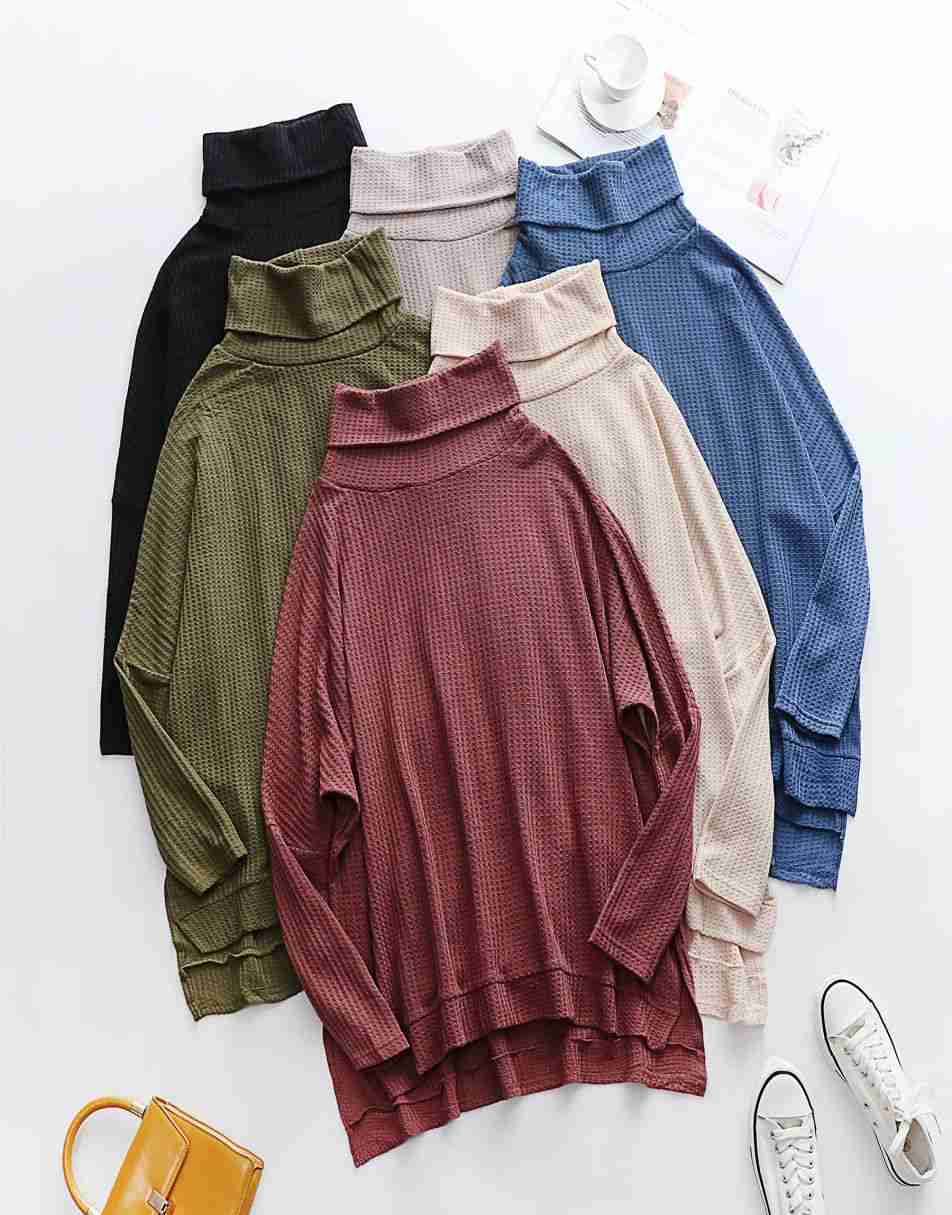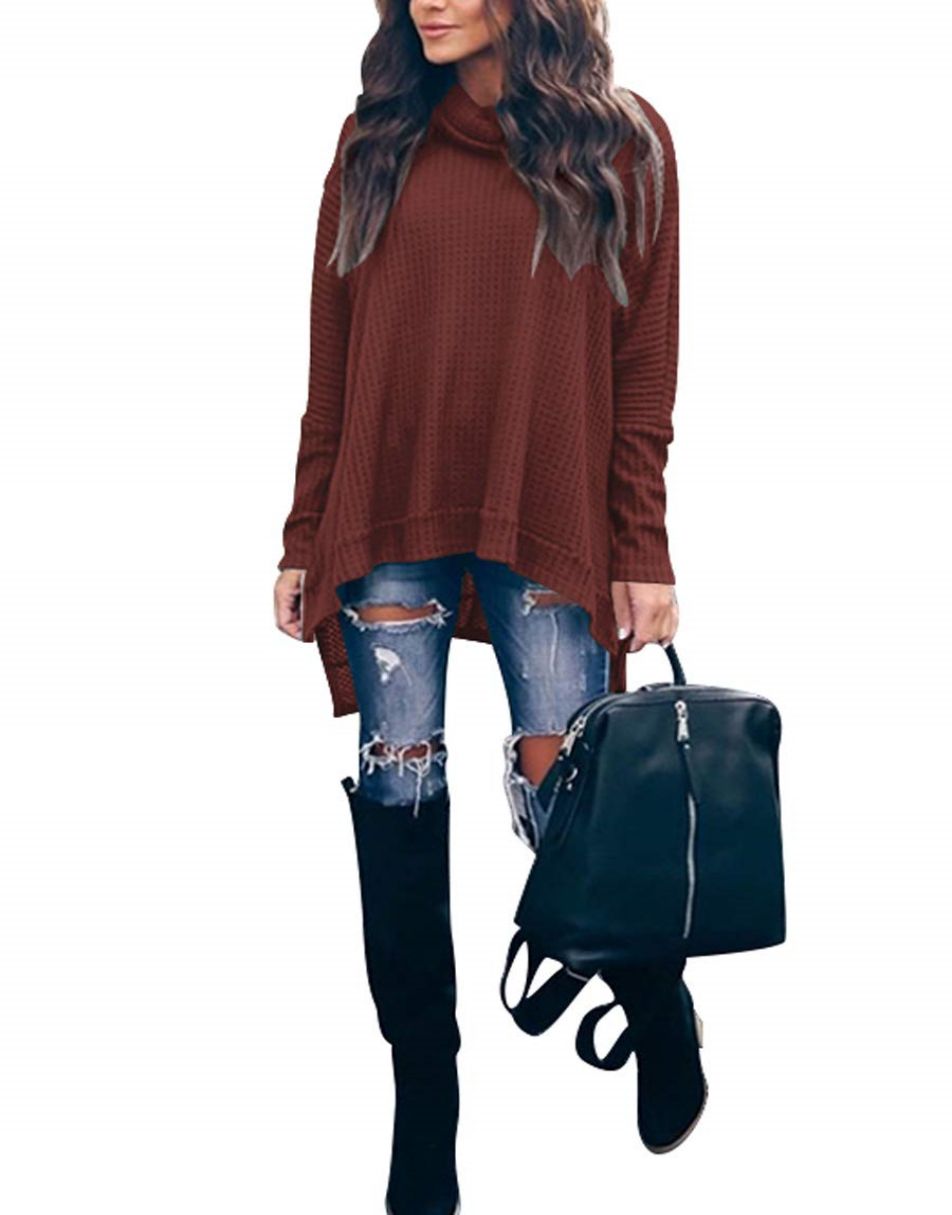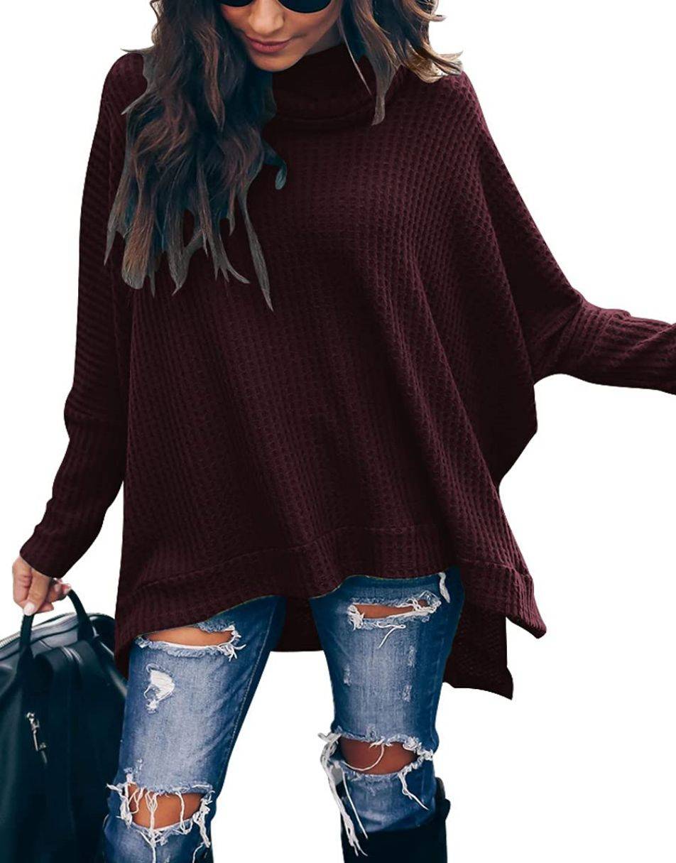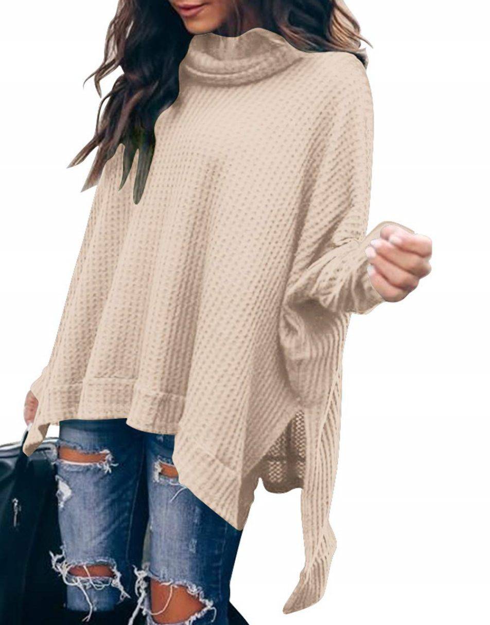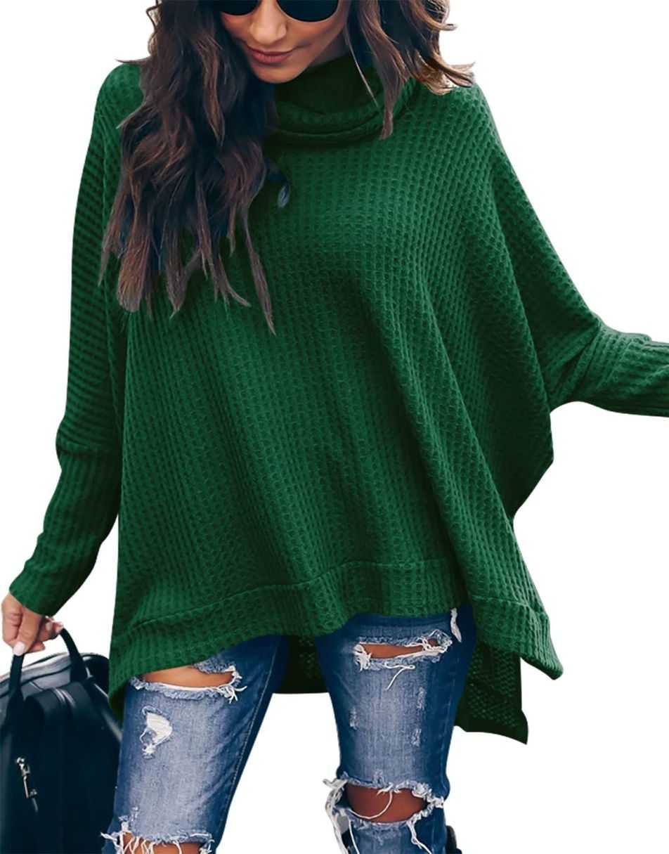 Features - This casual oversized pullover sweaters designed turtle cowl neck,waffle knit fabri锛�batwing sleeve,high low hem锛�side slit锛�flattering tunic tops.