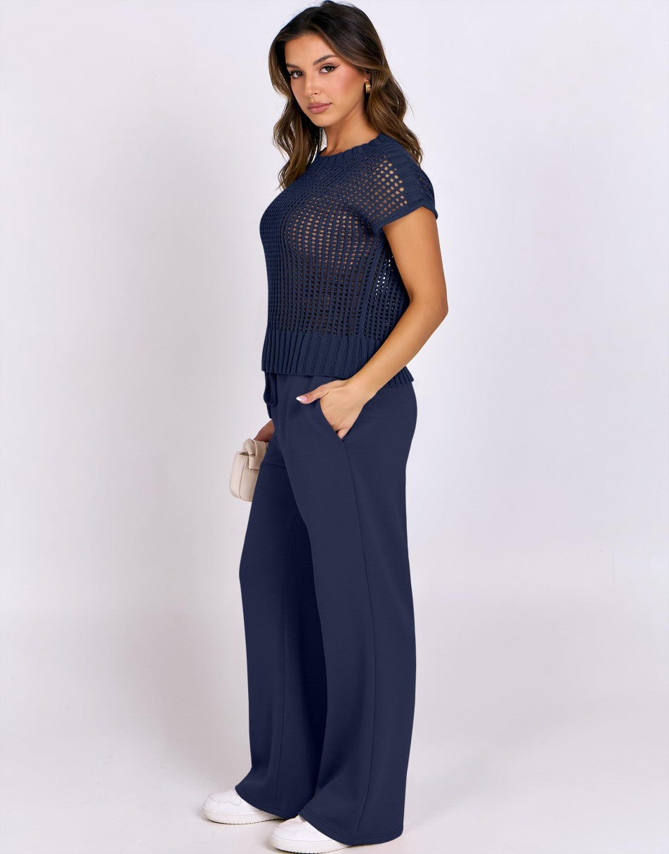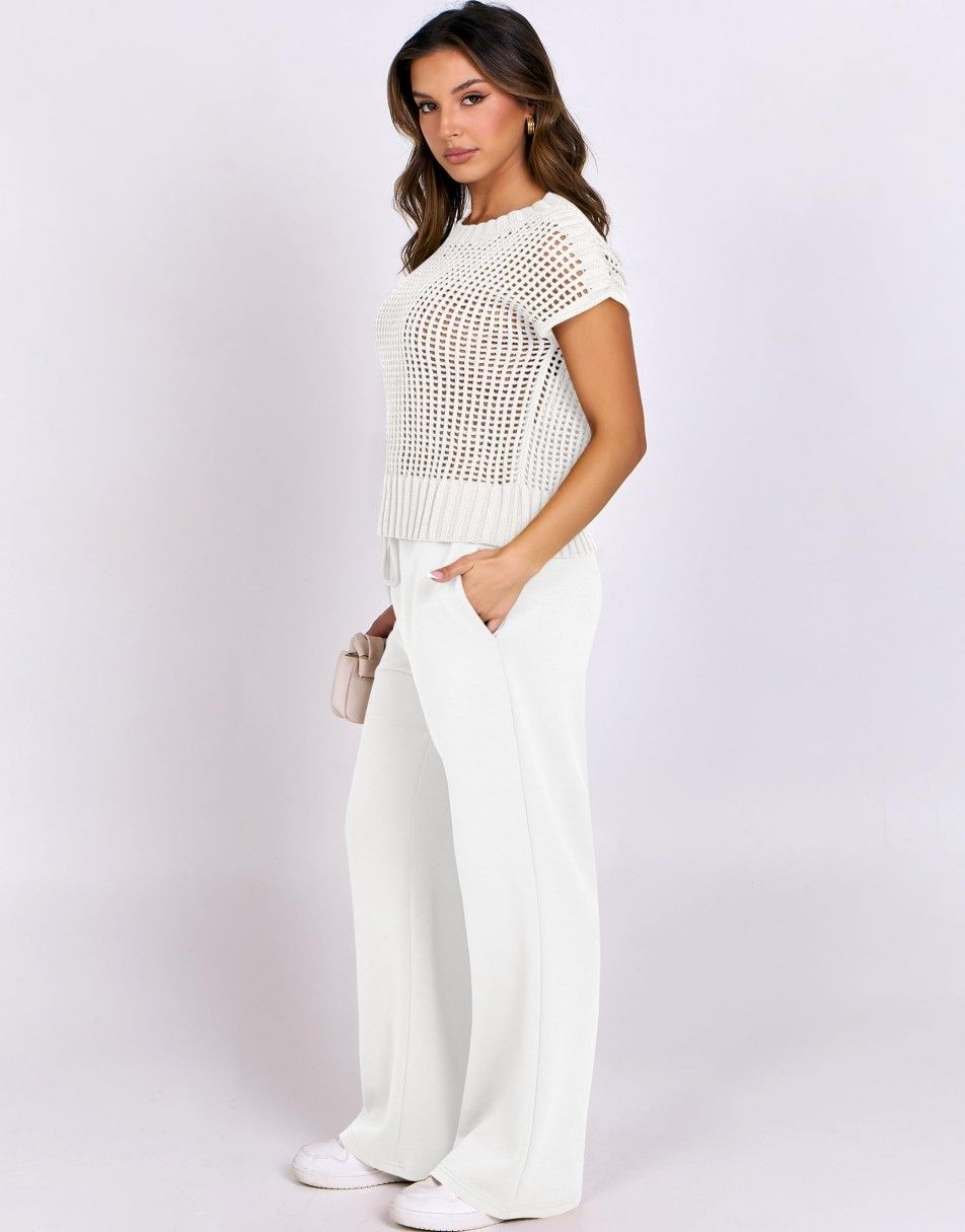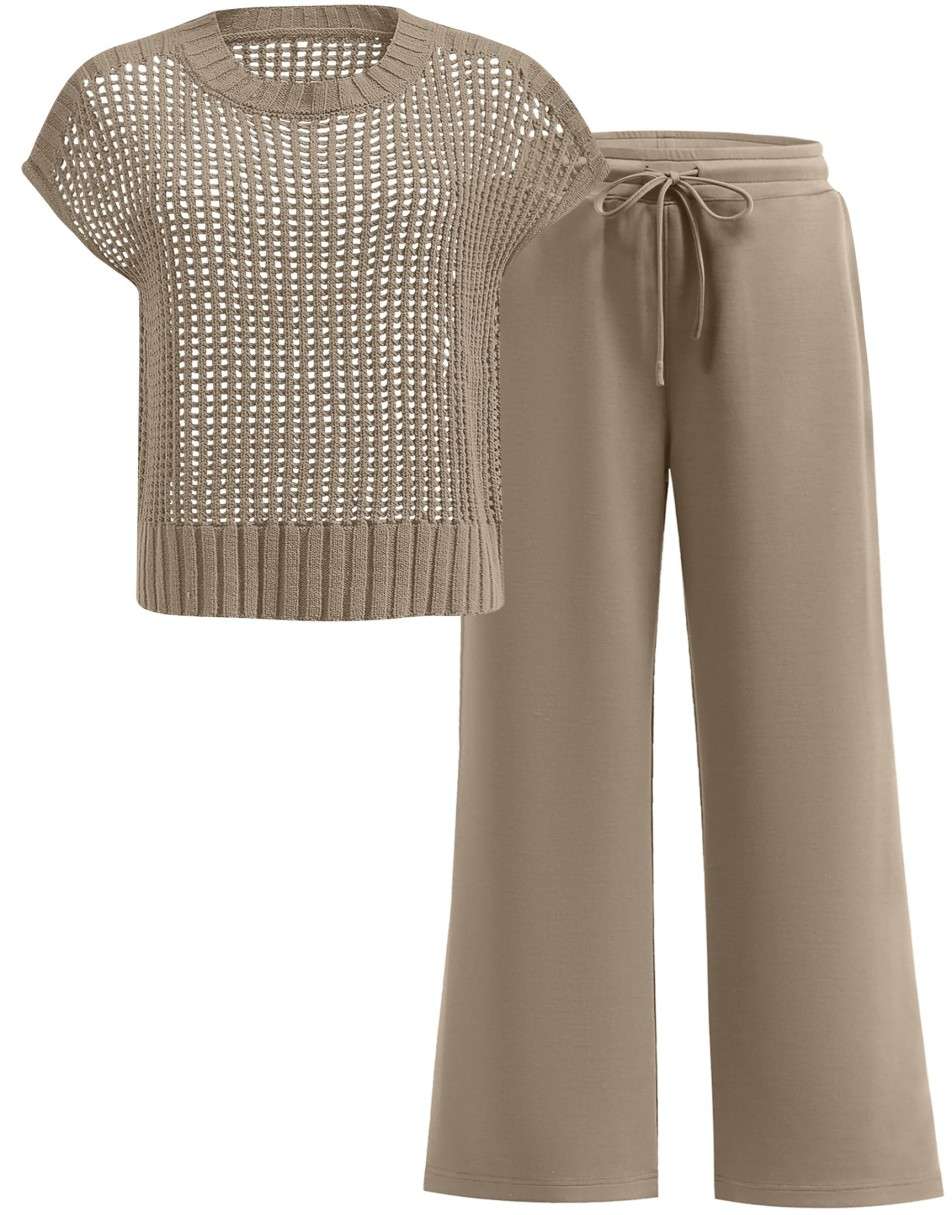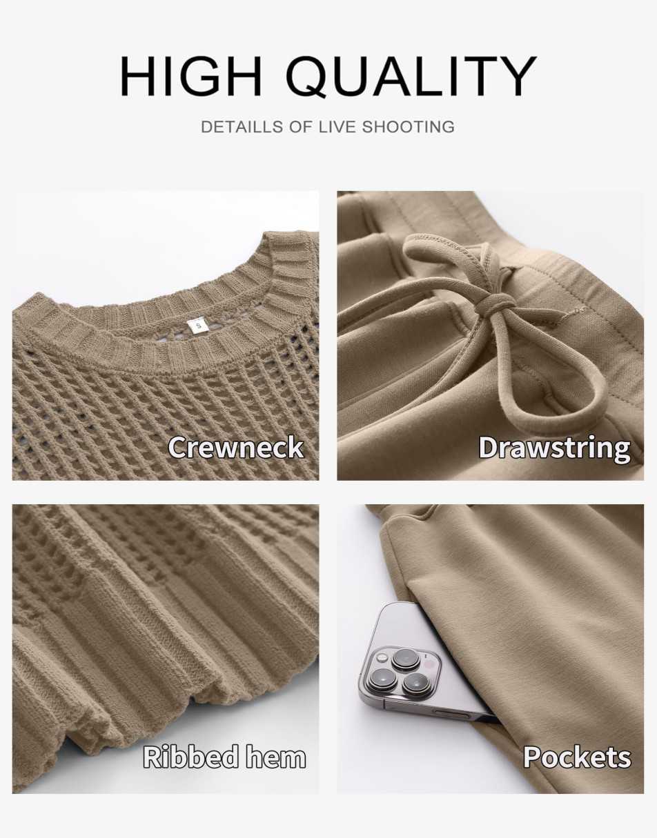 - Features - Women's Two Piece Outfits, hollow-carved design, crew neck, sheer pointelle stitch, short sleeve. This women's sweater set is perfect for daily wear, work, office, business, vacation.