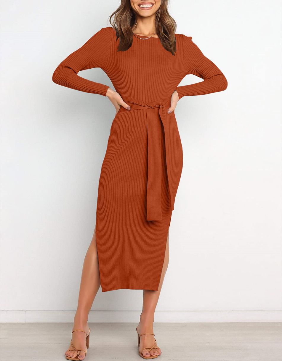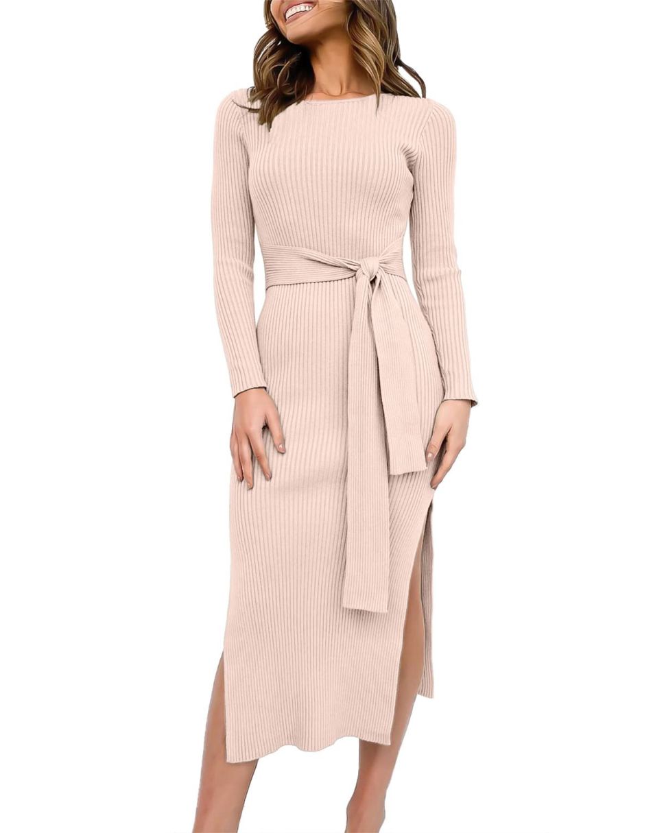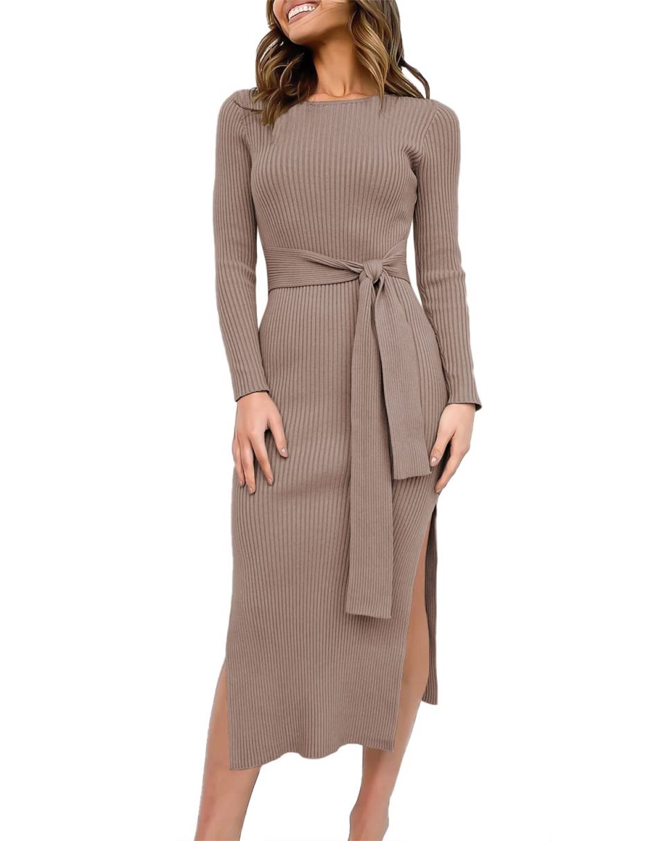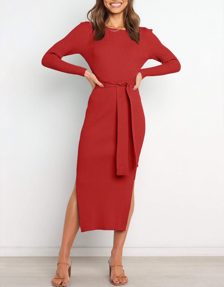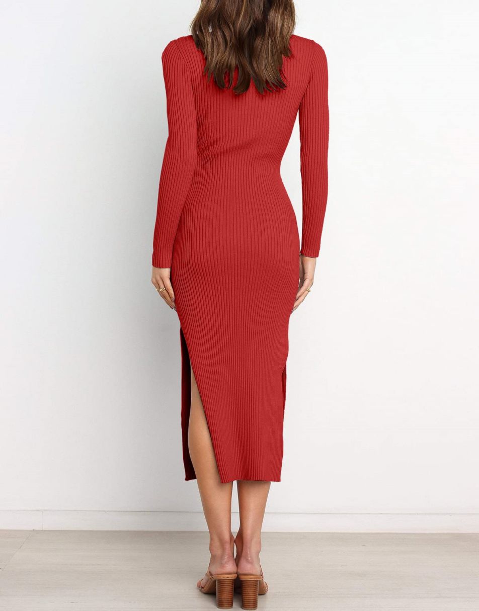 Anrabess Slim-fit Knitted slit Midi Sweater Dress