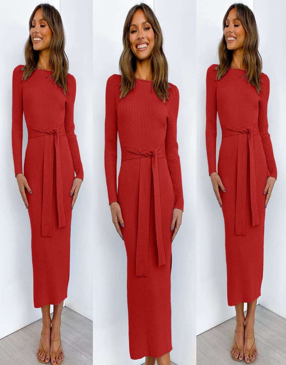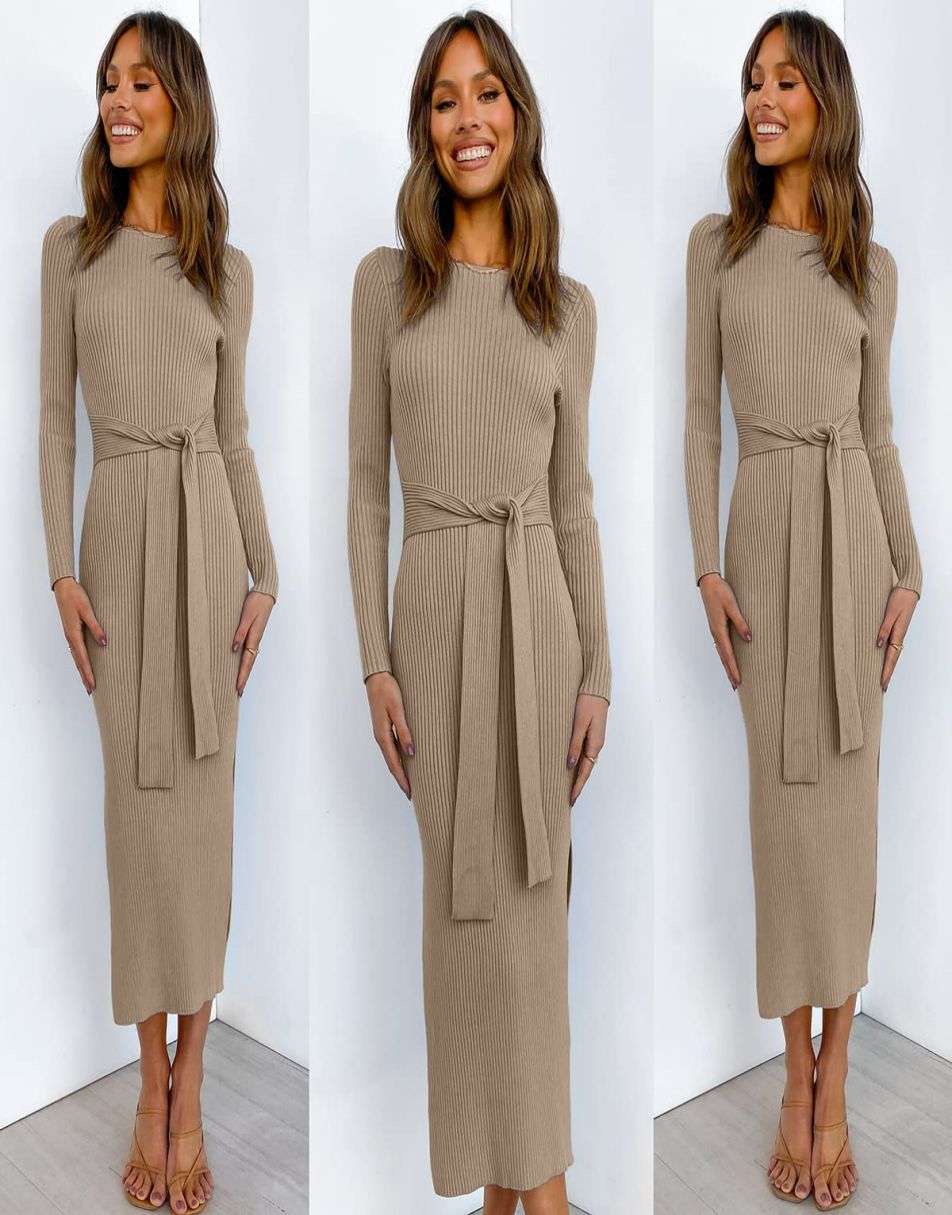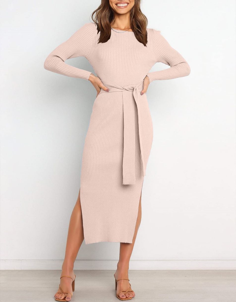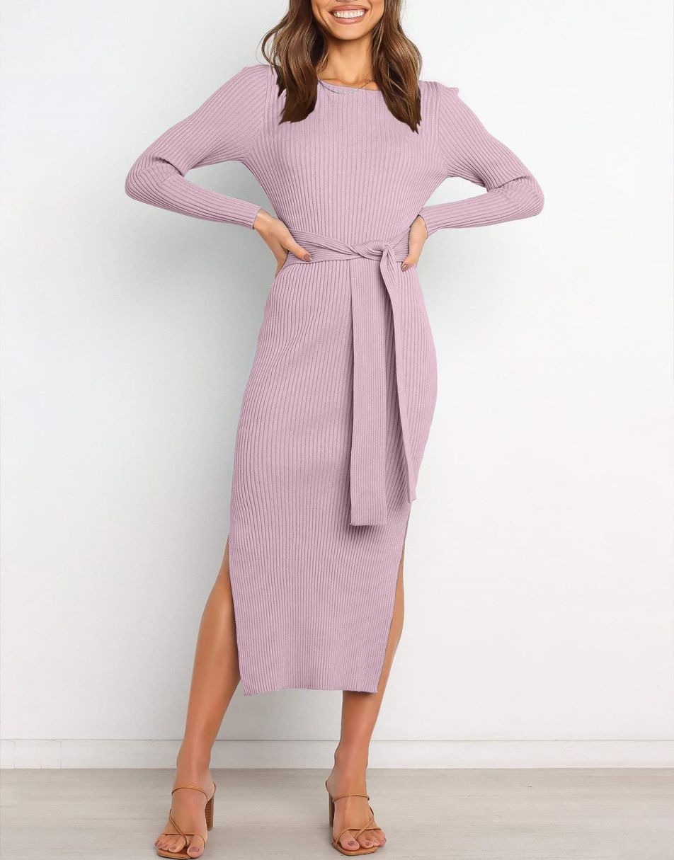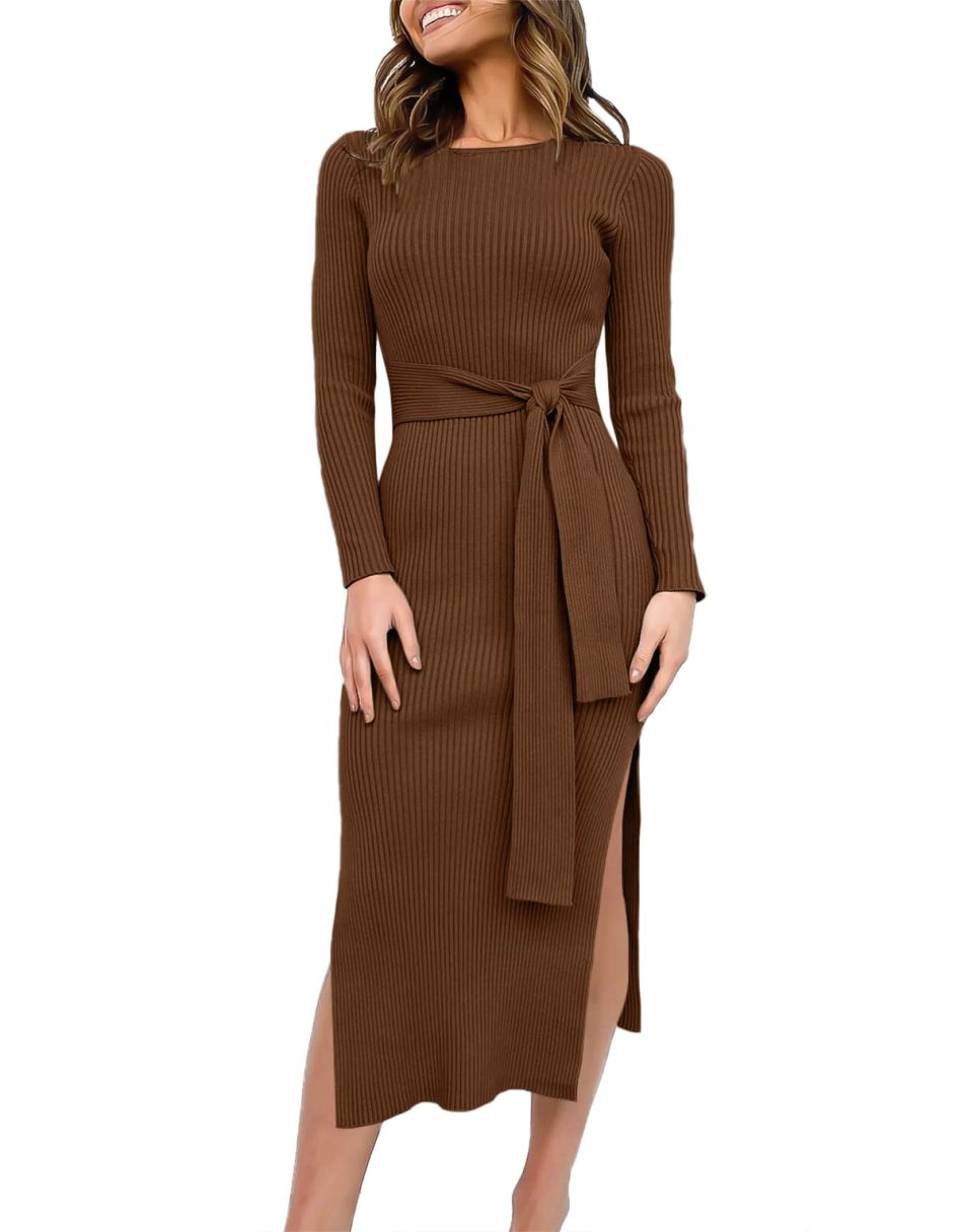 Anrabess Slim-fit Knitted slit Midi Sweater Dress