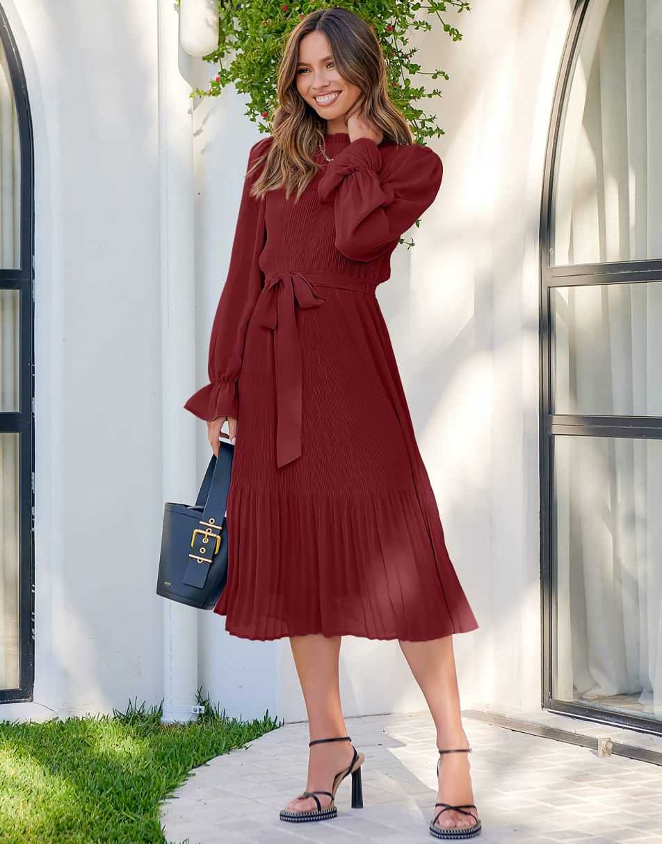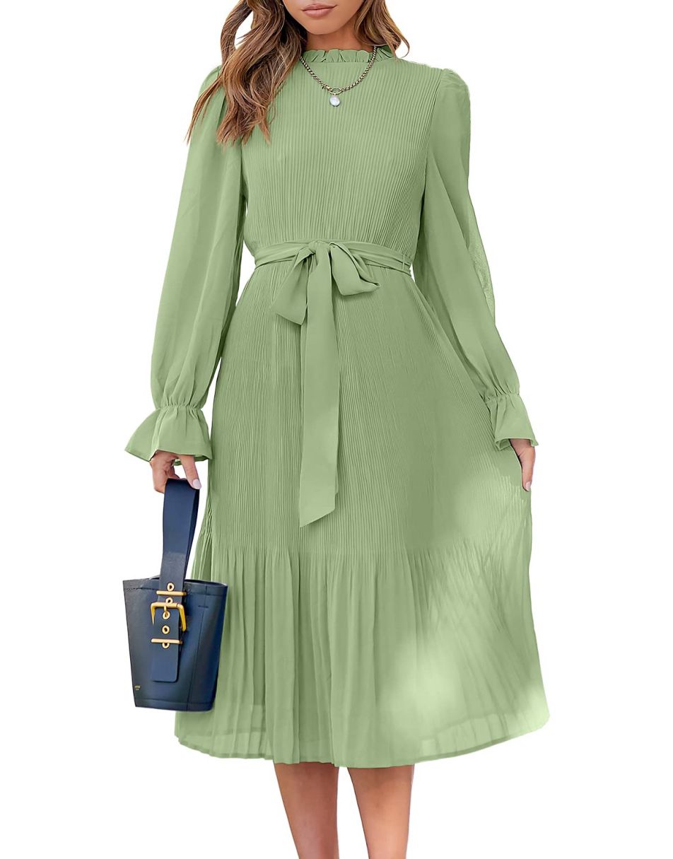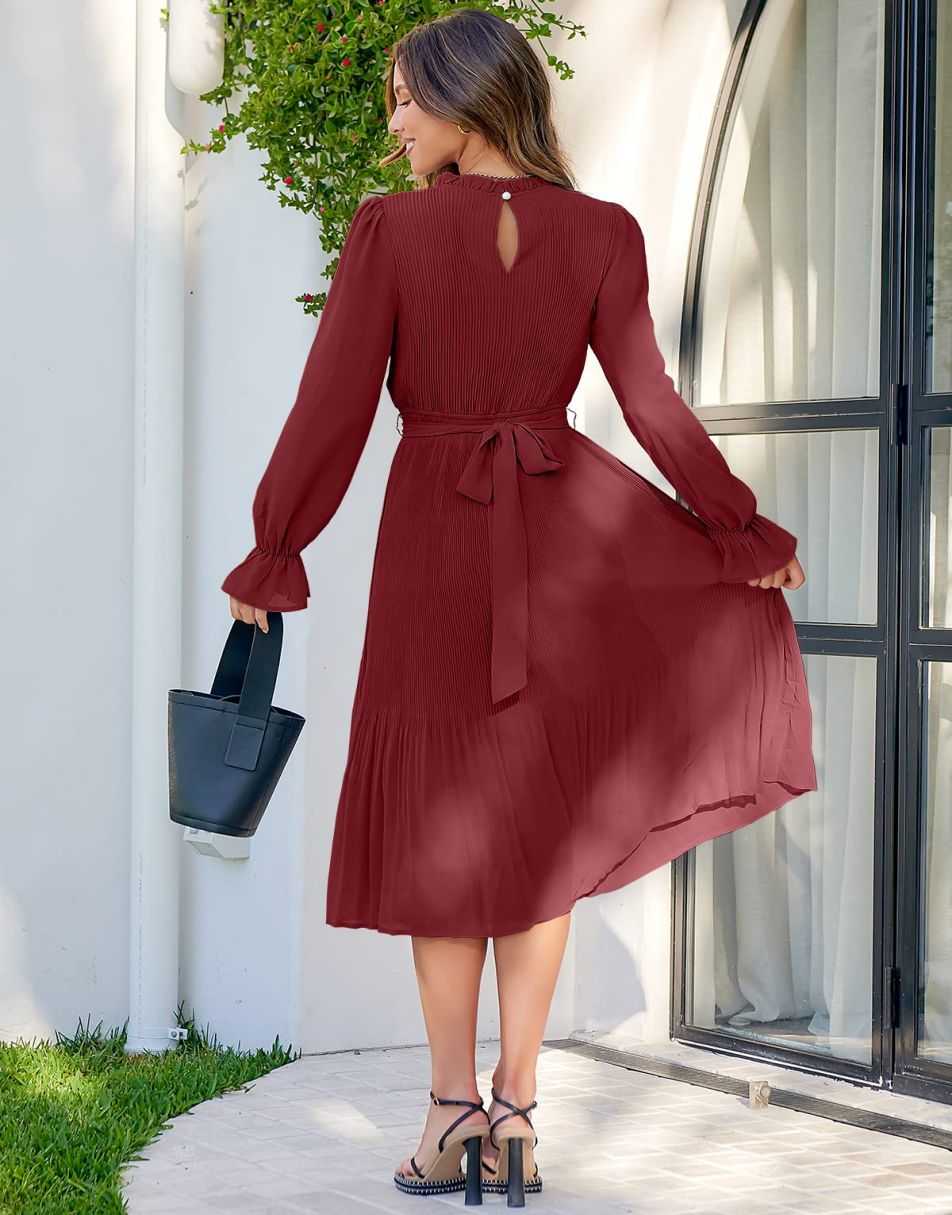 Features - this elegant midi dress is ANRABESS fall recommendation锛�which featured ruffle trim neckine锛�smocked and pleated A-Line body shape锛�chiffon fabrication make flowy swing skirt锛�pull long sleeve with elastic cuff锛�wasit belt for a cute decoration.