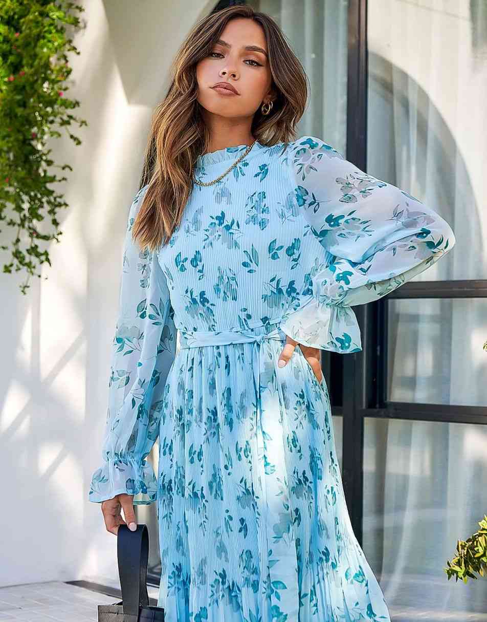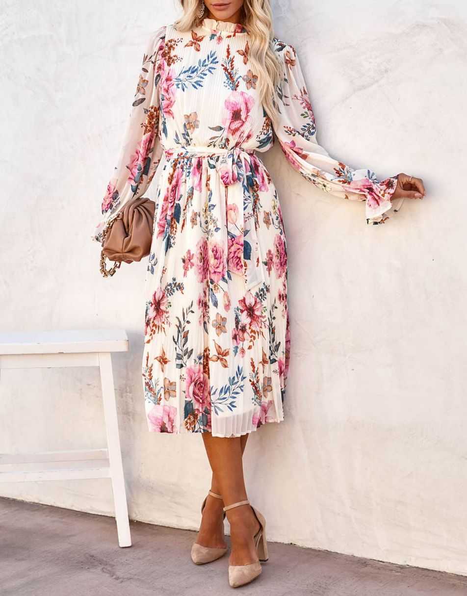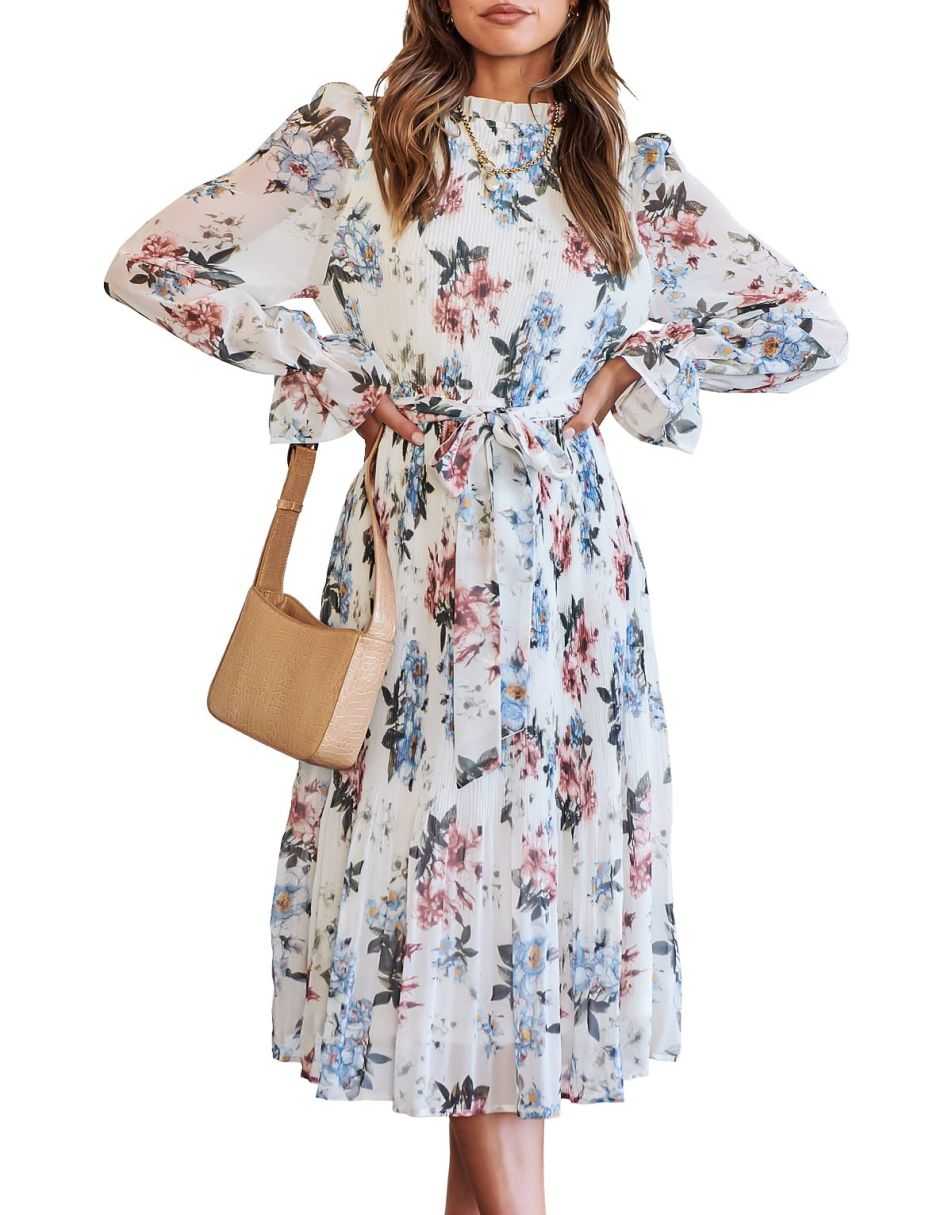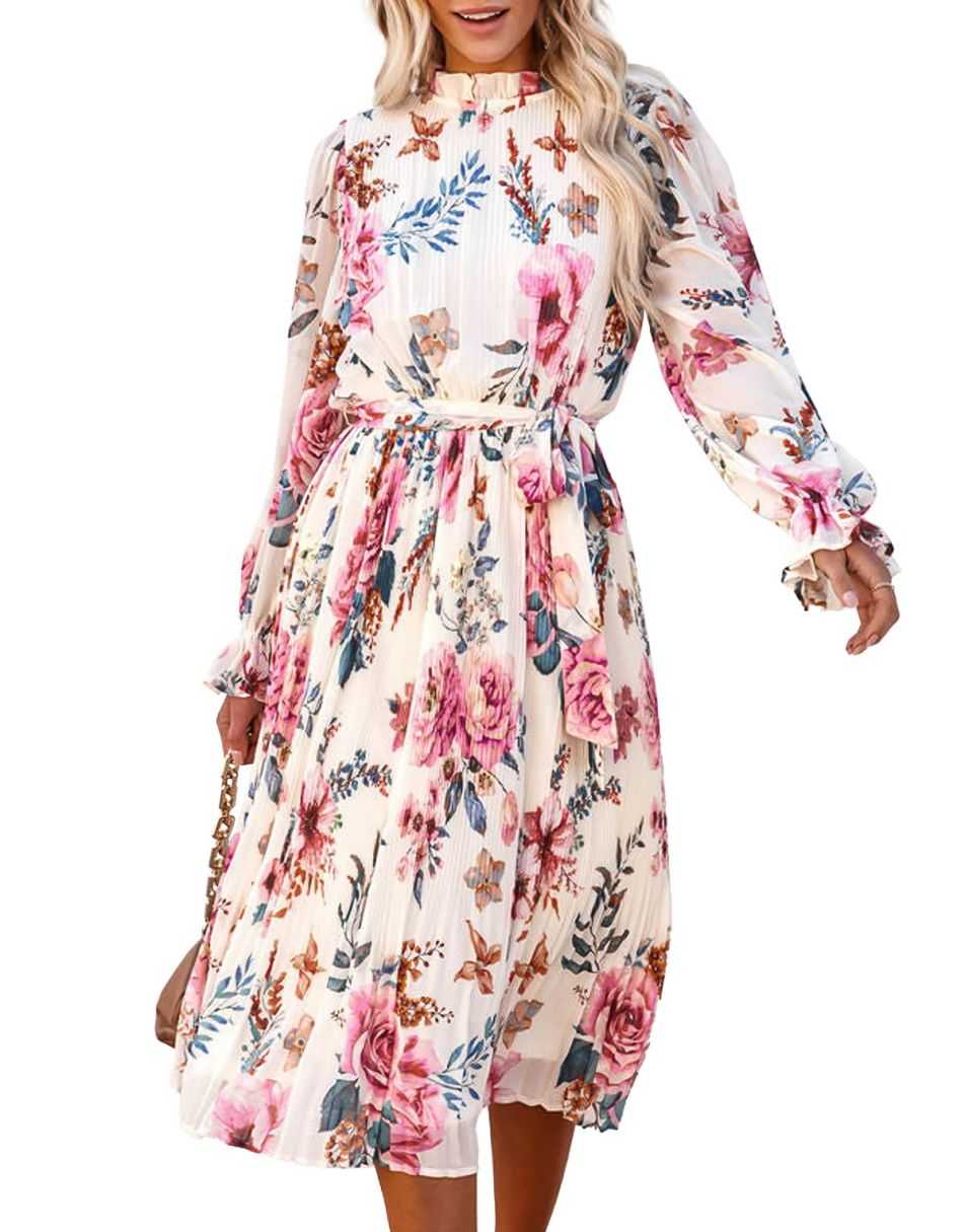 Features - this elegant midi dress is ANRABESS fall recommendation锛�which featured ruffle trim neckine锛�smocked and pleated A-Line body shape锛�chiffon fabrication make flowy swing skirt锛�pull long sleeve with elastic cuff锛�wasit belt for a cute decoration.