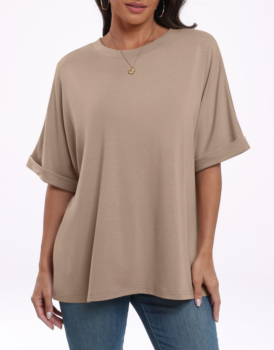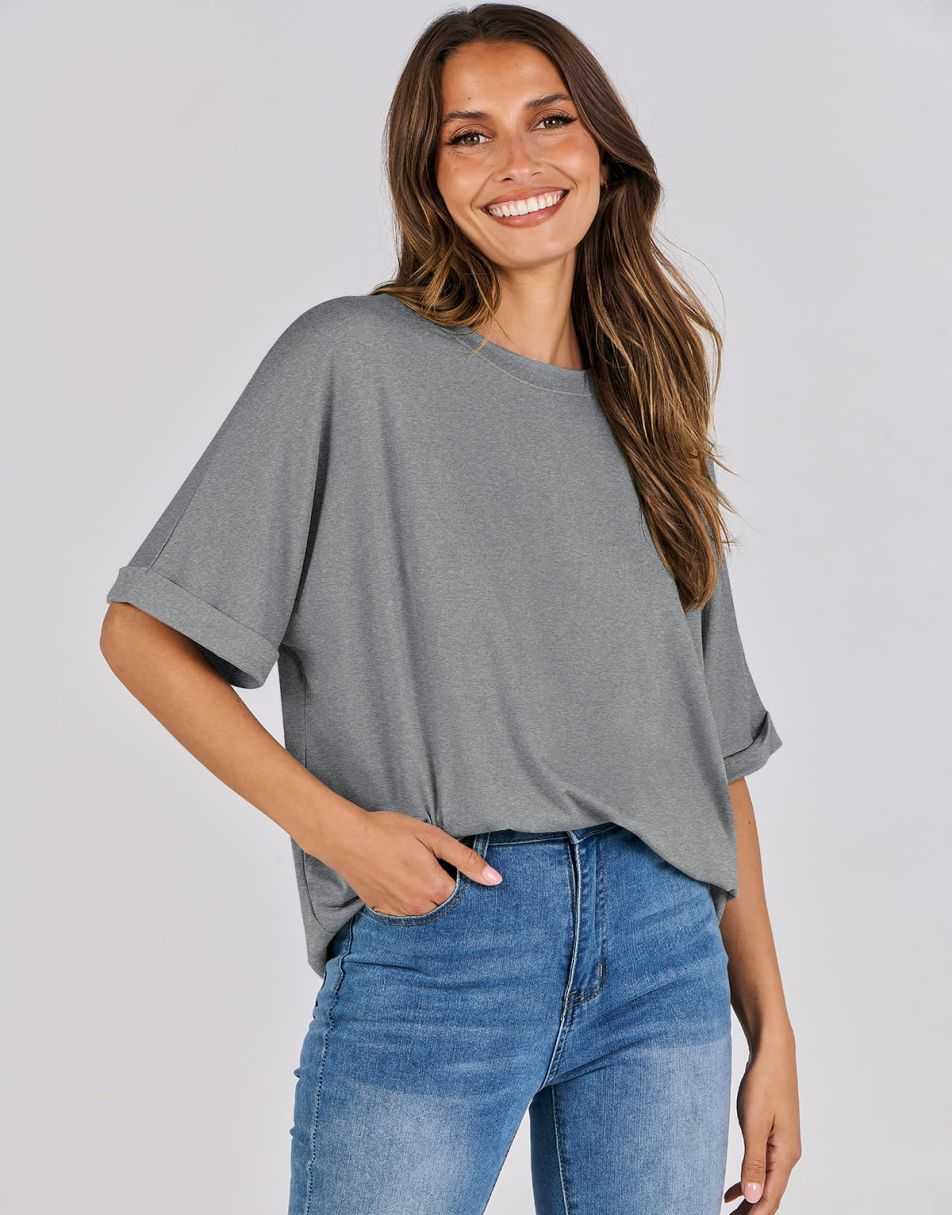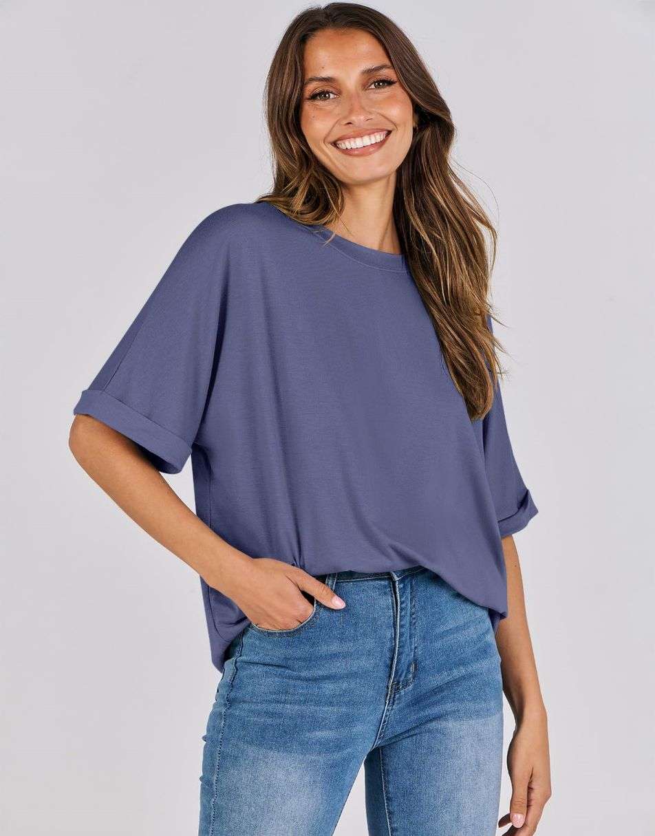 - Designs: Crewneck, short roll sleeves, oversized fit, drop shoulders, tunic length, basic tees, loose fit shirts, soft and comfortable fabric