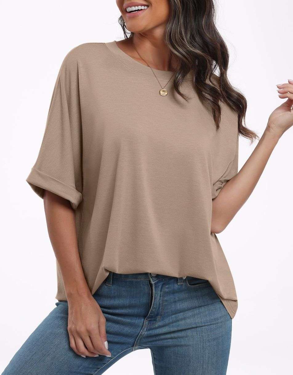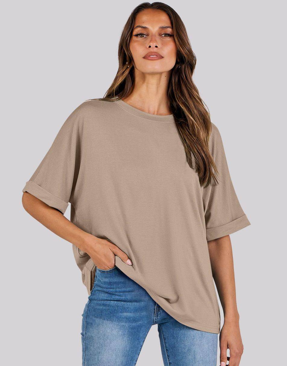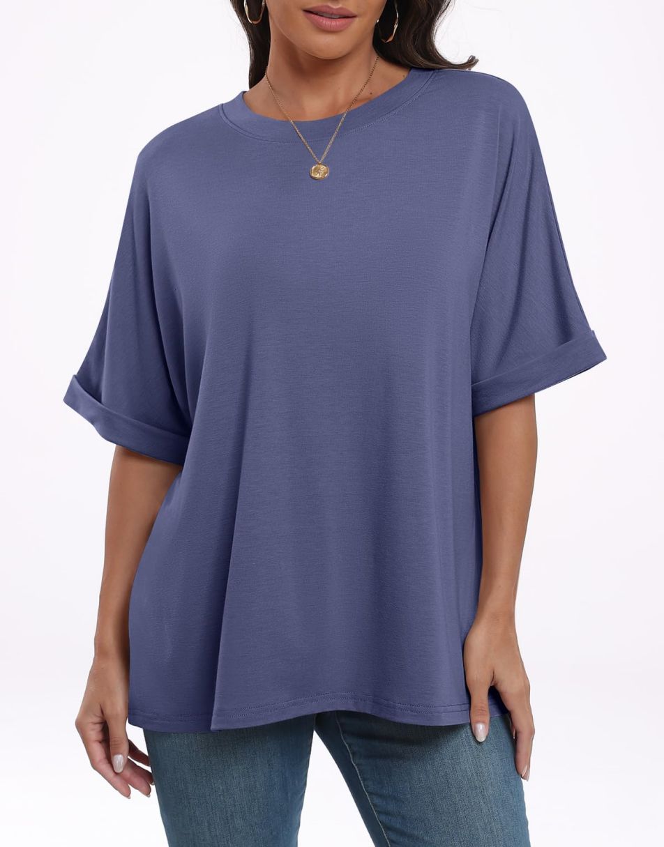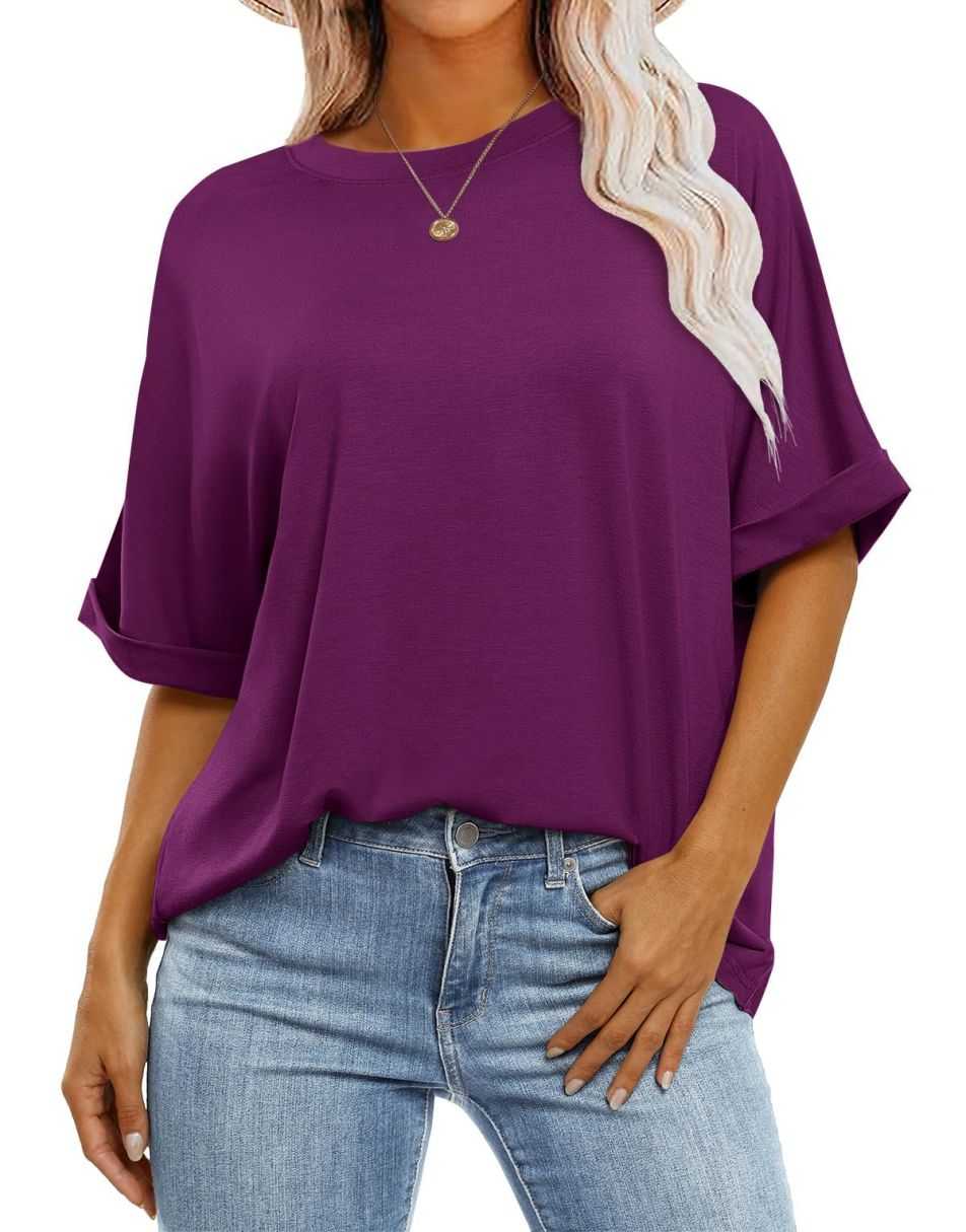 - Designs: Crewneck, short roll sleeves, oversized fit, drop shoulders, tunic length, basic tees, loose fit shirts, soft and comfortable fabric