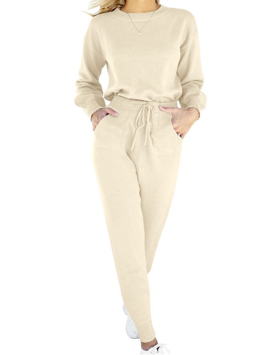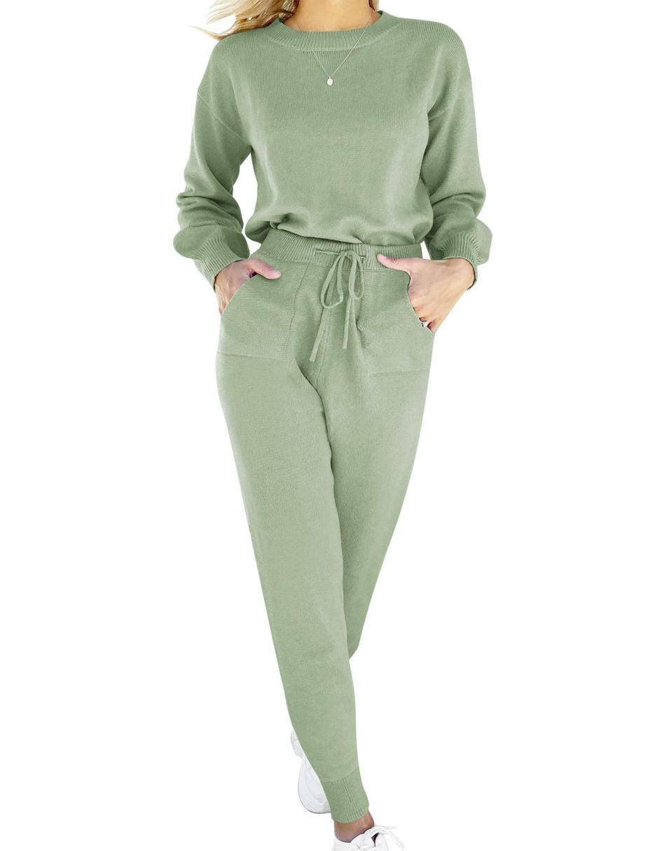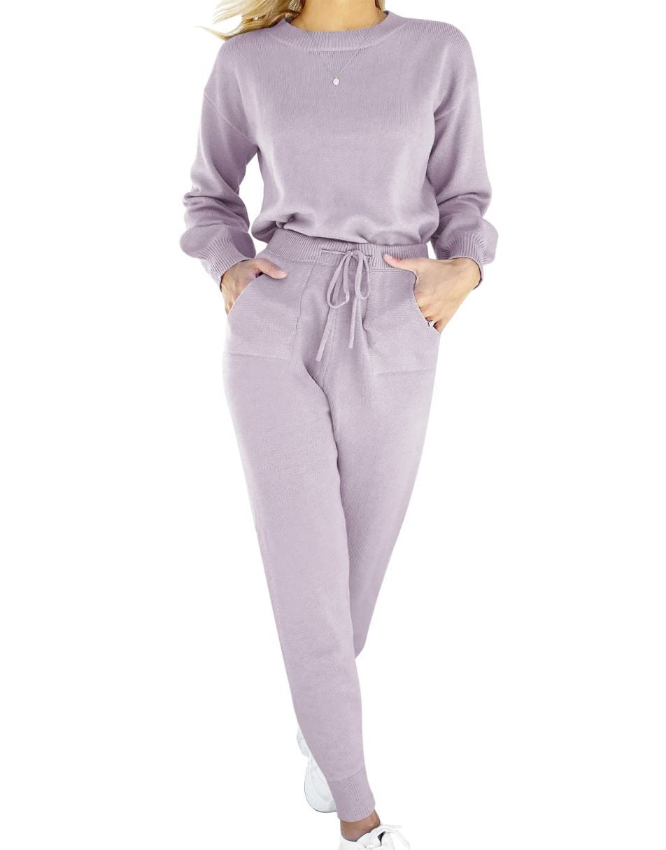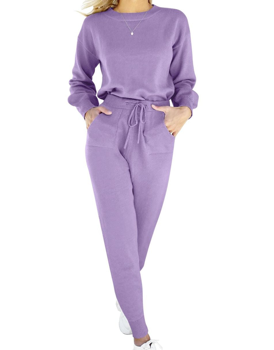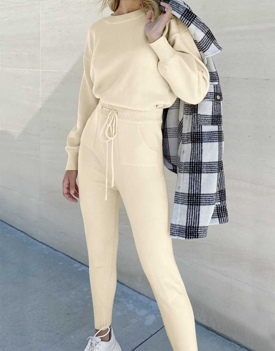 • STYLE: Two-piece set/long sleeve pullover tops/crew-neck/solid color/drawstring high waist pants/beam foot