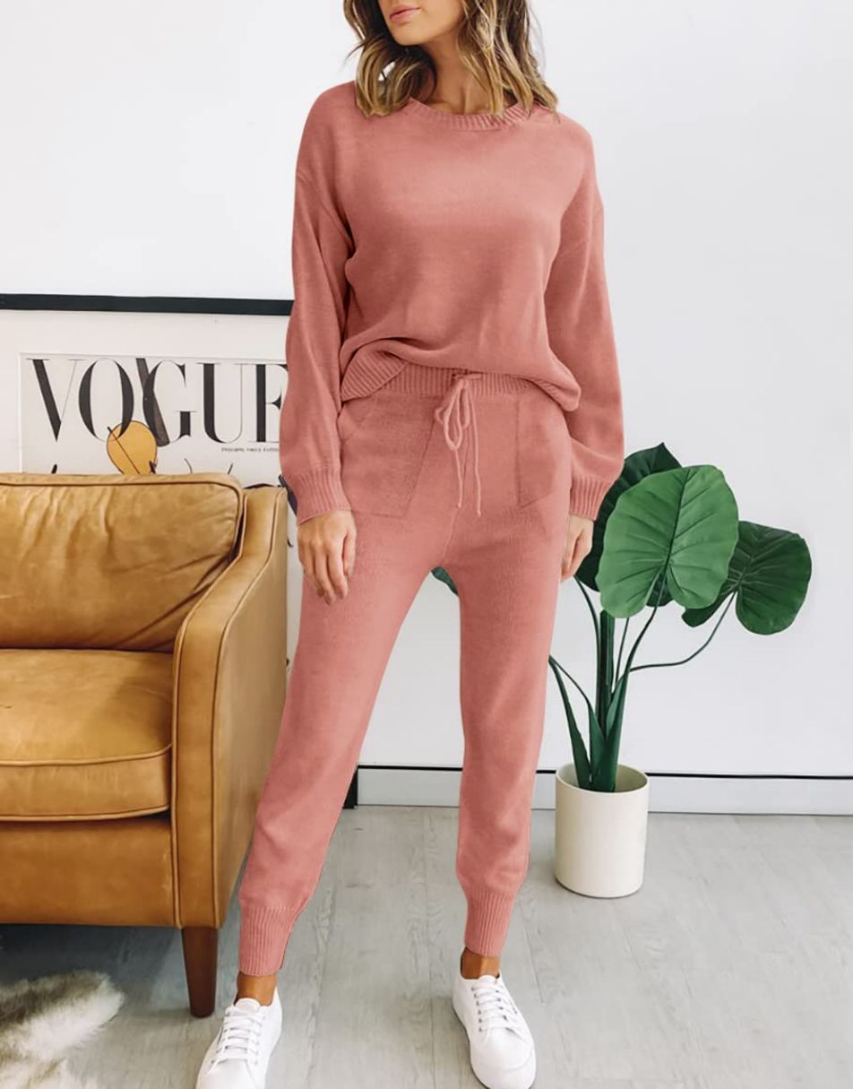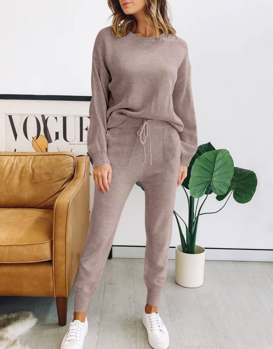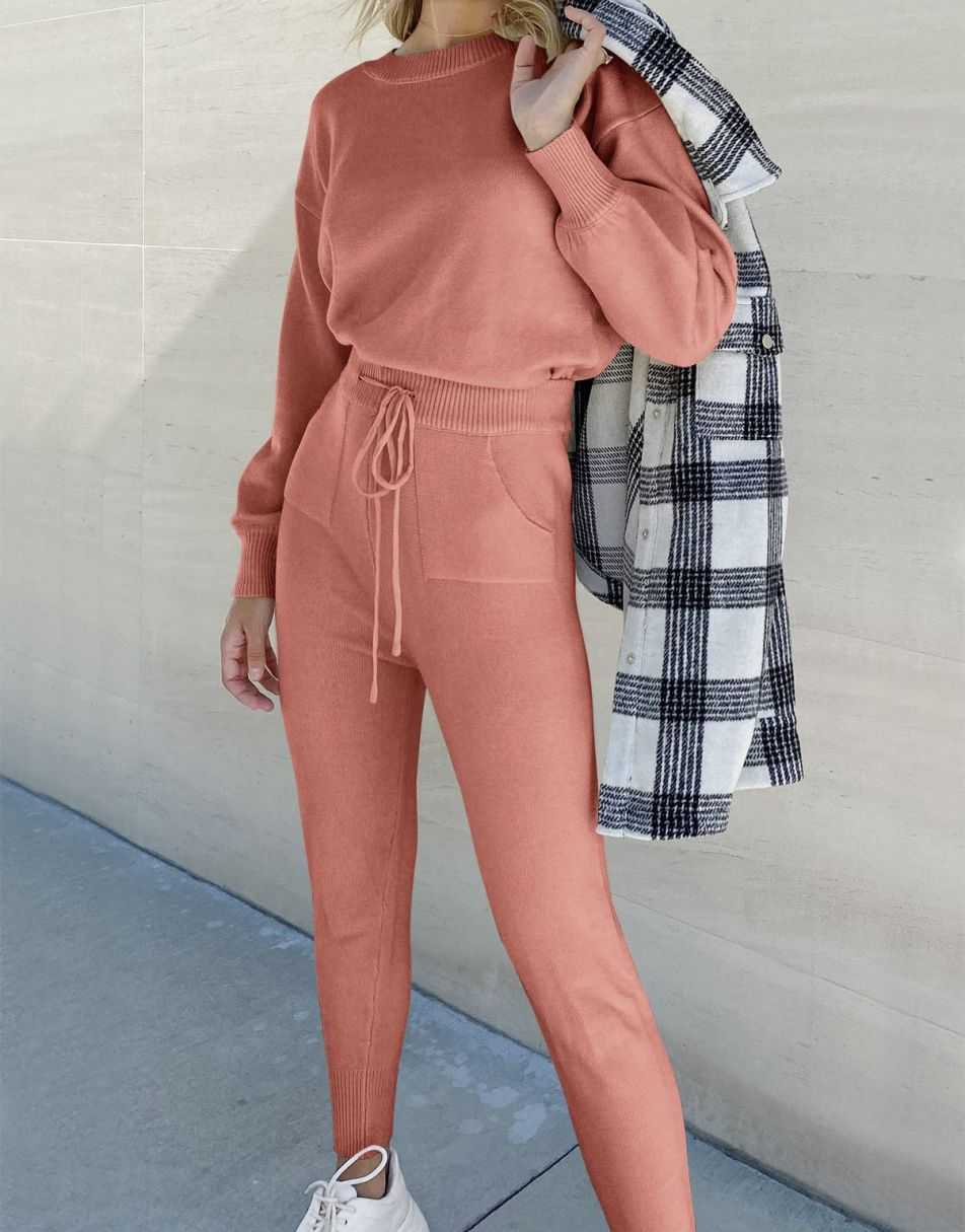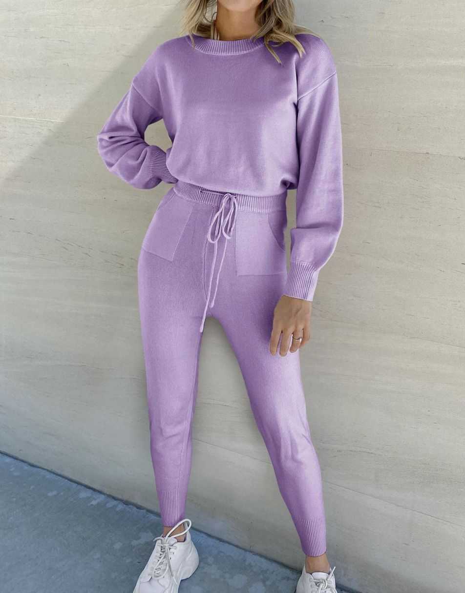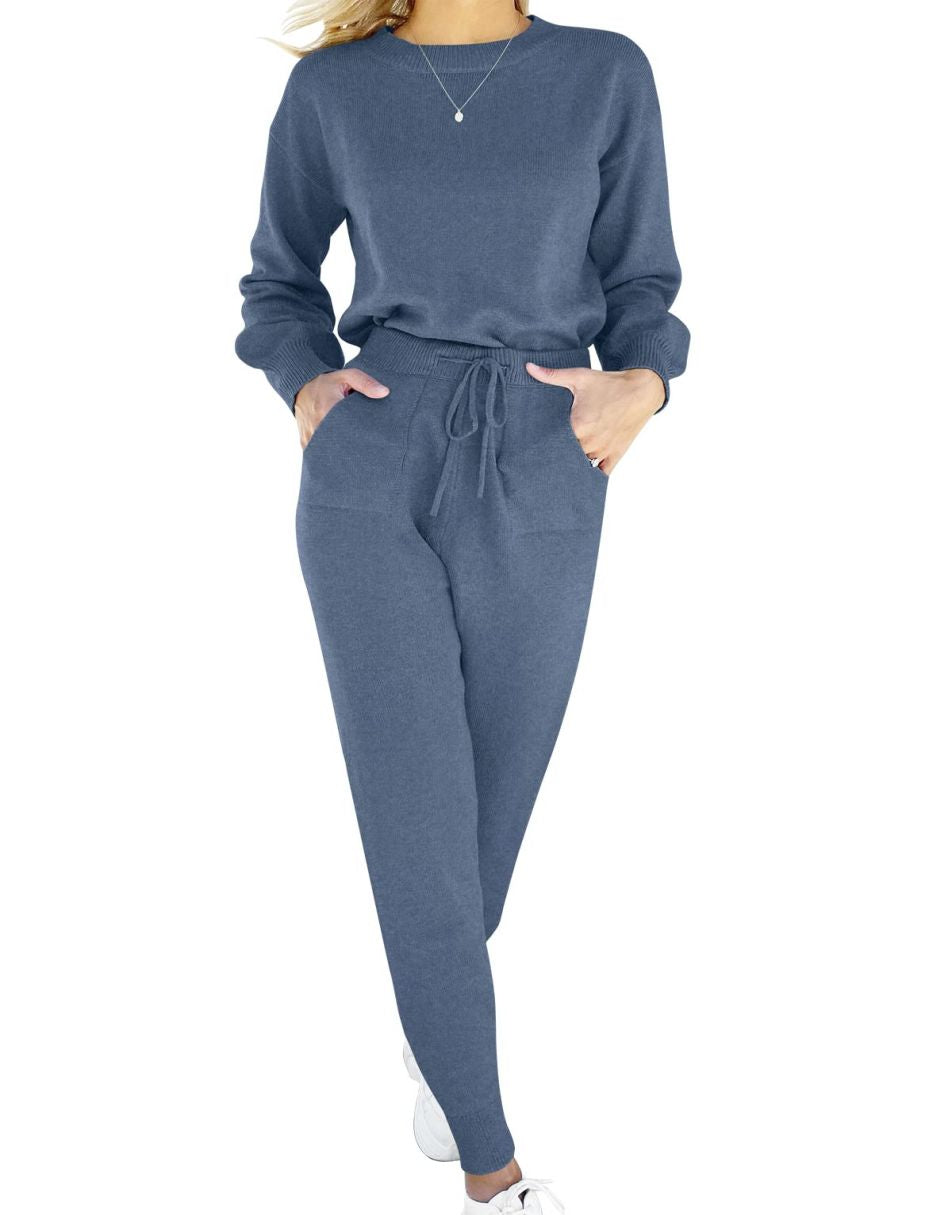 • STYLE: Two-piece set/long sleeve pullover tops/crew-neck/solid color/drawstring high waist pants/beam foot