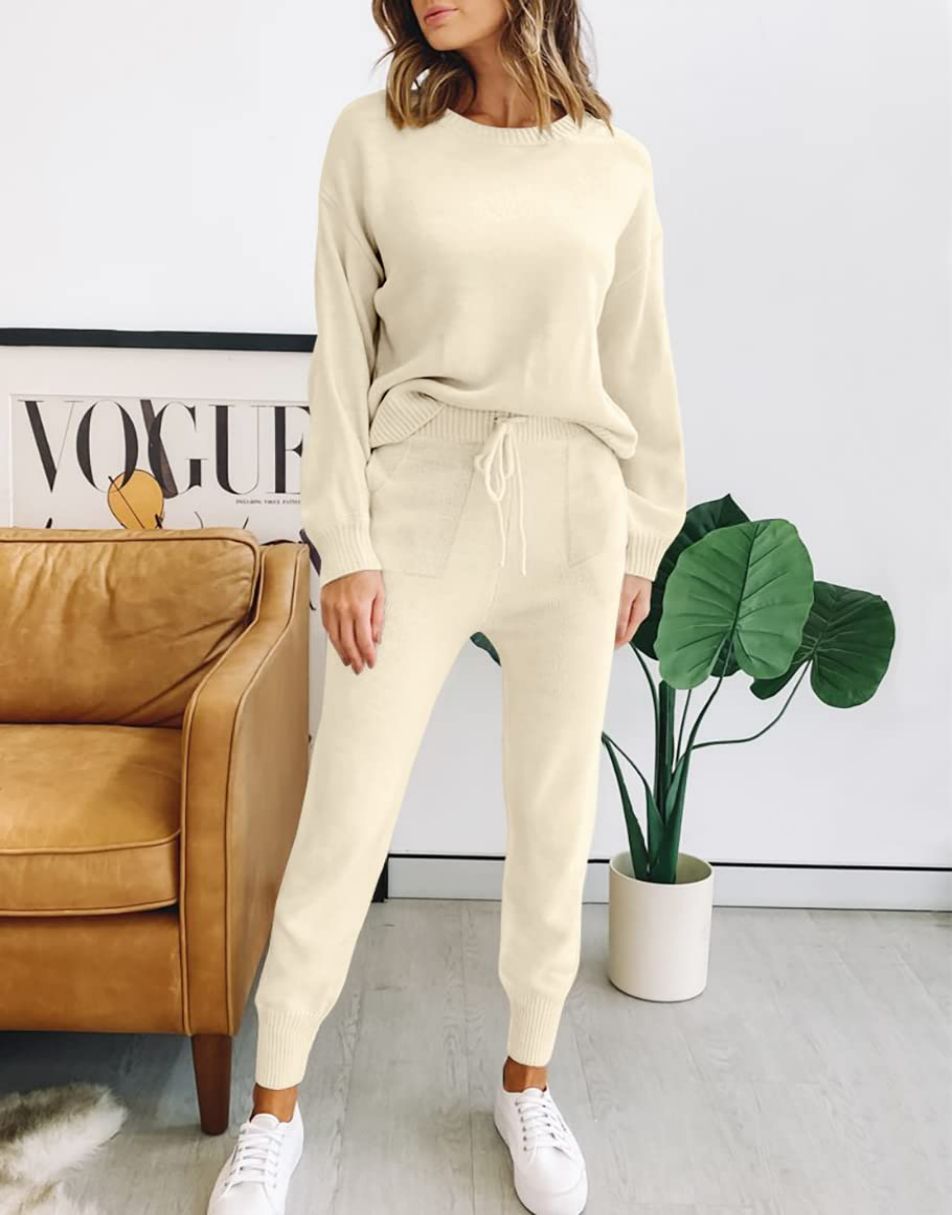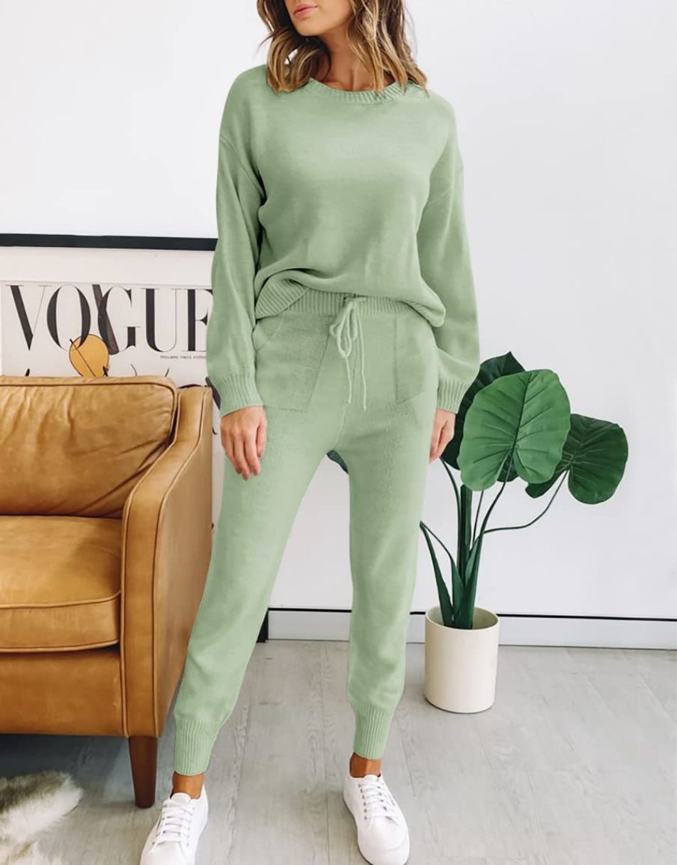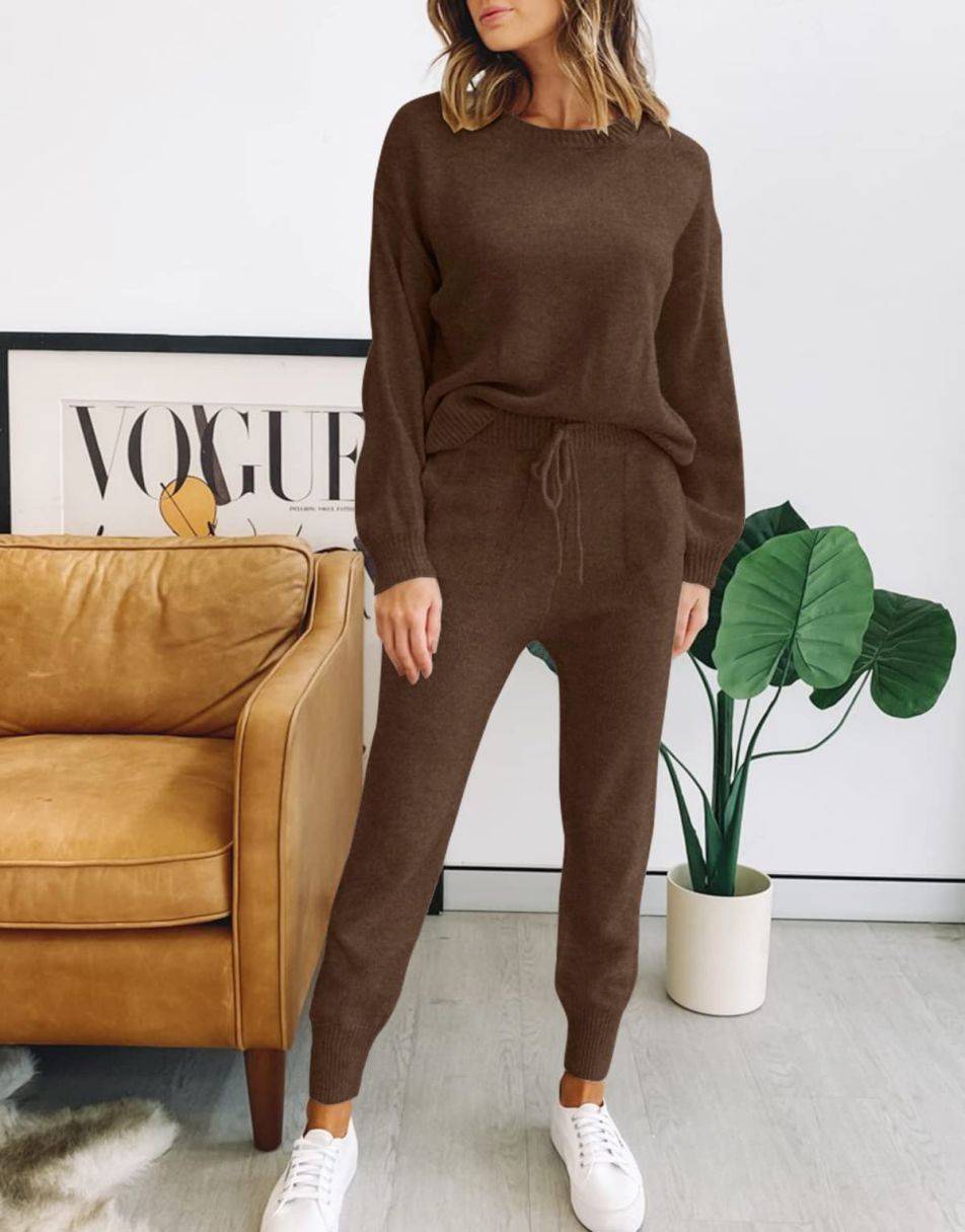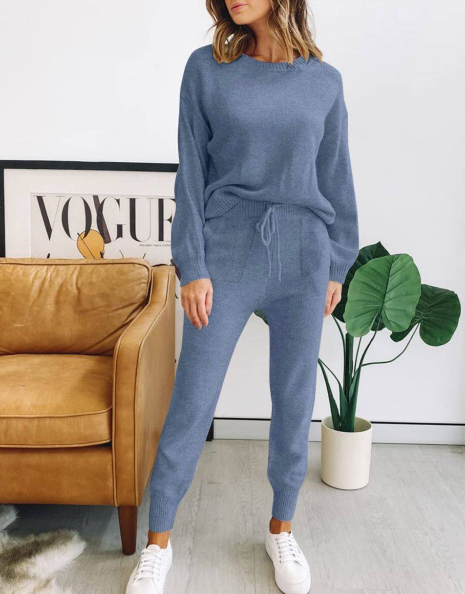 • STYLE: Two-piece set/long sleeve pullover tops/crew-neck/solid color/drawstring high waist pants/beam foot