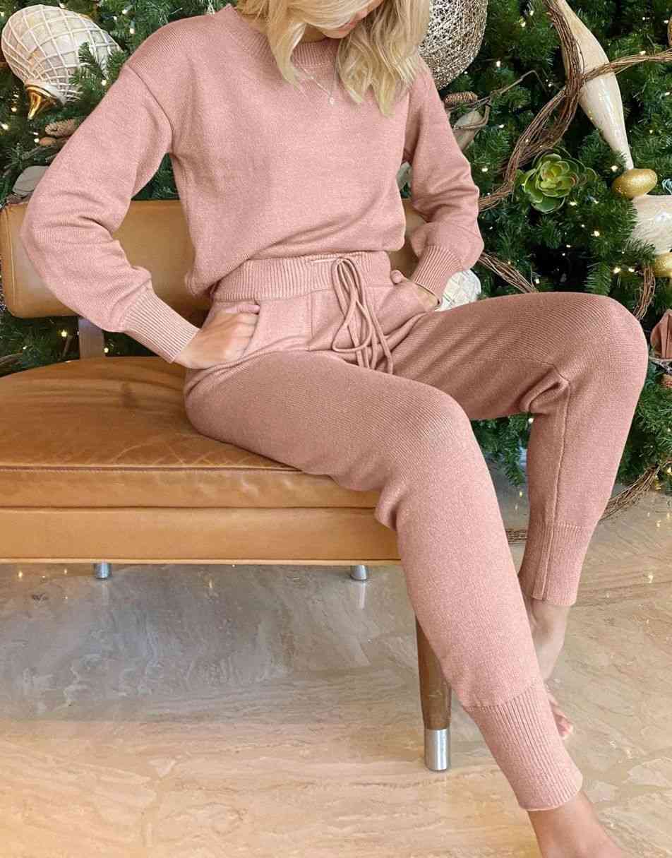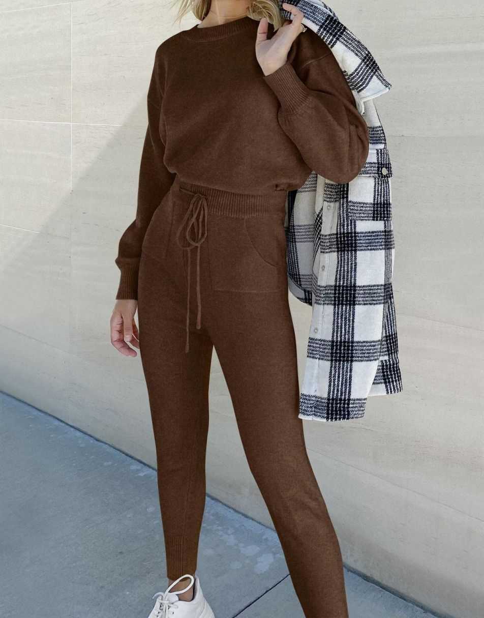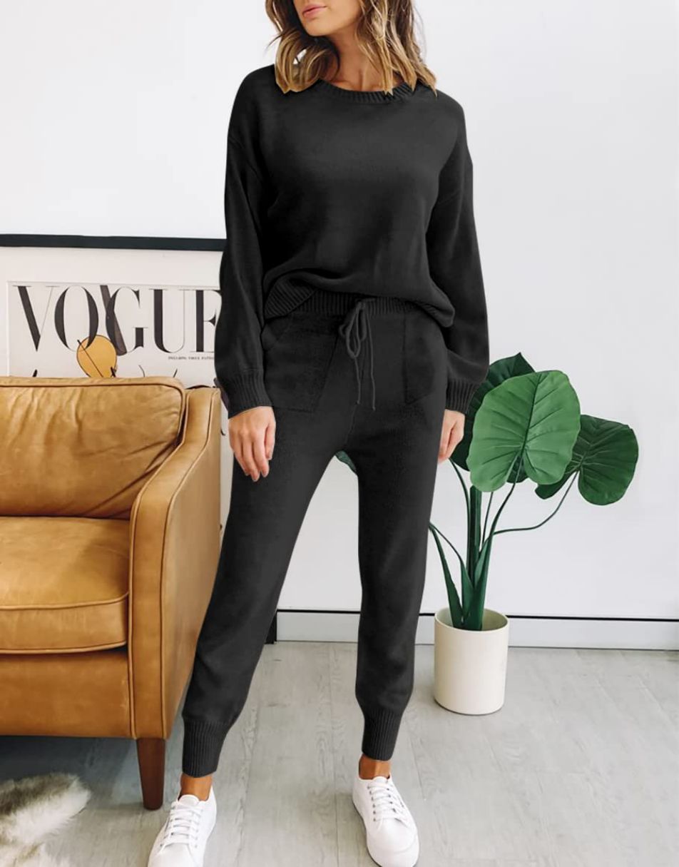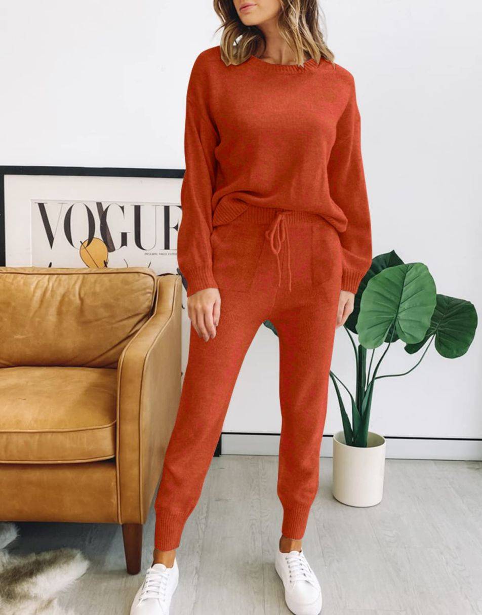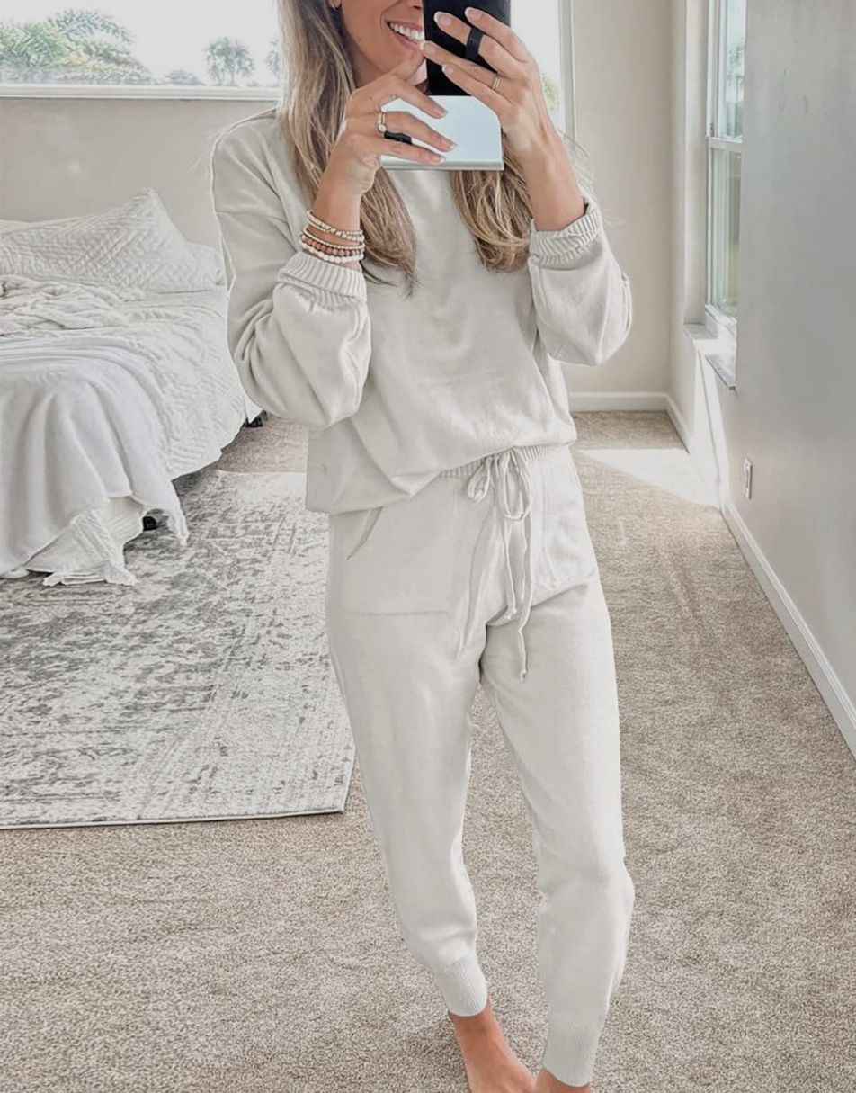 • STYLE: Two-piece set/long sleeve pullover tops/crew-neck/solid color/drawstring high waist pants/beam foot