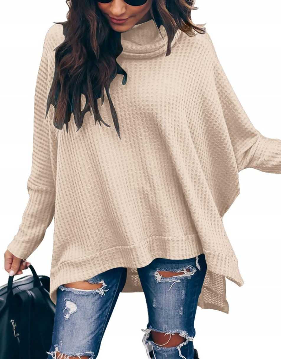 Anrabess Turtleneck Hem Side Slit Waffle Knit Oversized Sweater