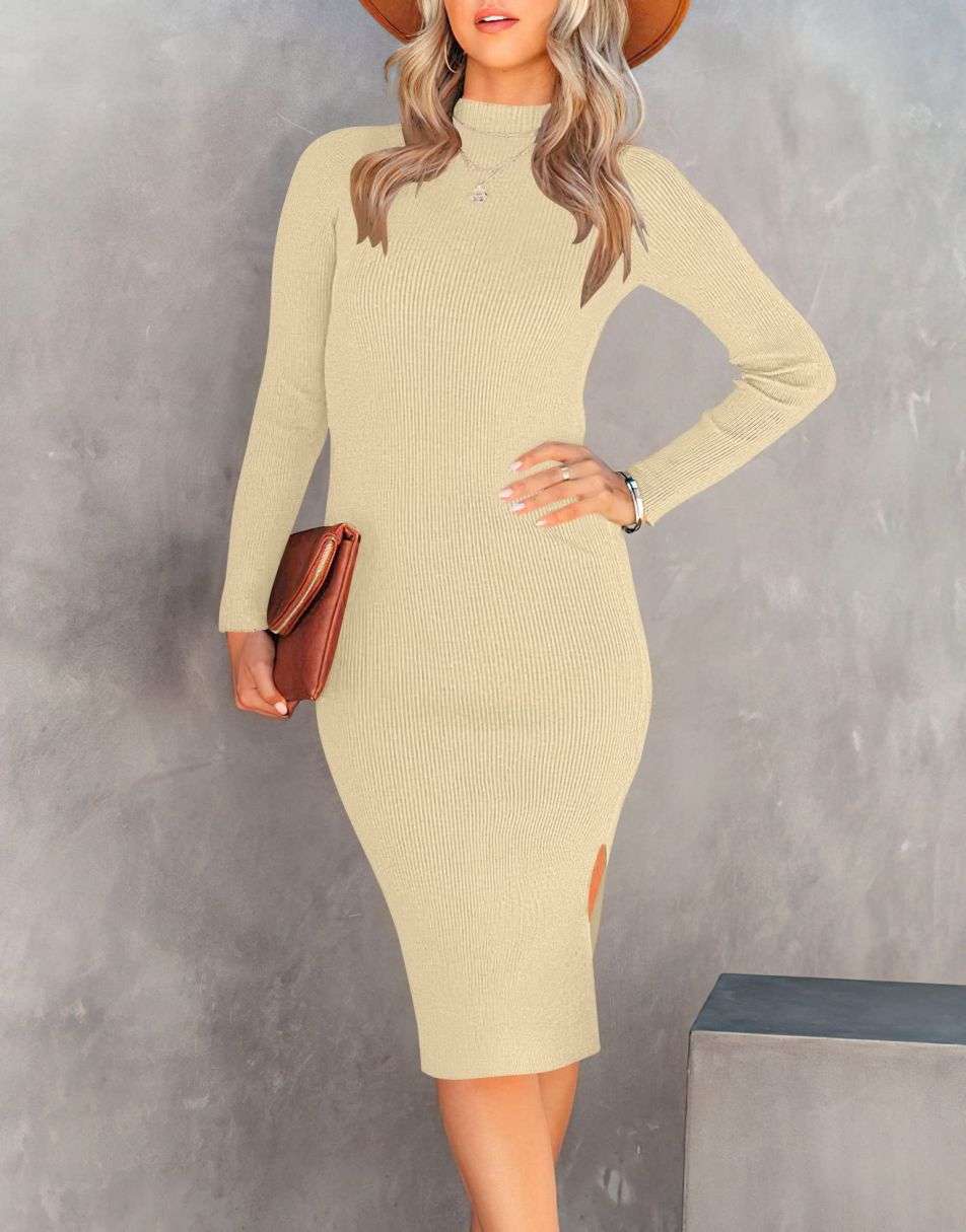 Anrabess Long Sleeve Ribbed Sweater Slim Fit Slit Midi Dress