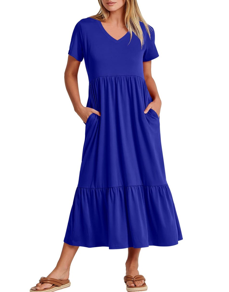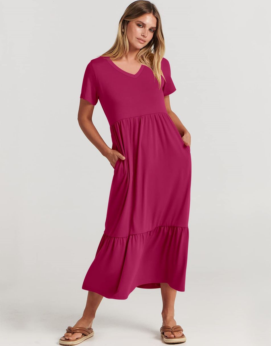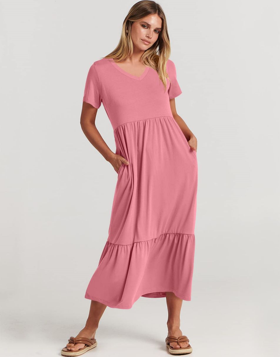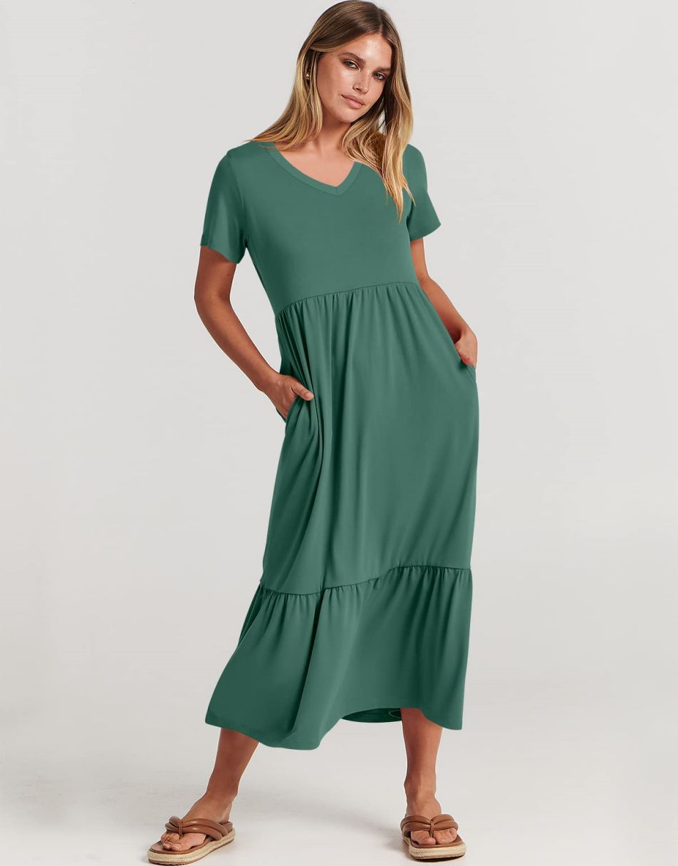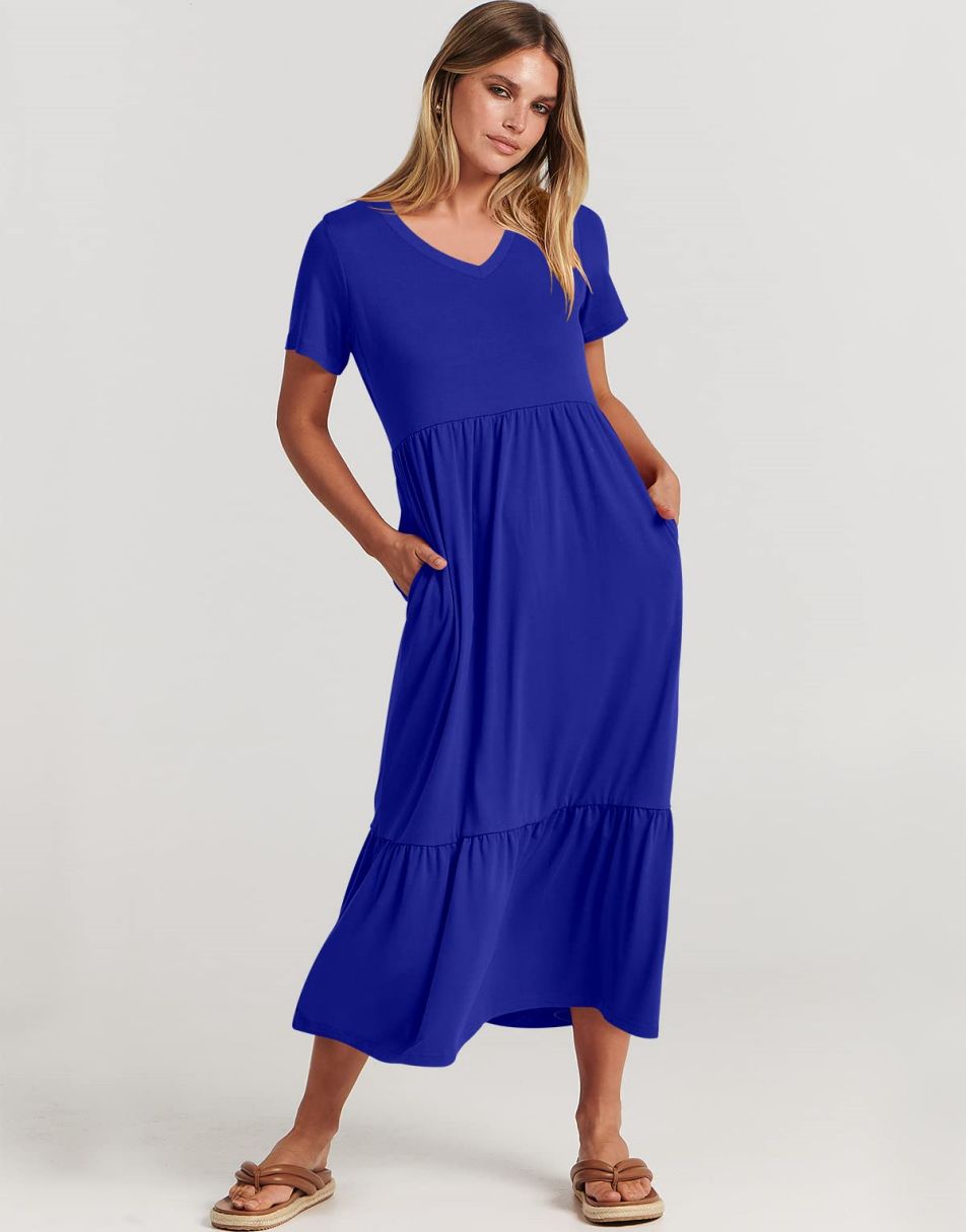 - features - short sleeve,V neck,maxi dress,tiered flowy skirt,basic cute beach dress with pockets.