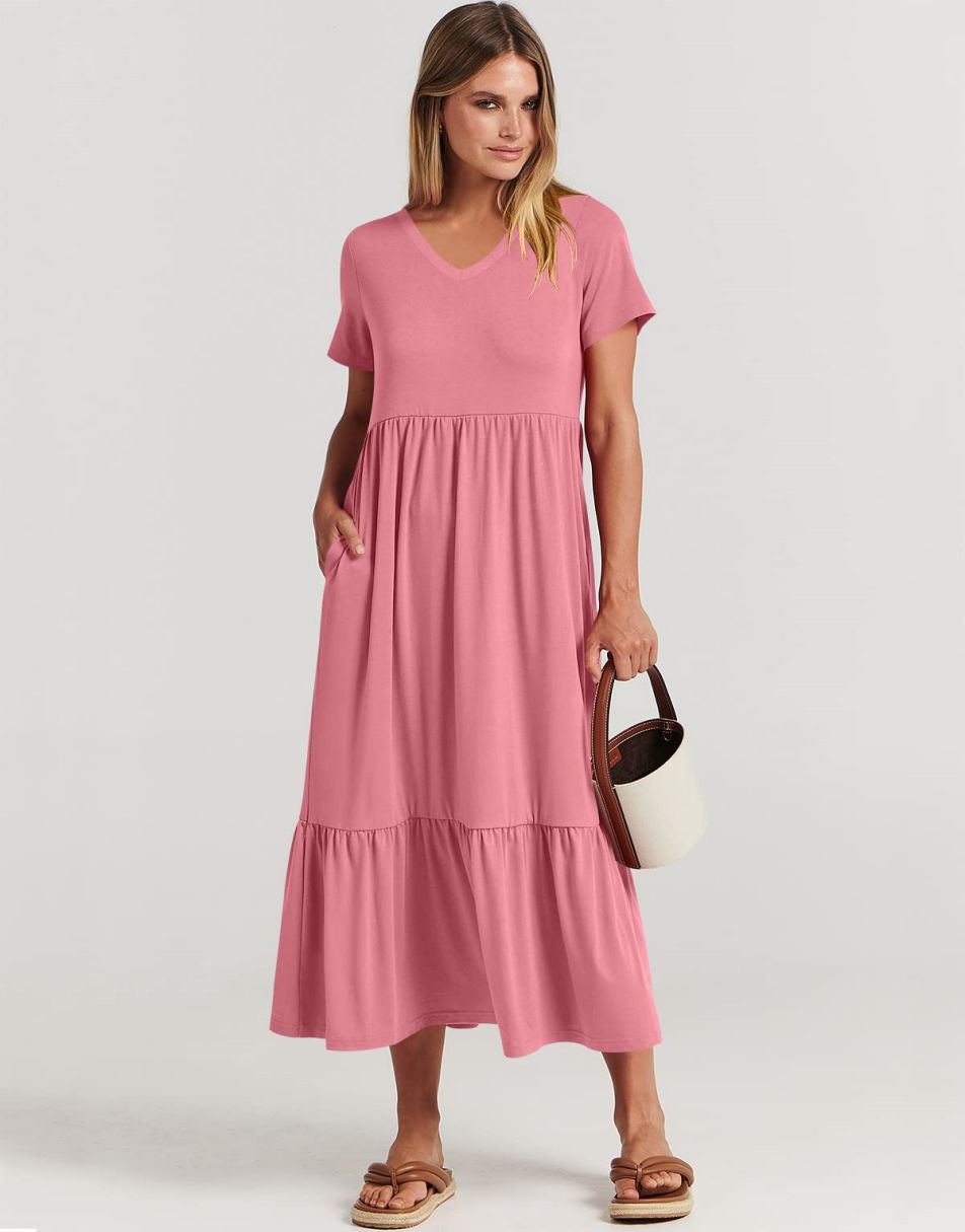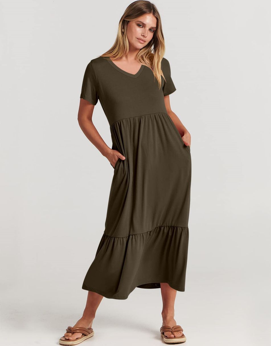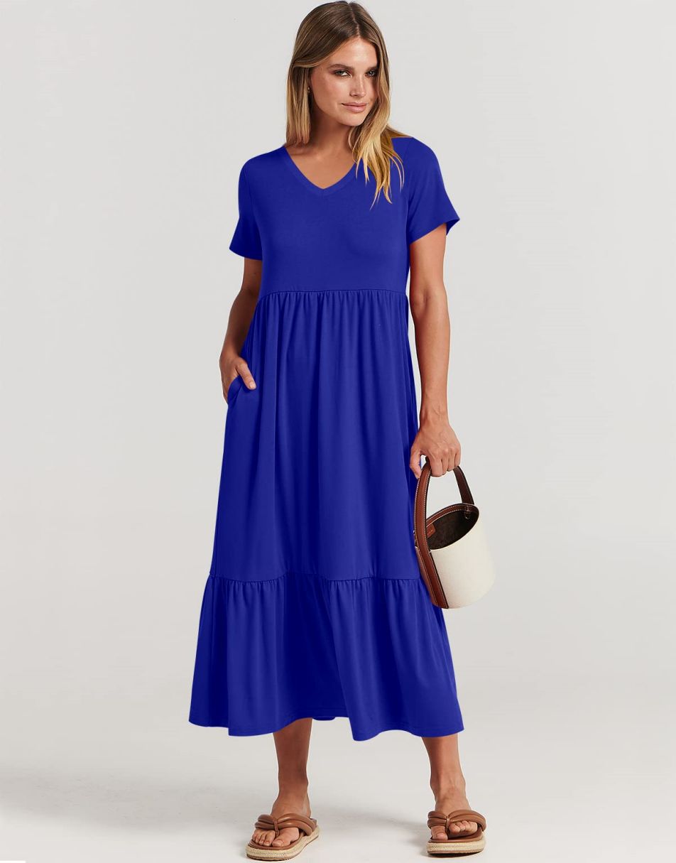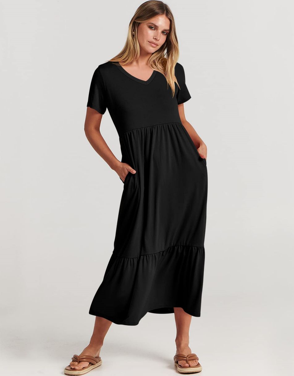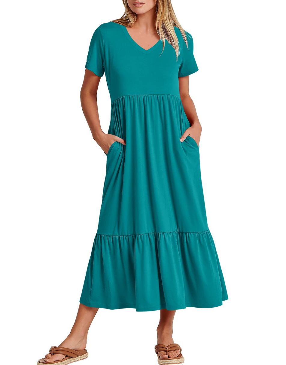 - features - short sleeve,V neck,maxi dress,tiered flowy skirt,basic cute beach dress with pockets.