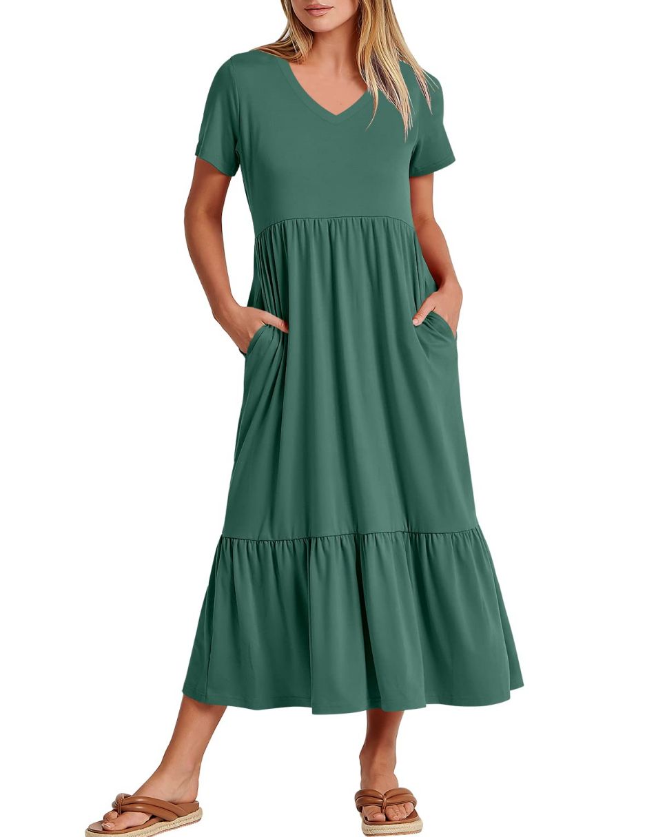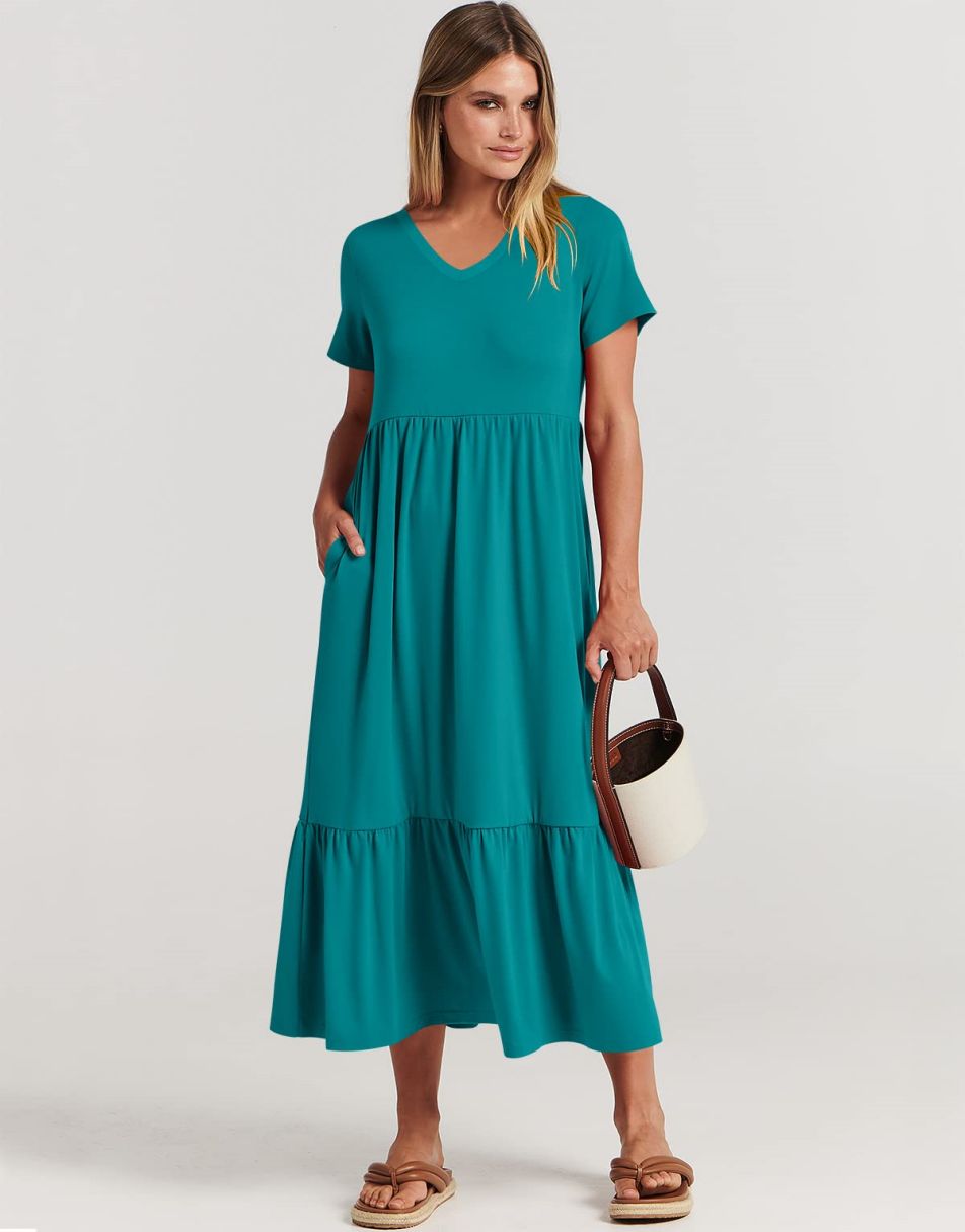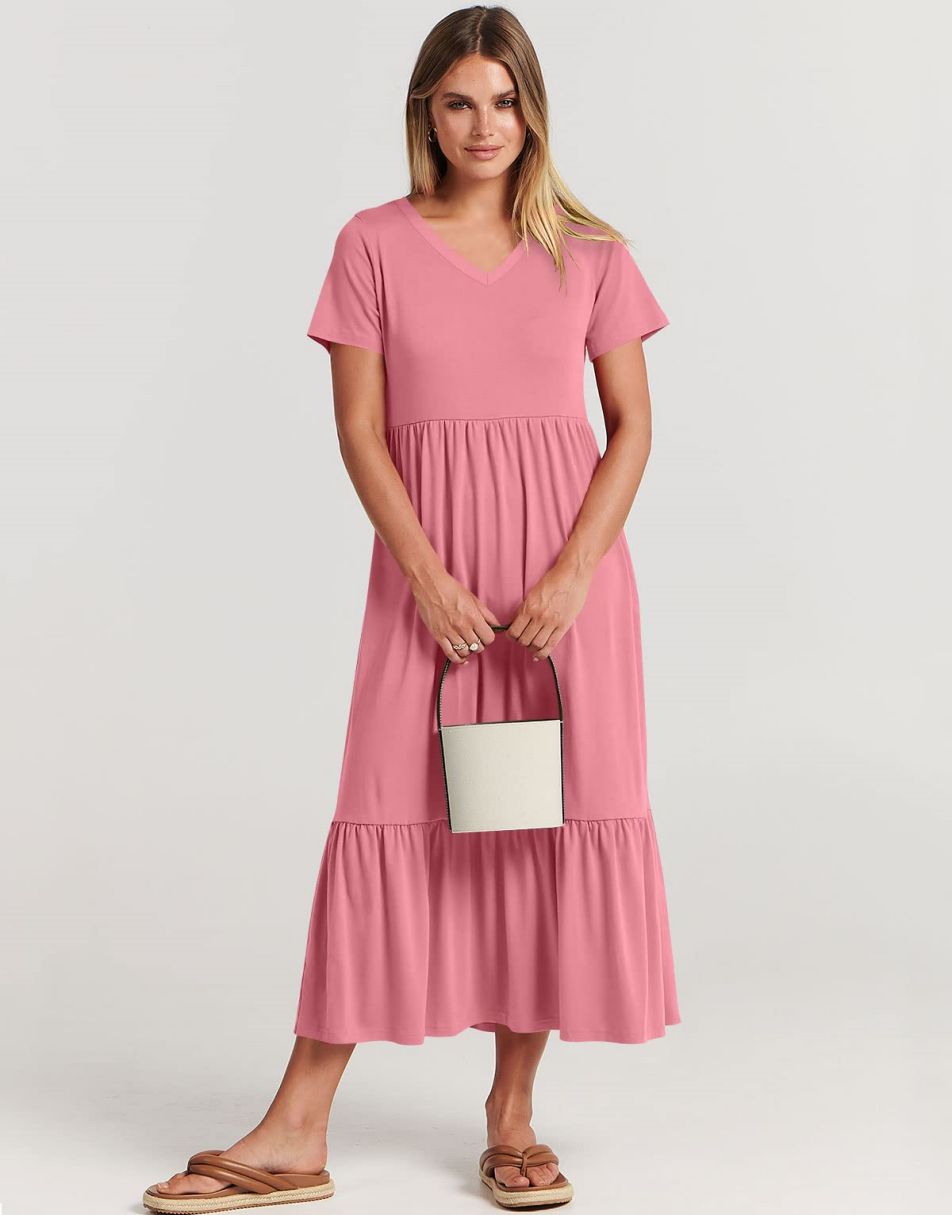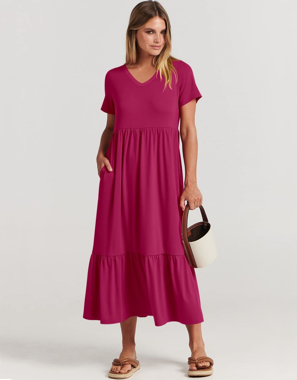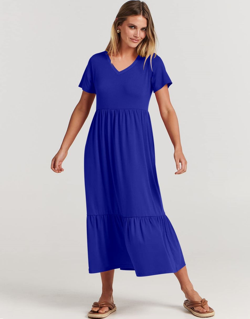 - features - short sleeve,V neck,maxi dress,tiered flowy skirt,basic cute beach dress with pockets.