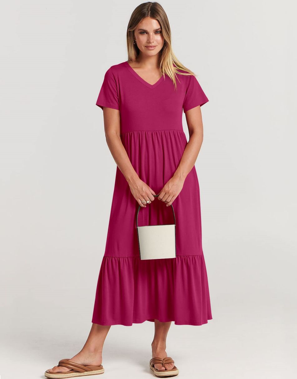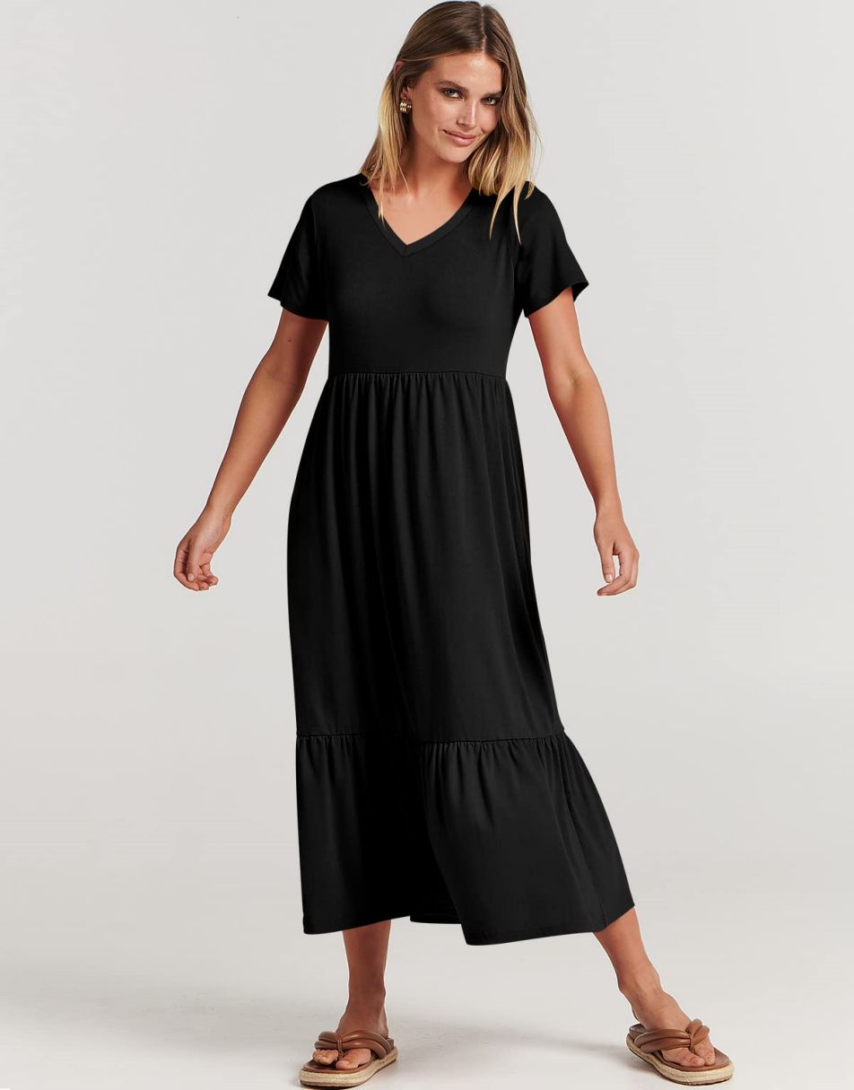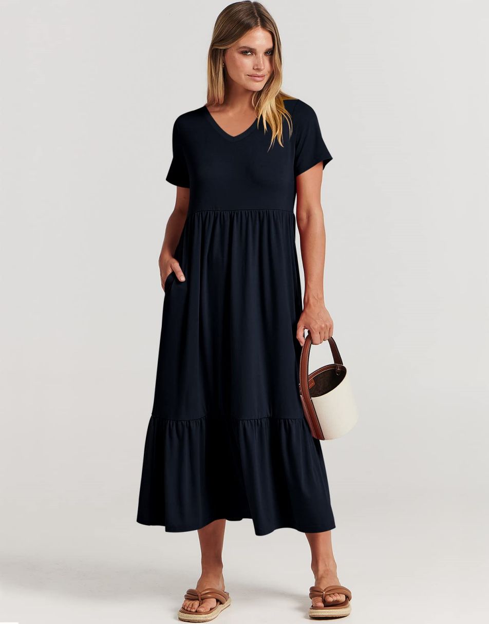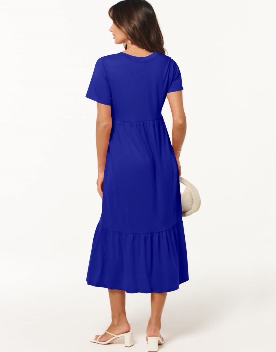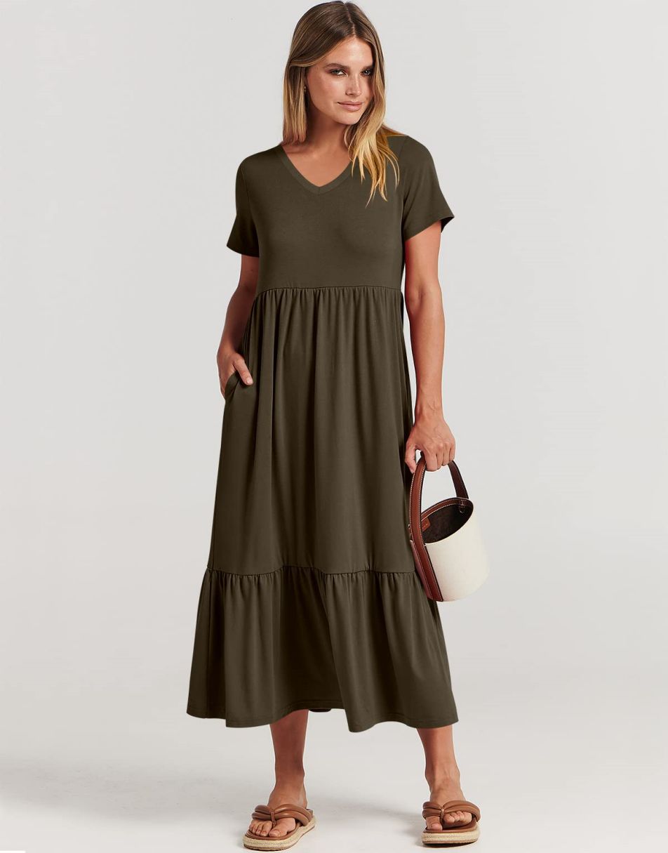 - features - short sleeve,V neck,maxi dress,tiered flowy skirt,basic cute beach dress with pockets.