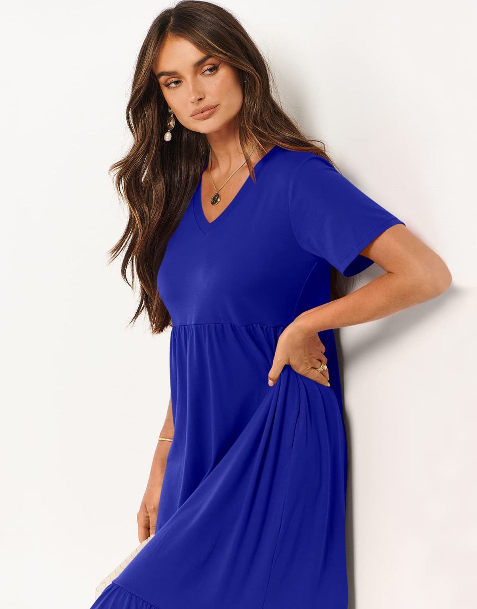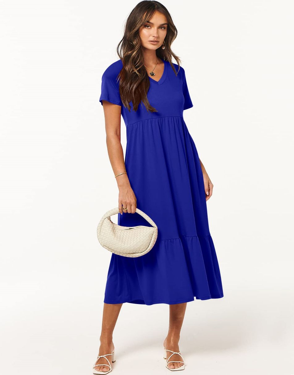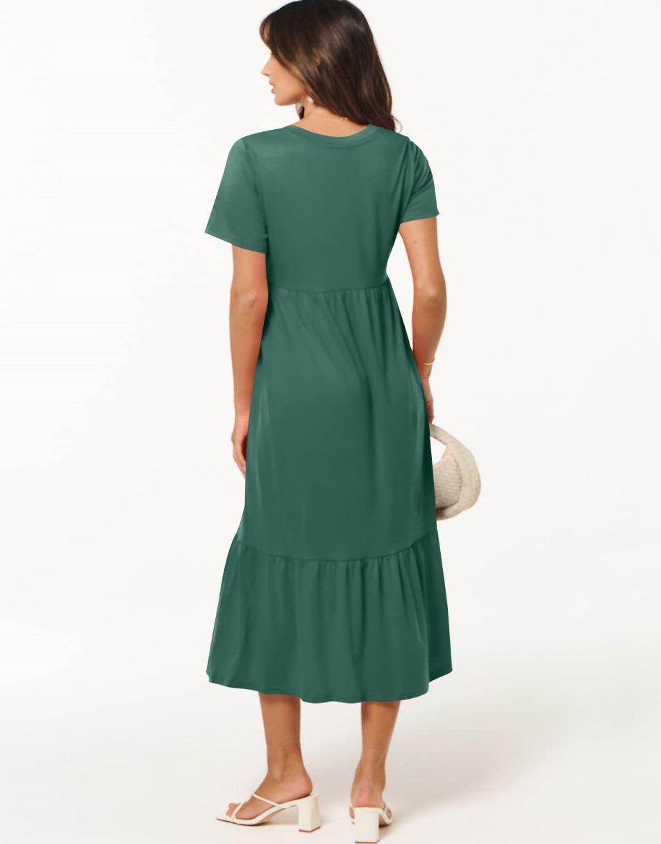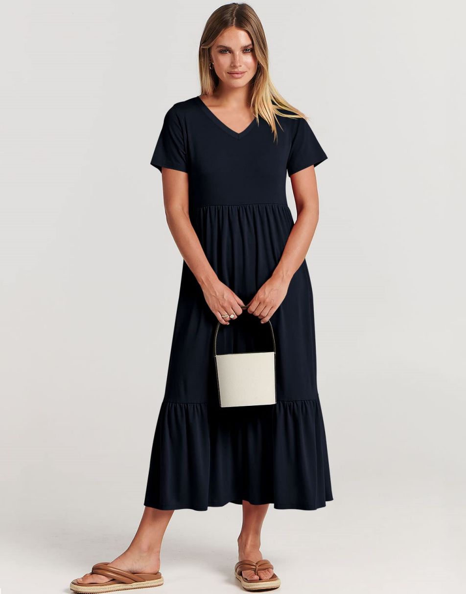 - features - short sleeve,V neck,maxi dress,tiered flowy skirt,basic cute beach dress with pockets.