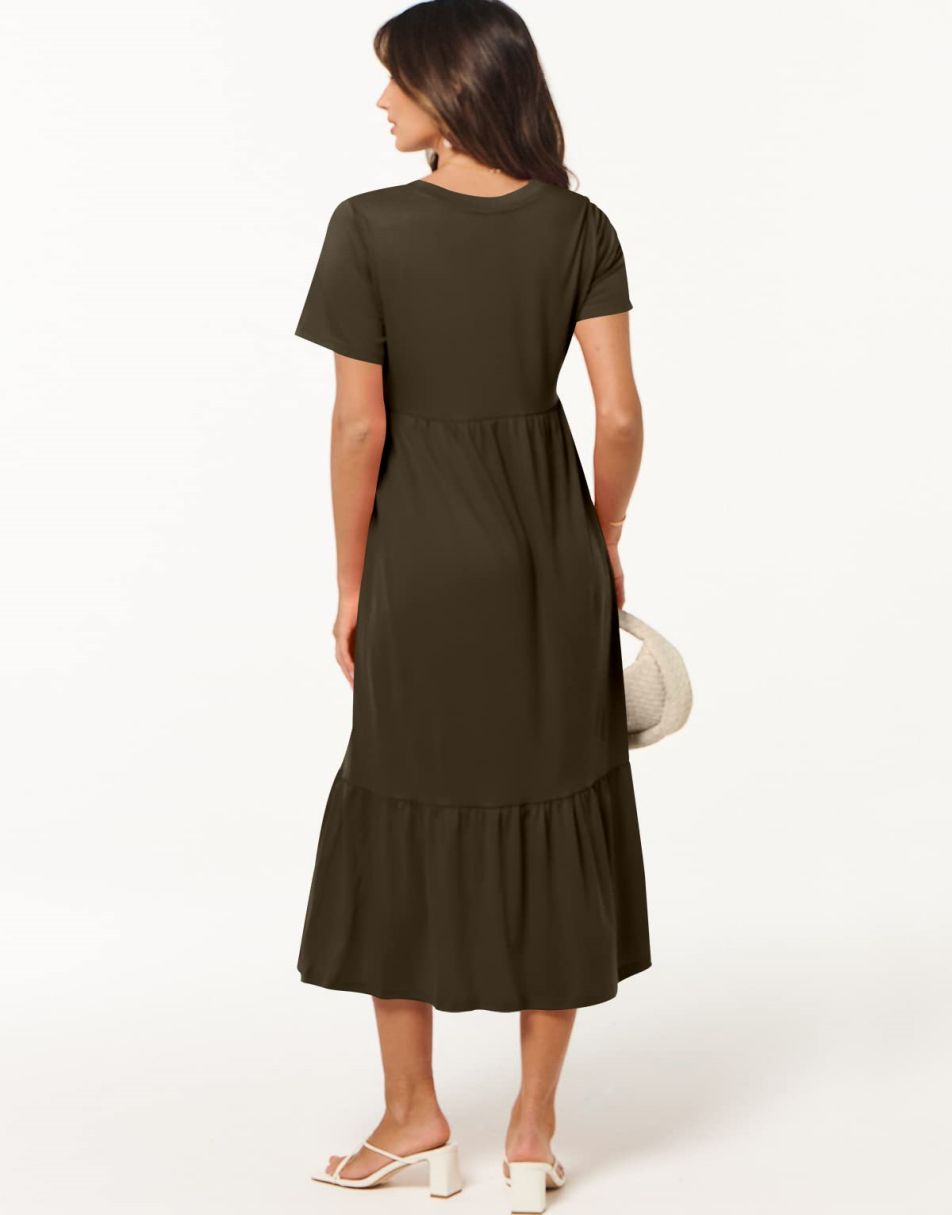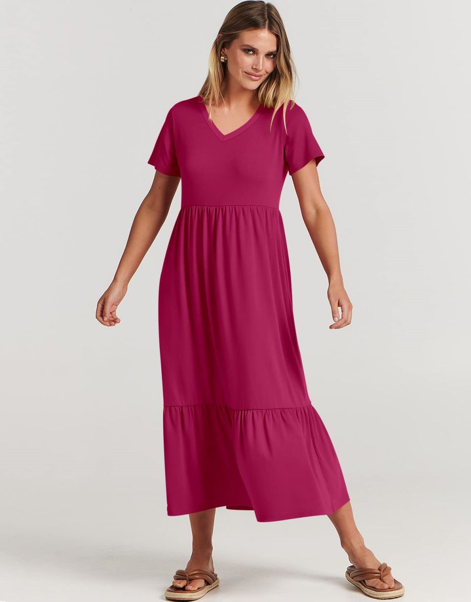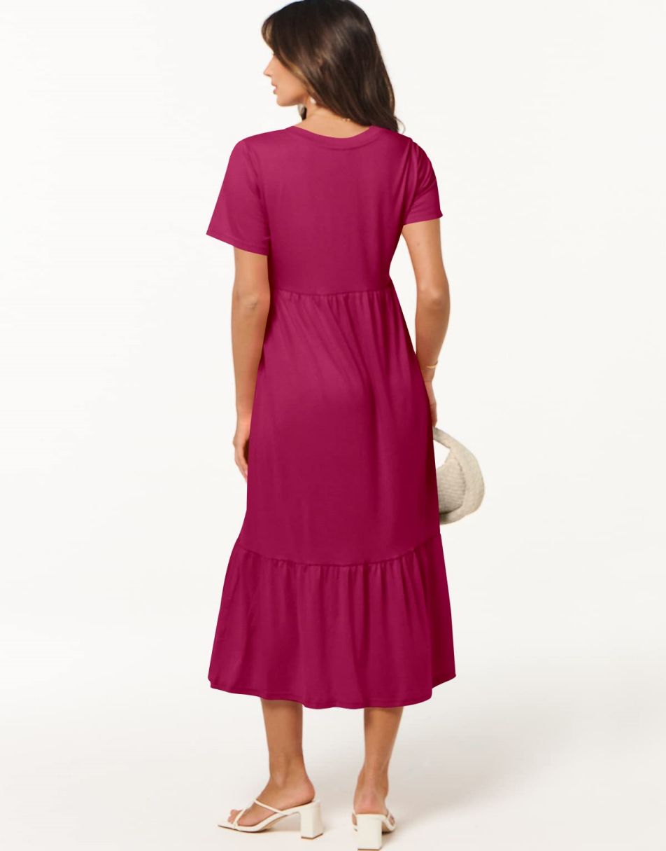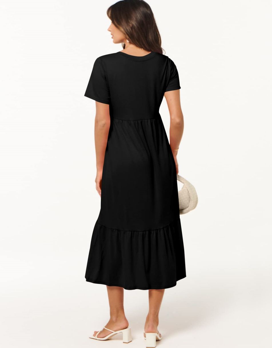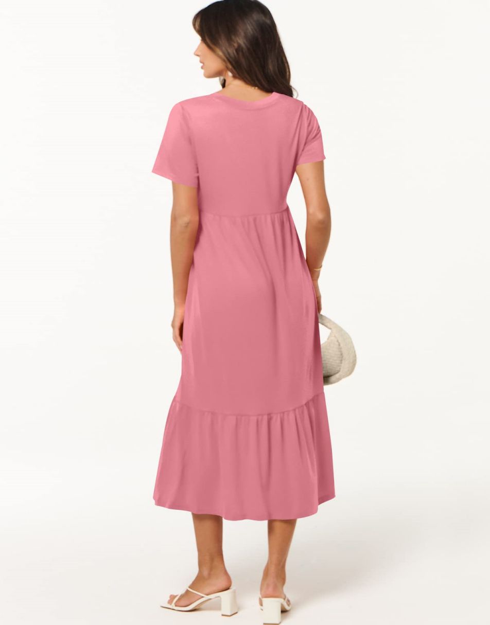 - features - short sleeve,V neck,maxi dress,tiered flowy skirt,basic cute beach dress with pockets.