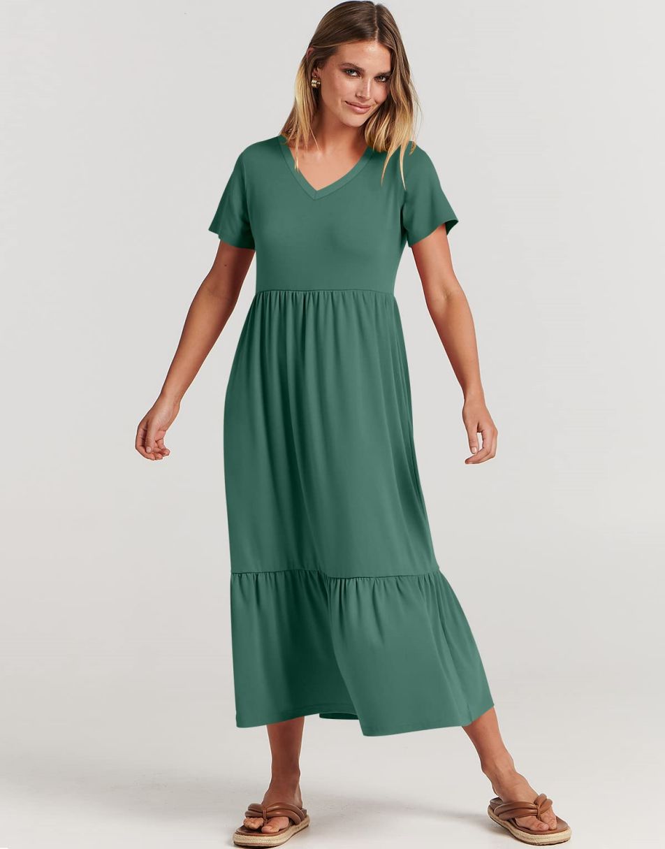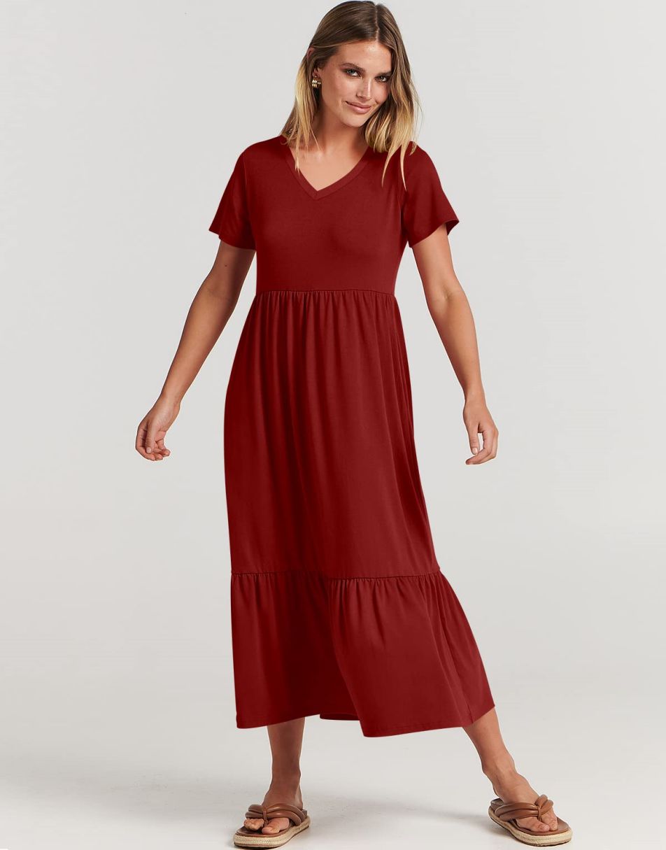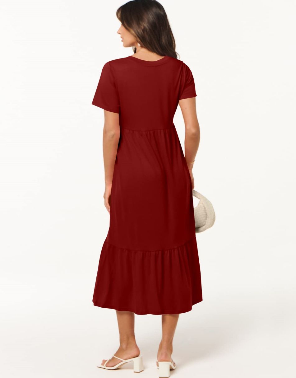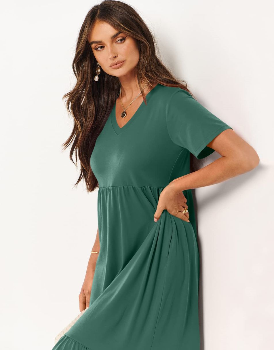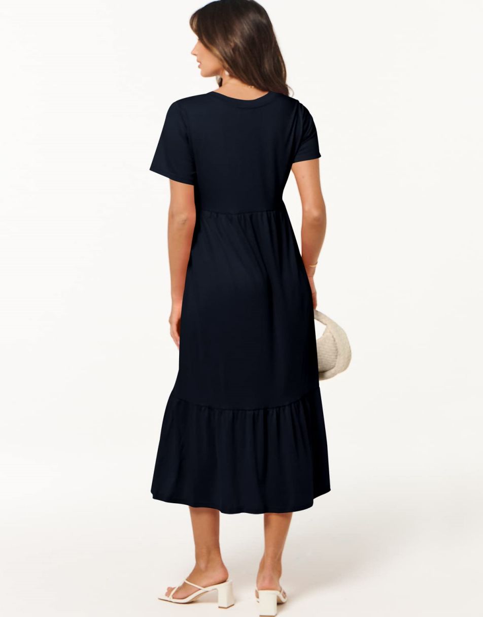 - features - short sleeve,V neck,maxi dress,tiered flowy skirt,basic cute beach dress with pockets.