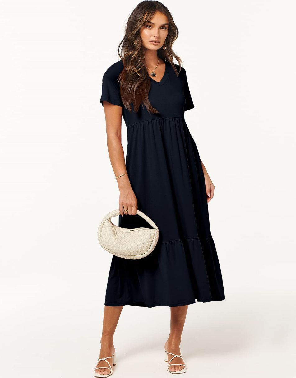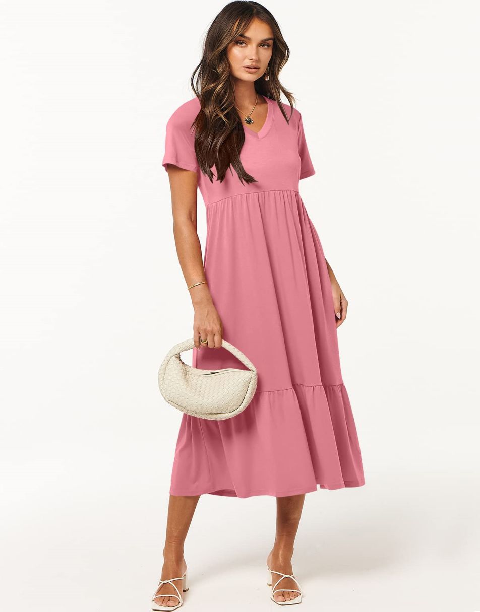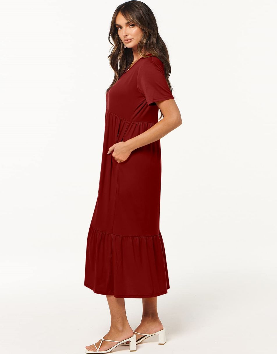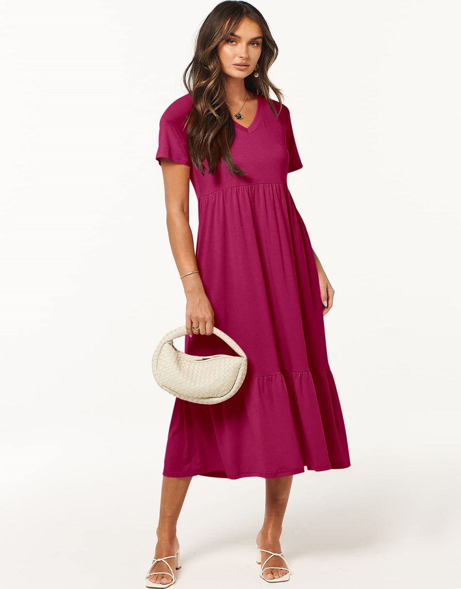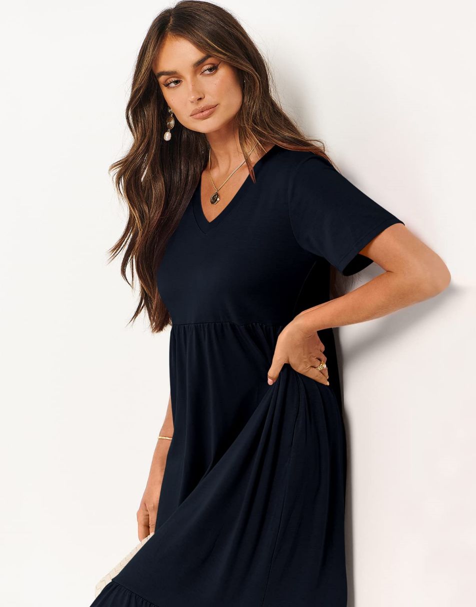 - features - short sleeve,V neck,maxi dress,tiered flowy skirt,basic cute beach dress with pockets.