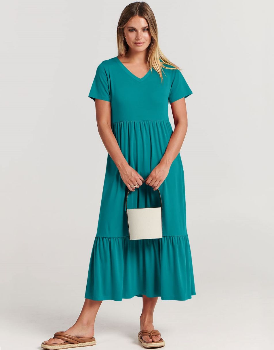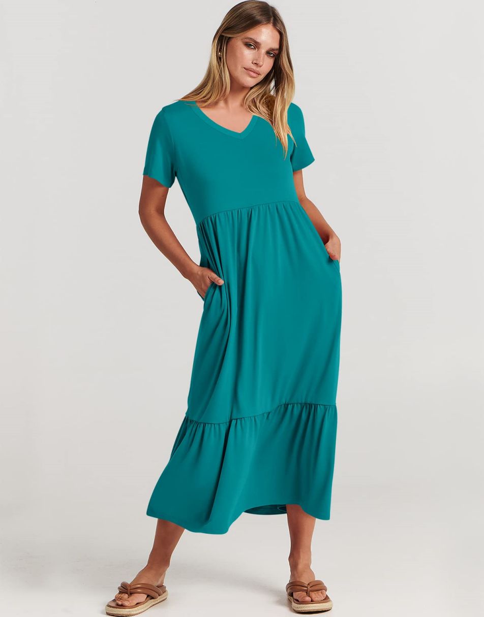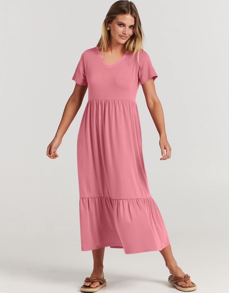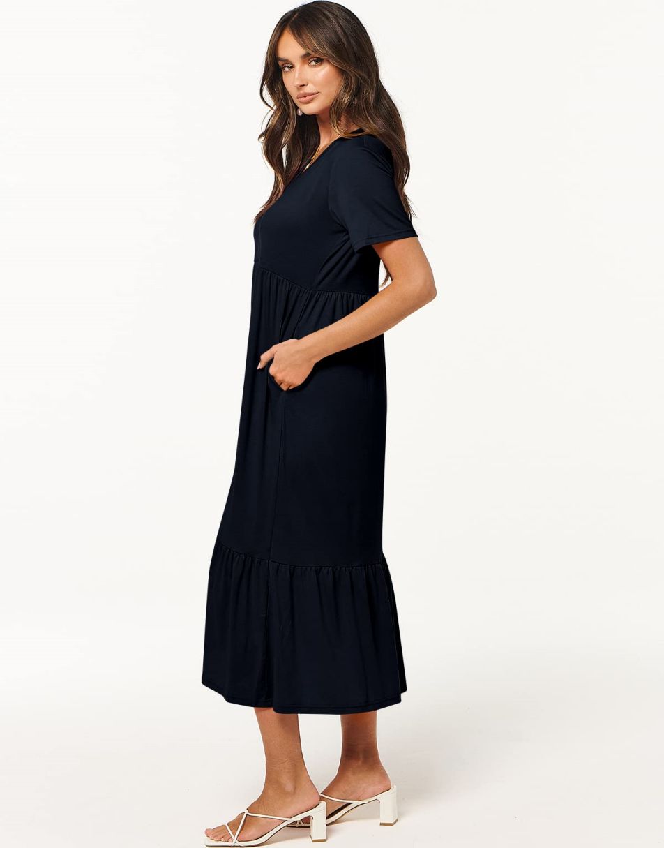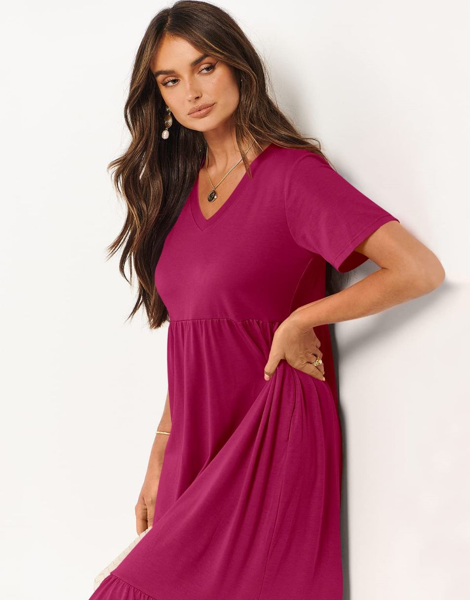 - features - short sleeve,V neck,maxi dress,tiered flowy skirt,basic cute beach dress with pockets.