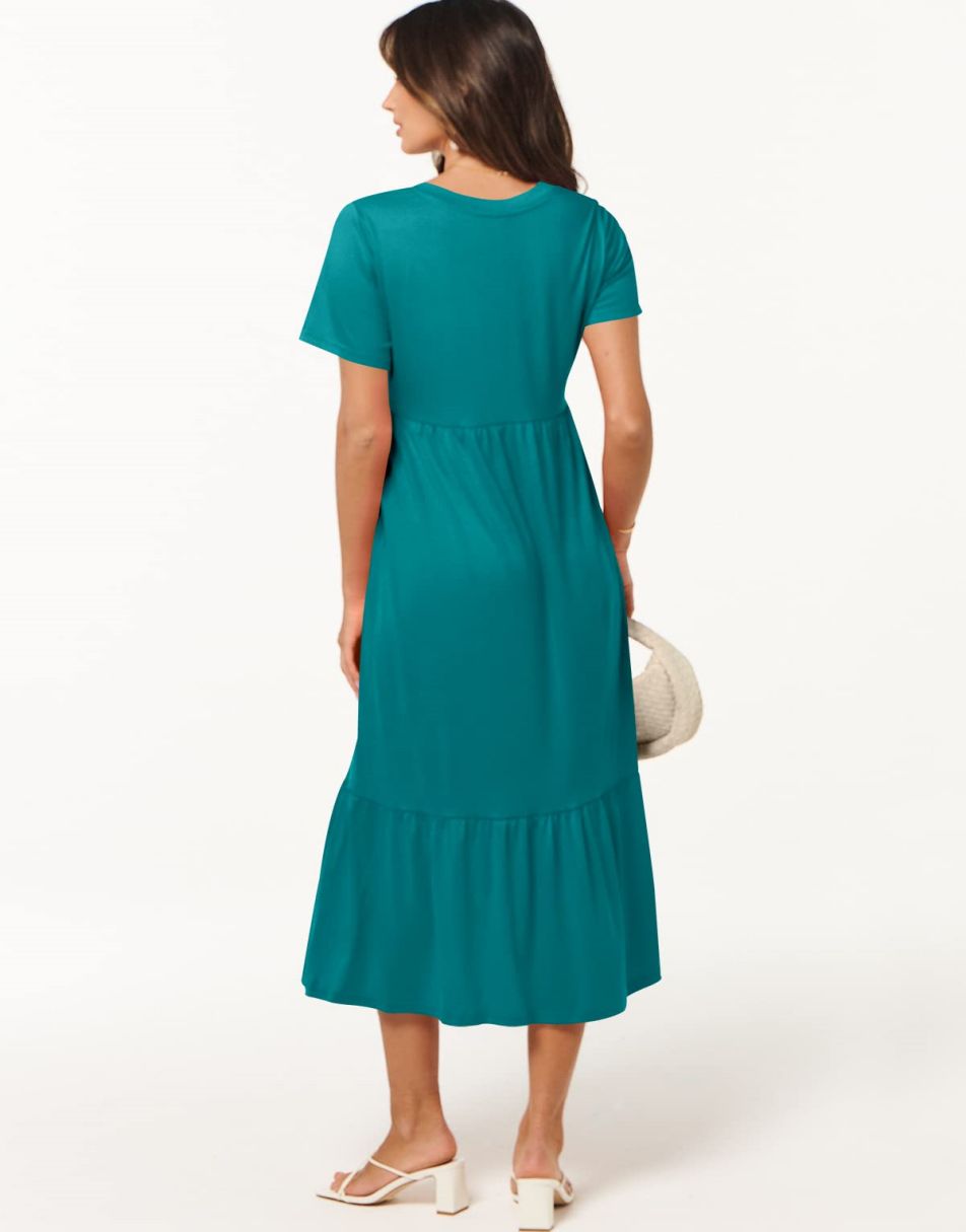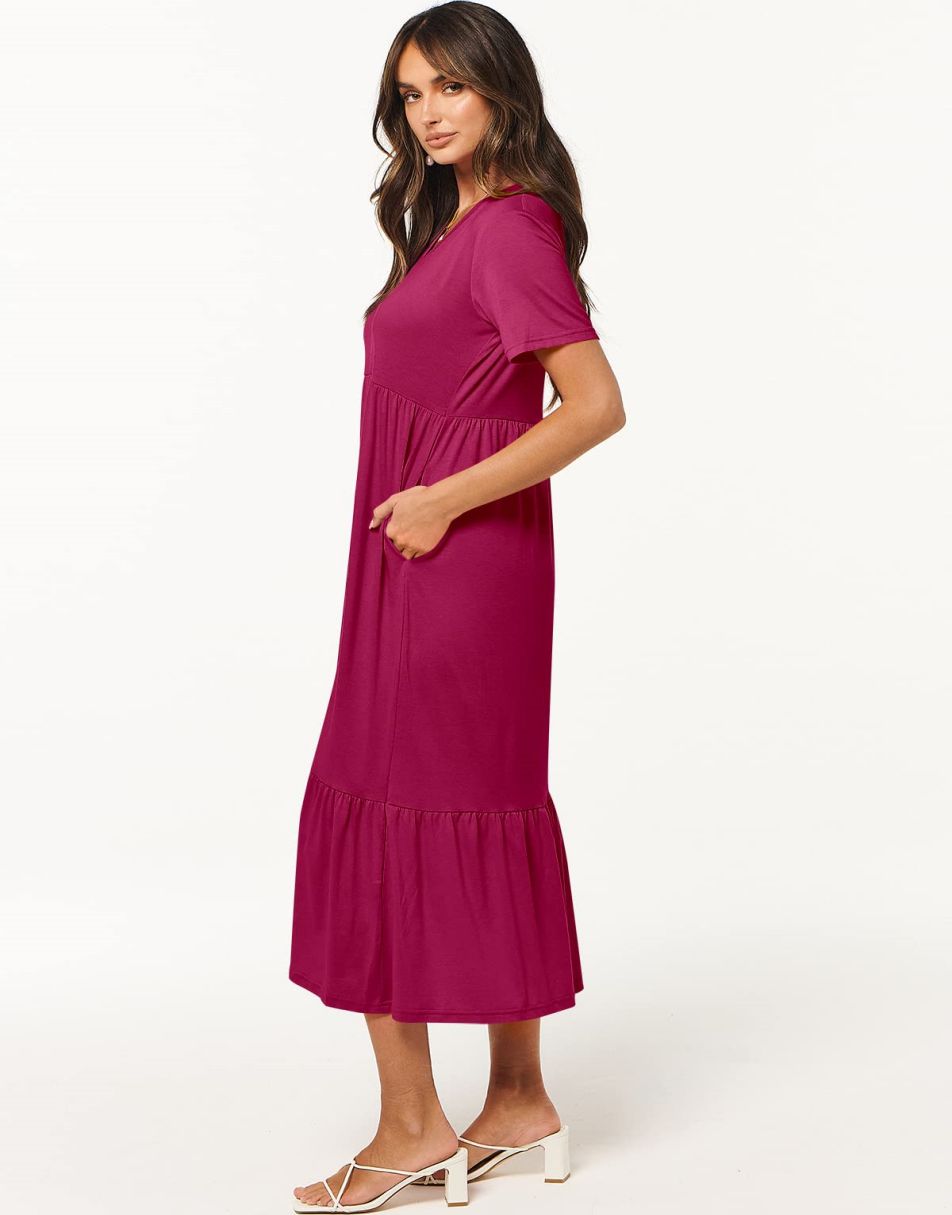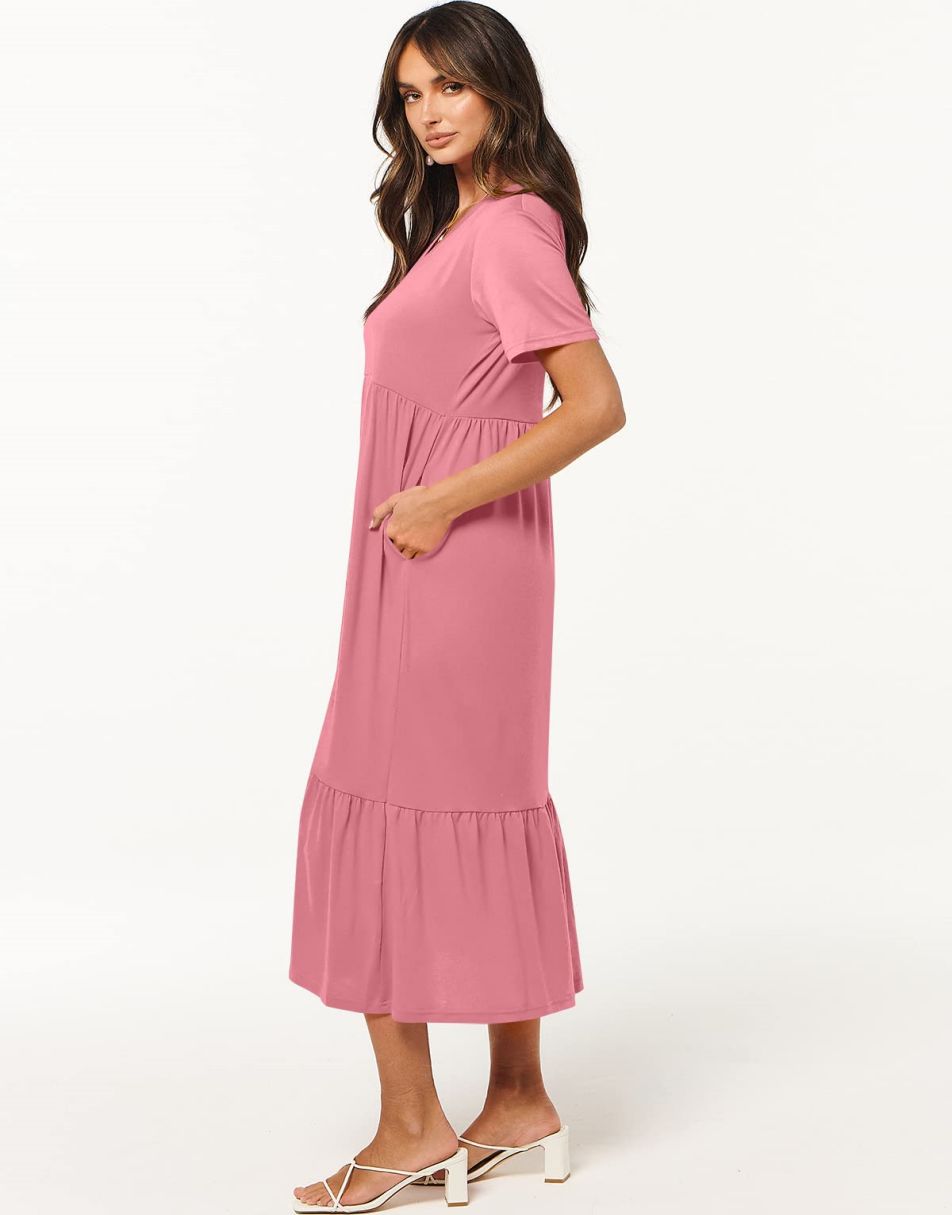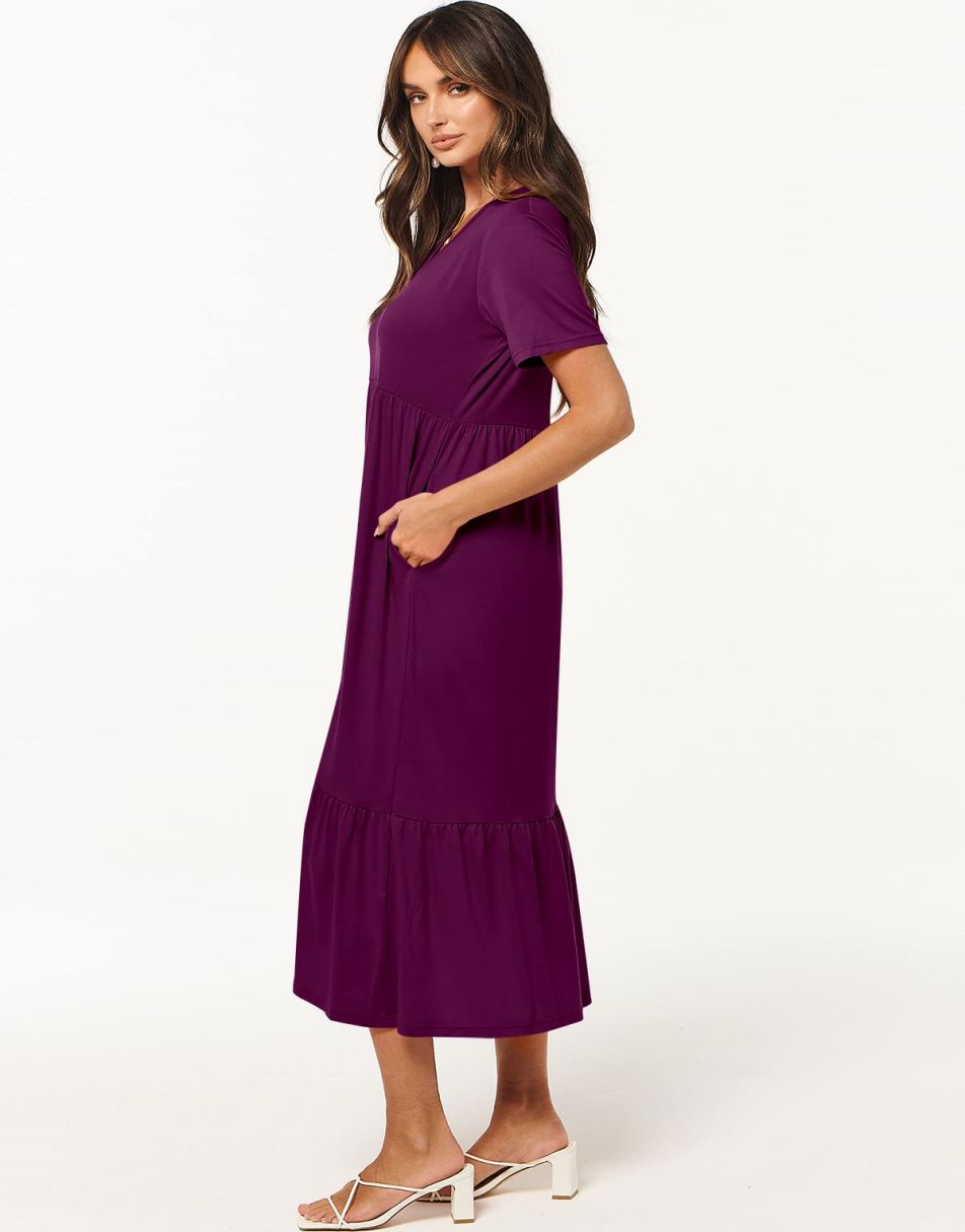 - Highlights - This Flowy long Dress With Cute tiered skirt ,flounces on the casual style and two handy side pockets,which are Perfect match for this dress.A nice simply dress for summer! Classic round neck, The midi length with tiered design makes the sundress less monotonous.