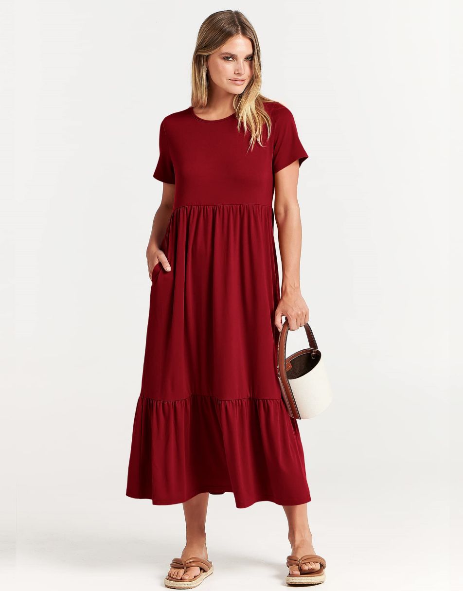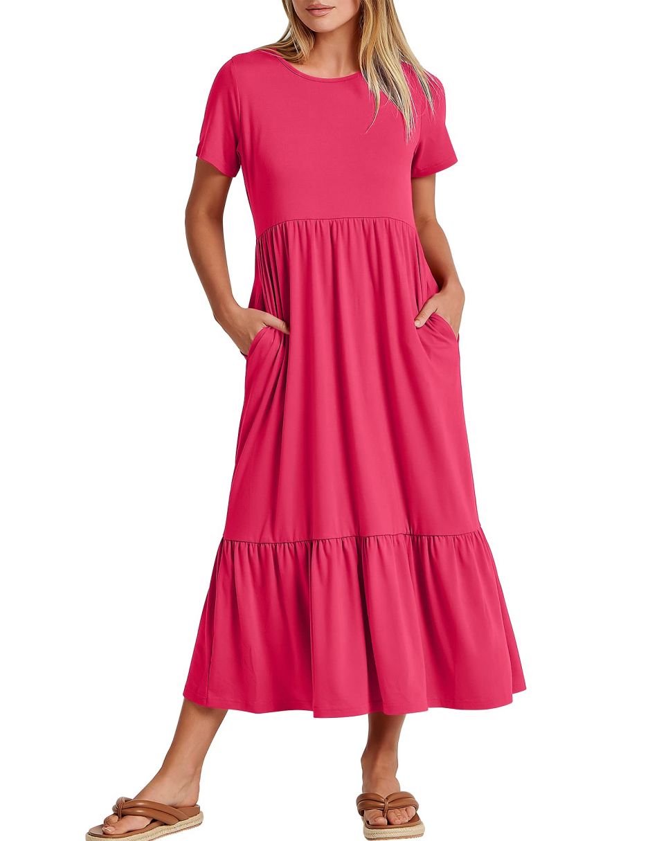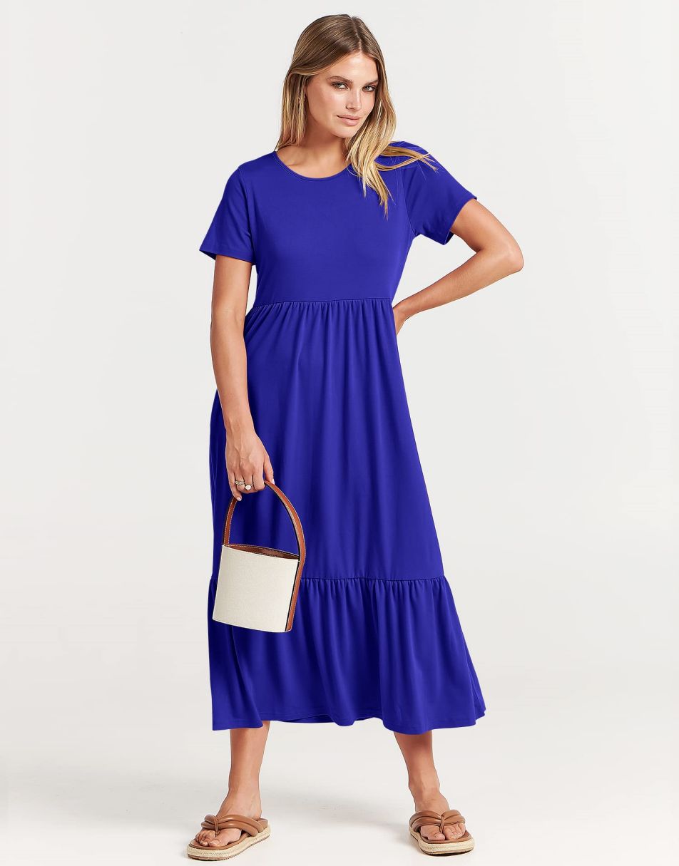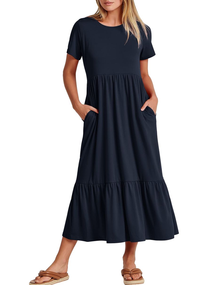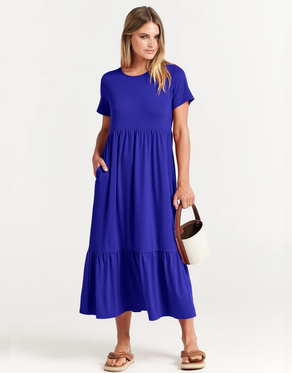 - features - short sleeve,crewneck,maxi dress,tiered flowy skirt,basic cute beach dress with pockets.