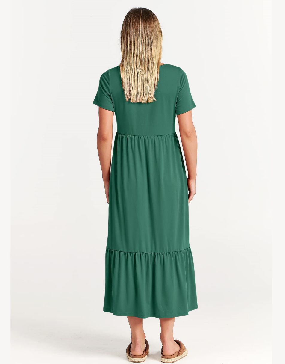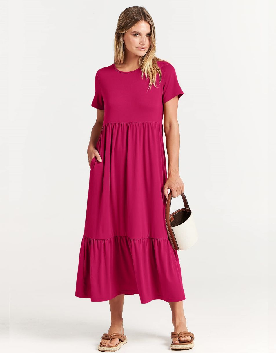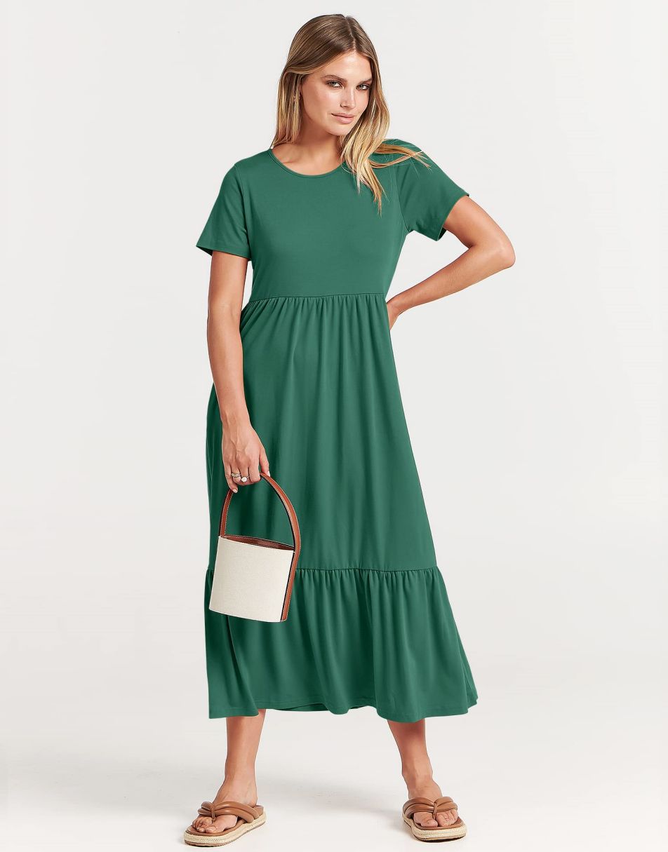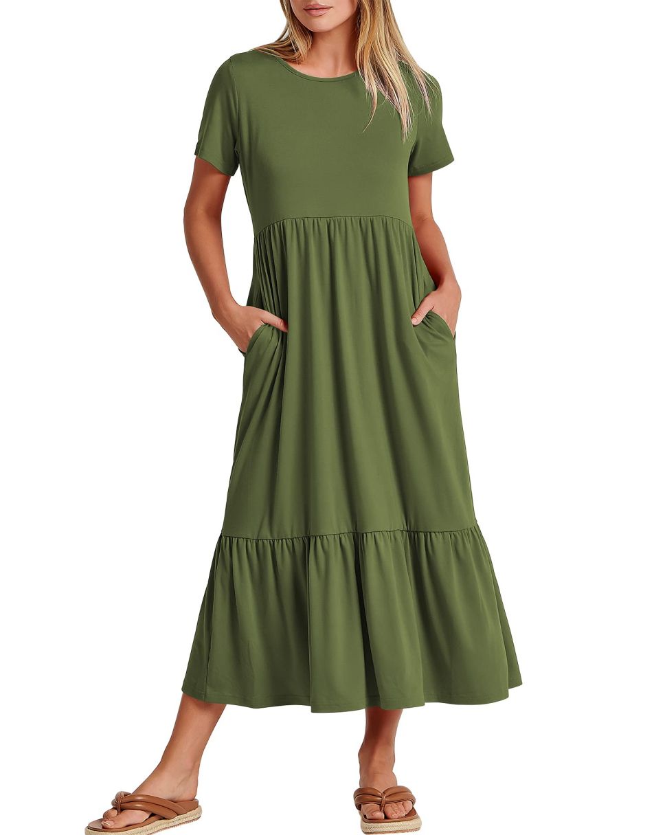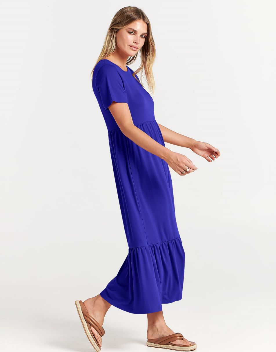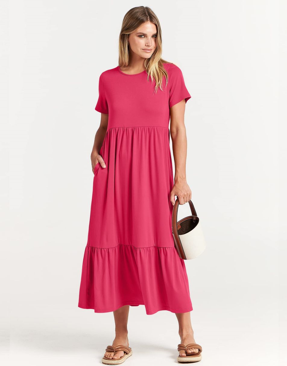 - features - short sleeve,crewneck,maxi dress,tiered flowy skirt,basic cute beach dress with pockets.