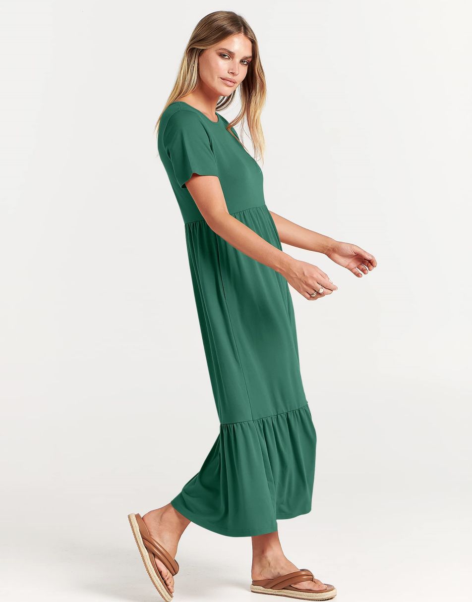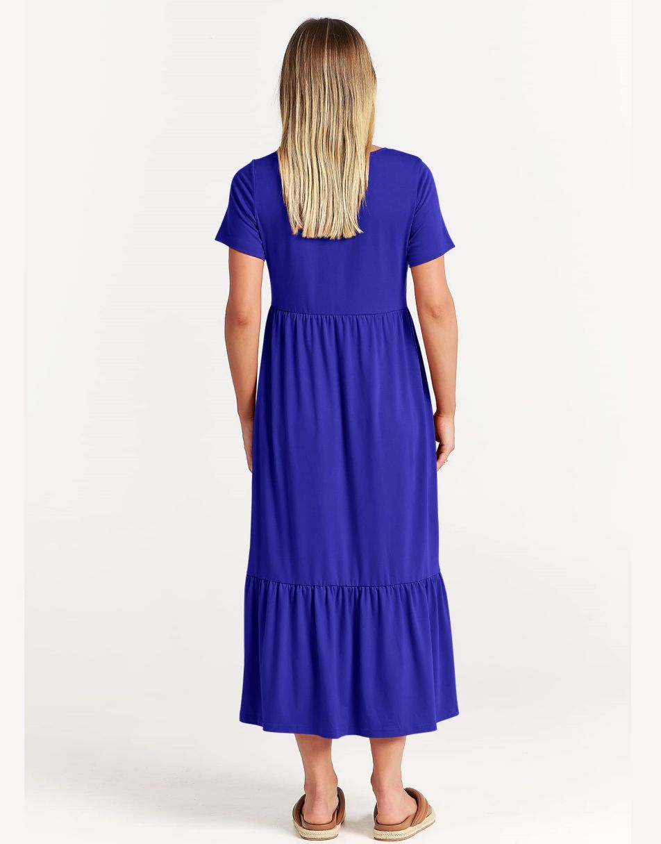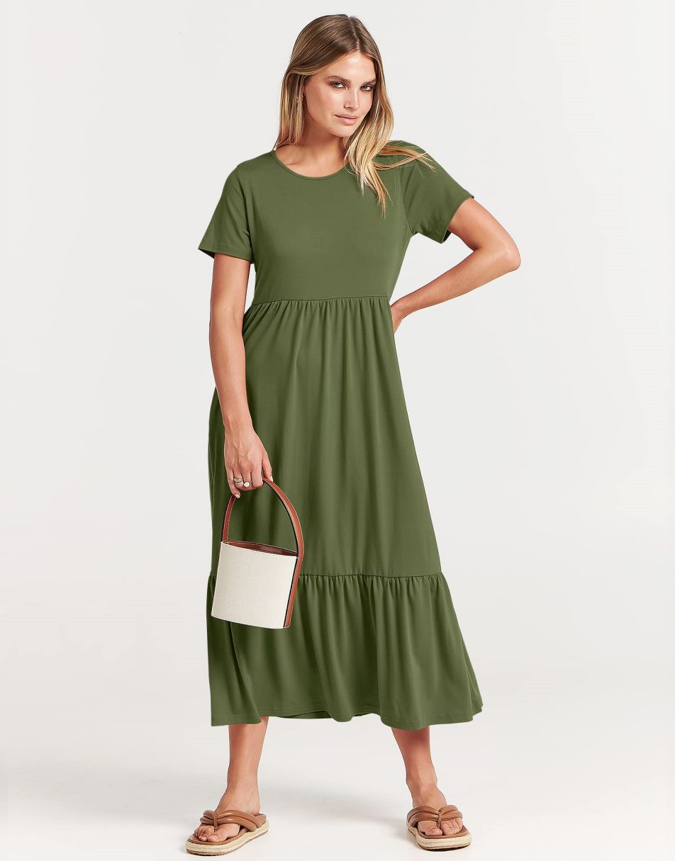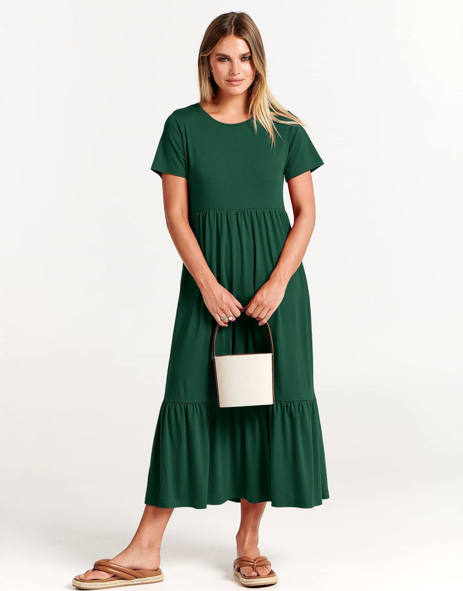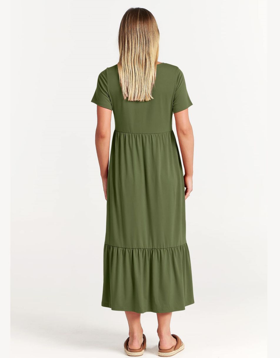- features - short sleeve,crewneck,maxi dress,tiered flowy skirt,basic cute beach dress with pockets.