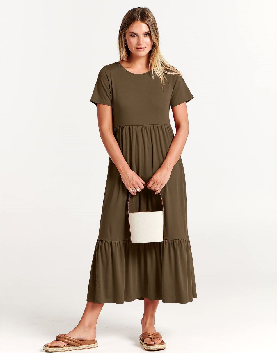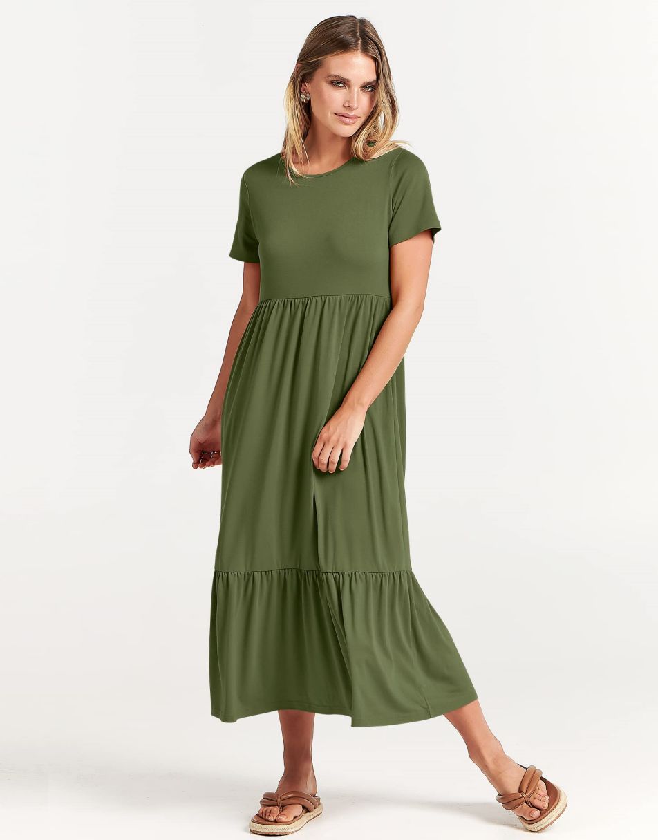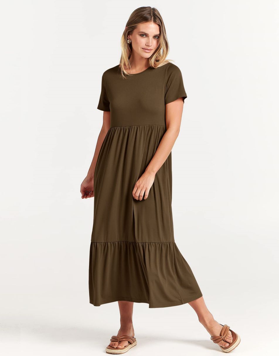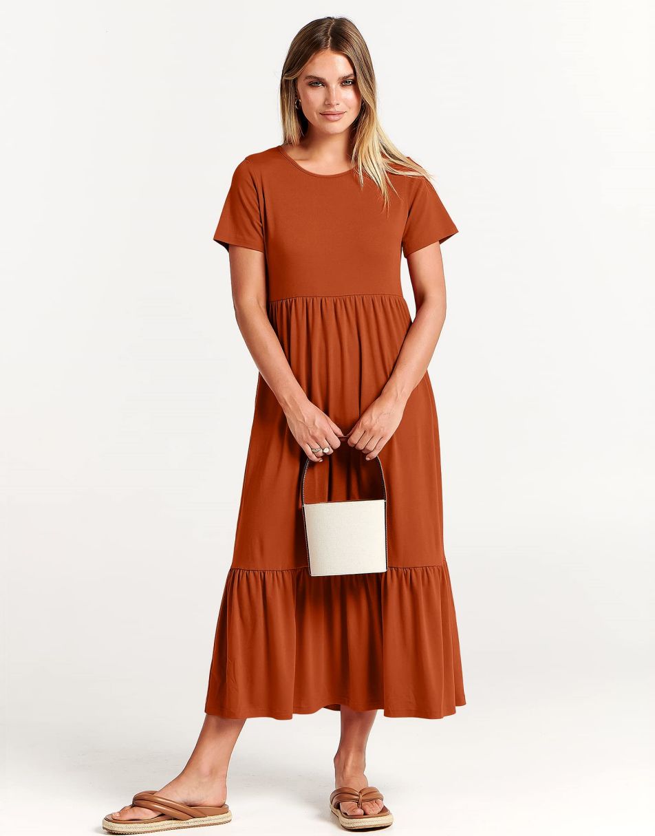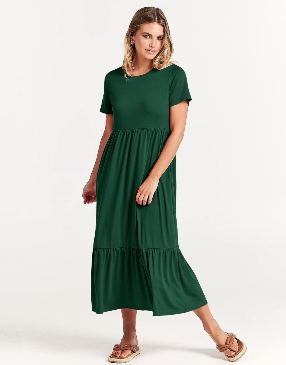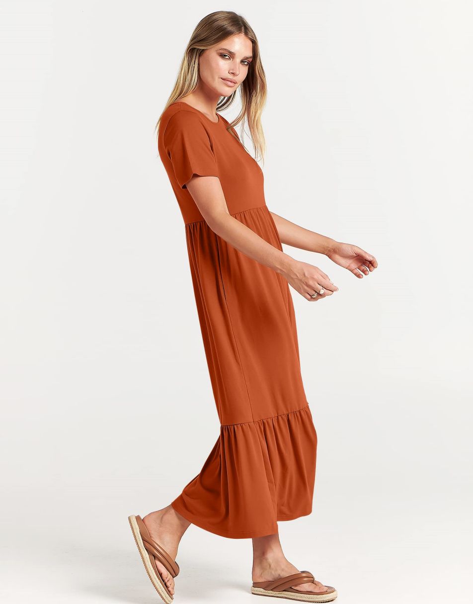 - features - short sleeve,crewneck,maxi dress,tiered flowy skirt,basic cute beach dress with pockets.