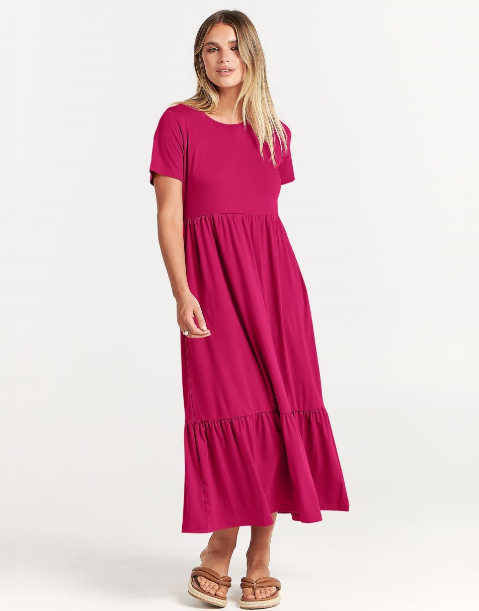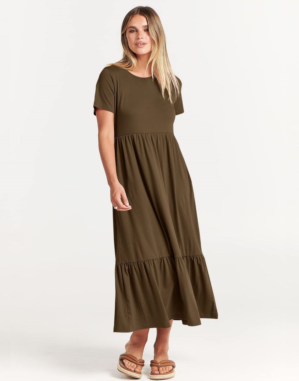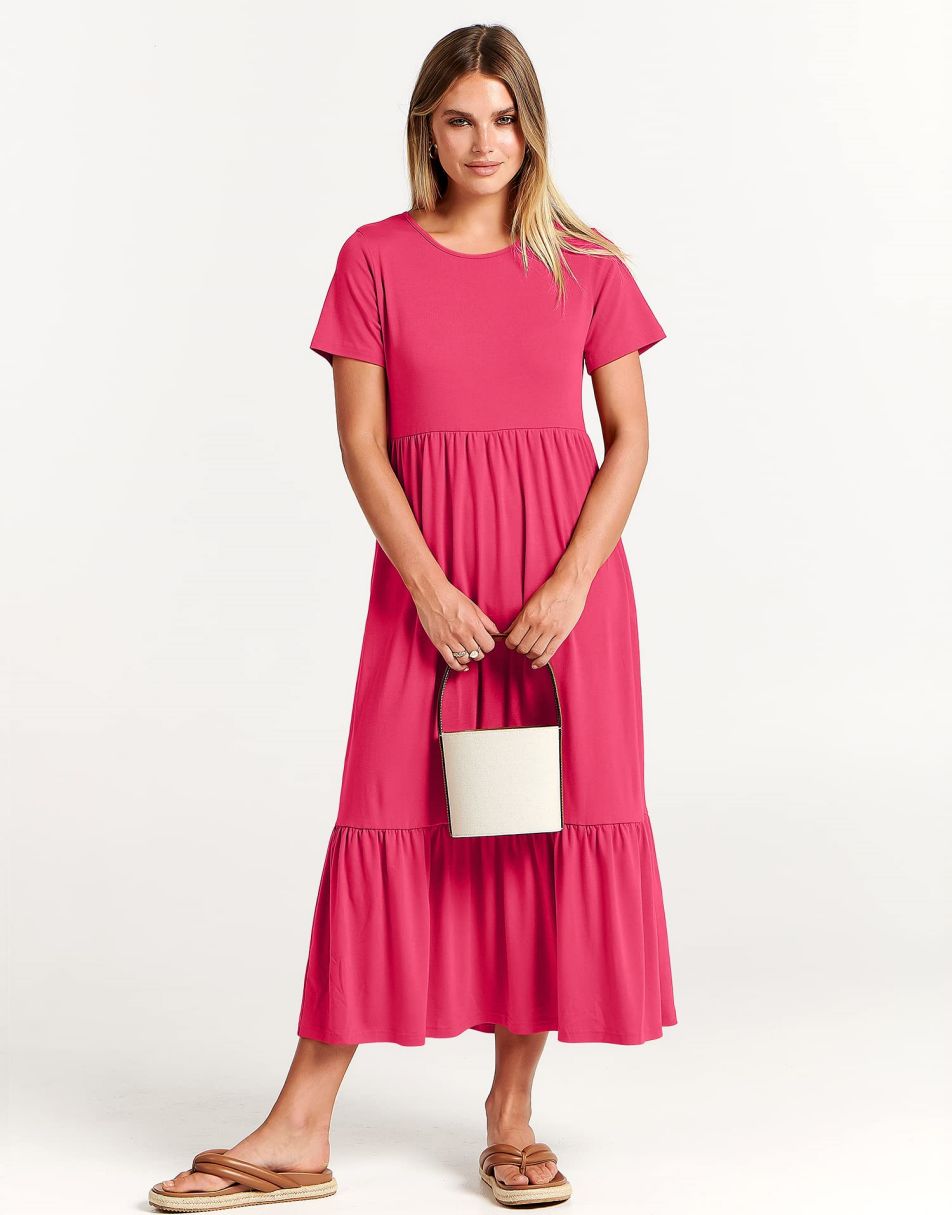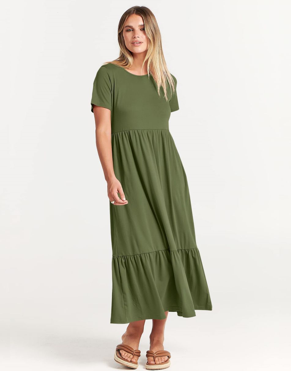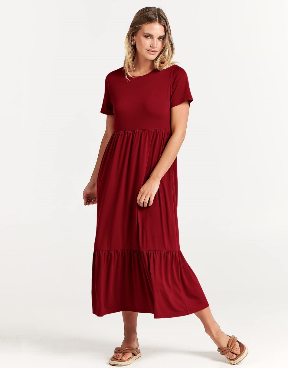 - features - short sleeve,crewneck,maxi dress,tiered flowy skirt,basic cute beach dress with pockets.