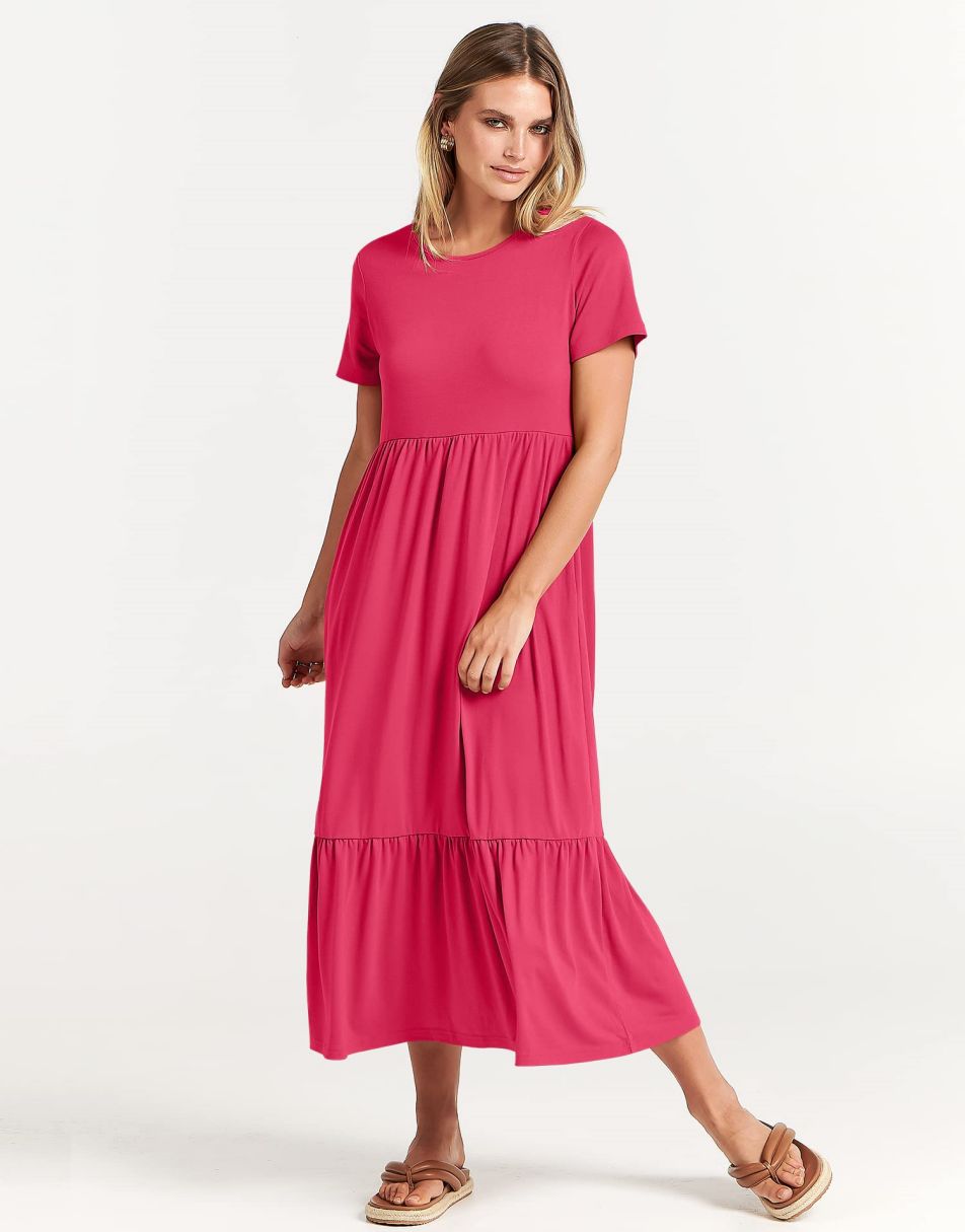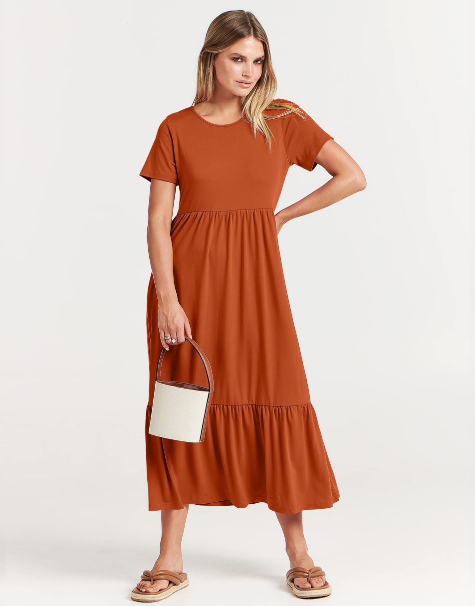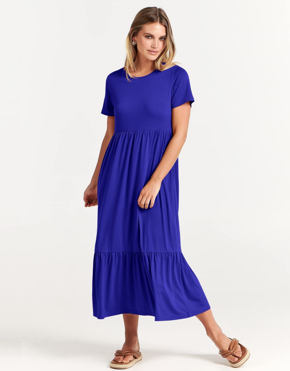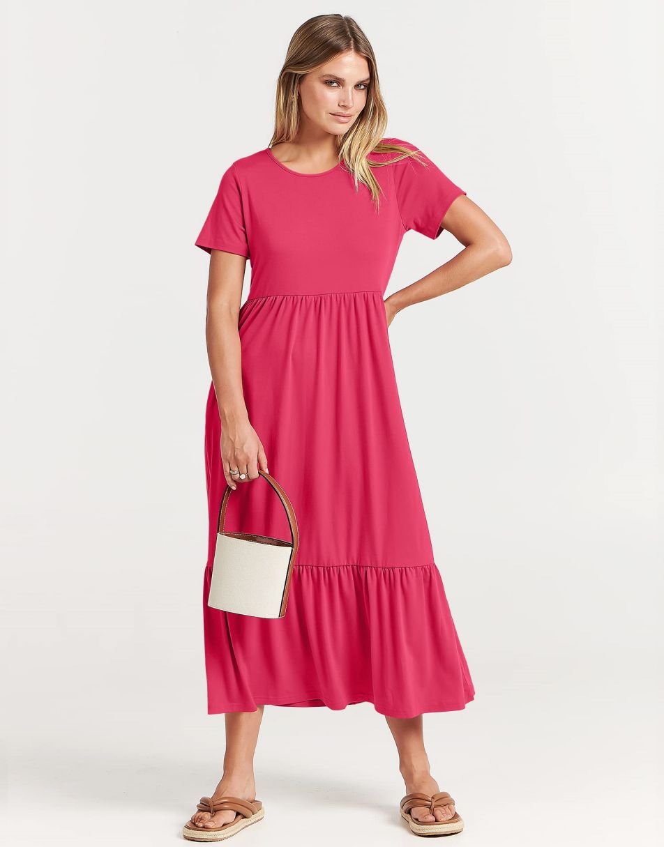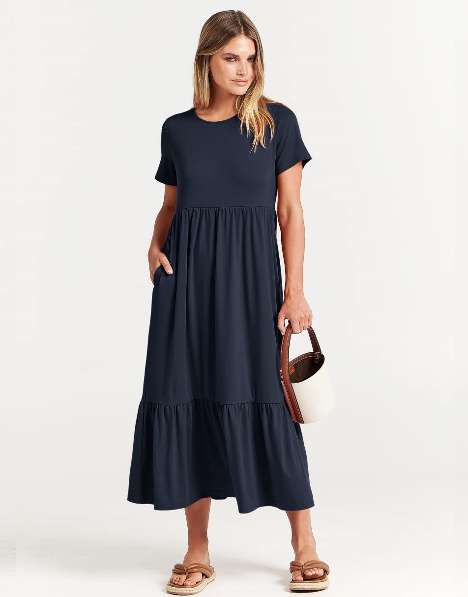 - Highlights - This Flowy long Dress With Cute tiered skirt ,flounces on the casual style and two handy side pockets,which are Perfect match for this dress.A nice simply dress for summer! Classic round neck, The midi length with tiered design makes the sundress less monotonous.