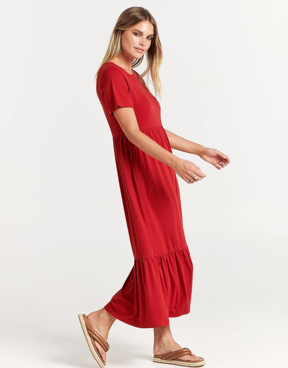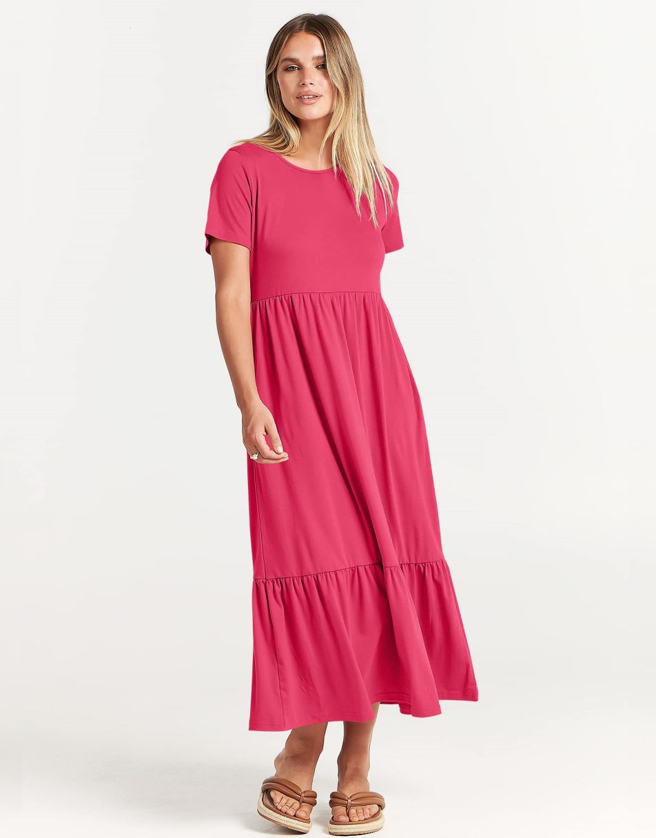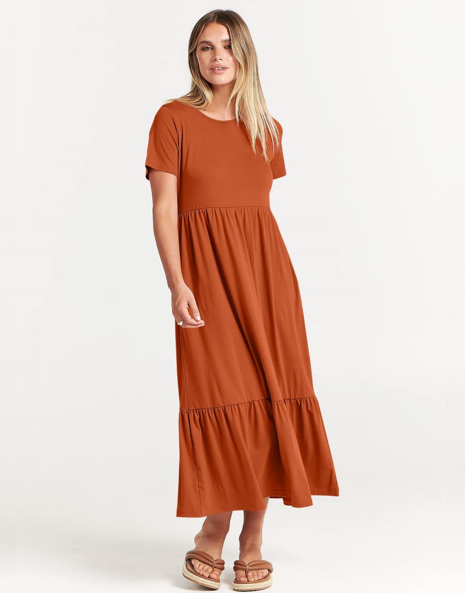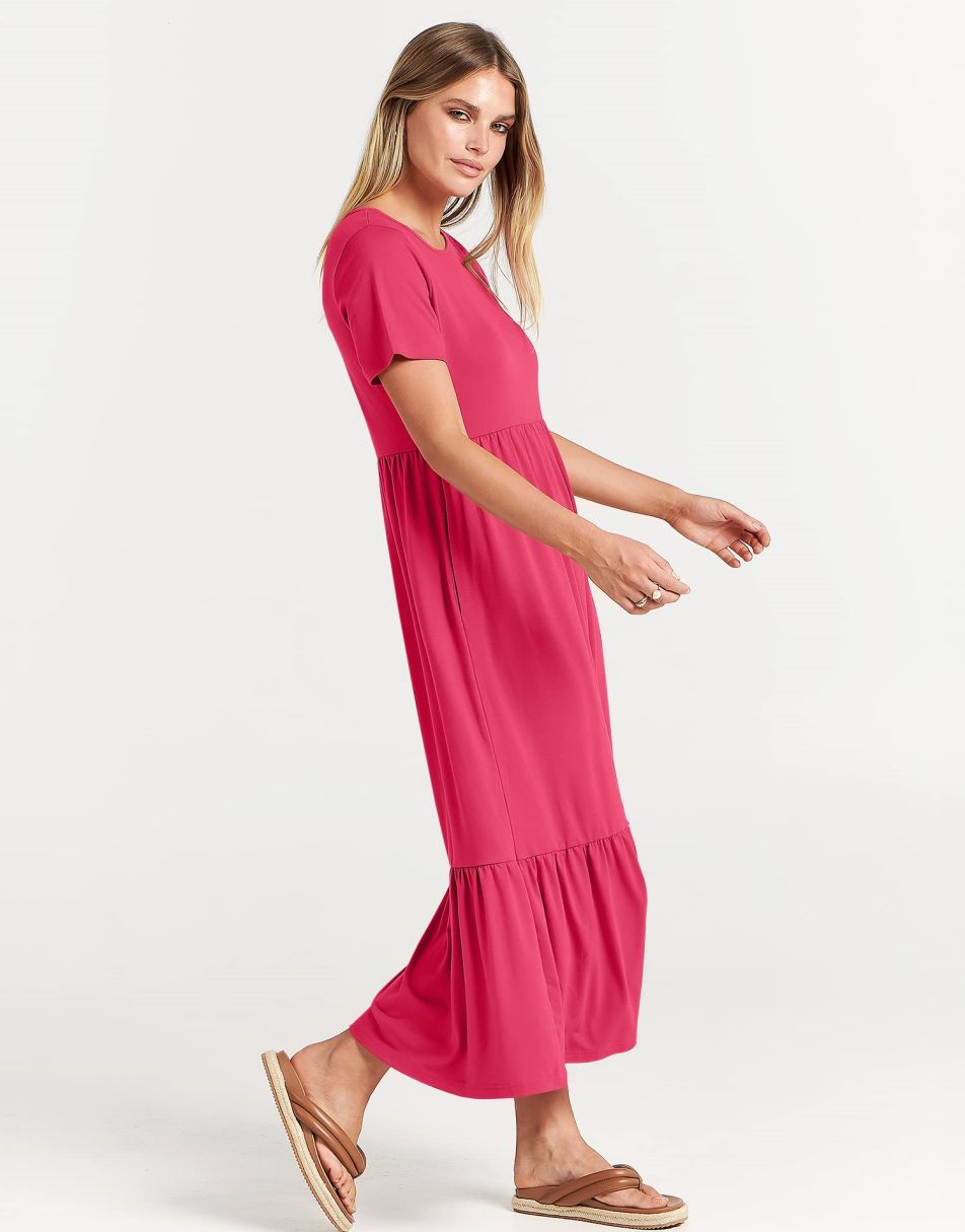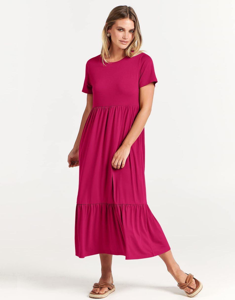 - Highlights - This Flowy long Dress With Cute tiered skirt ,flounces on the casual style and two handy side pockets,which are Perfect match for this dress.A nice simply dress for summer! Classic round neck, The midi length with tiered design makes the sundress less monotonous.