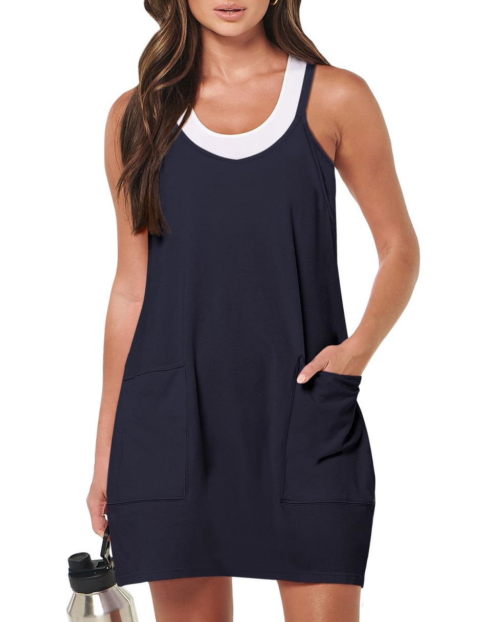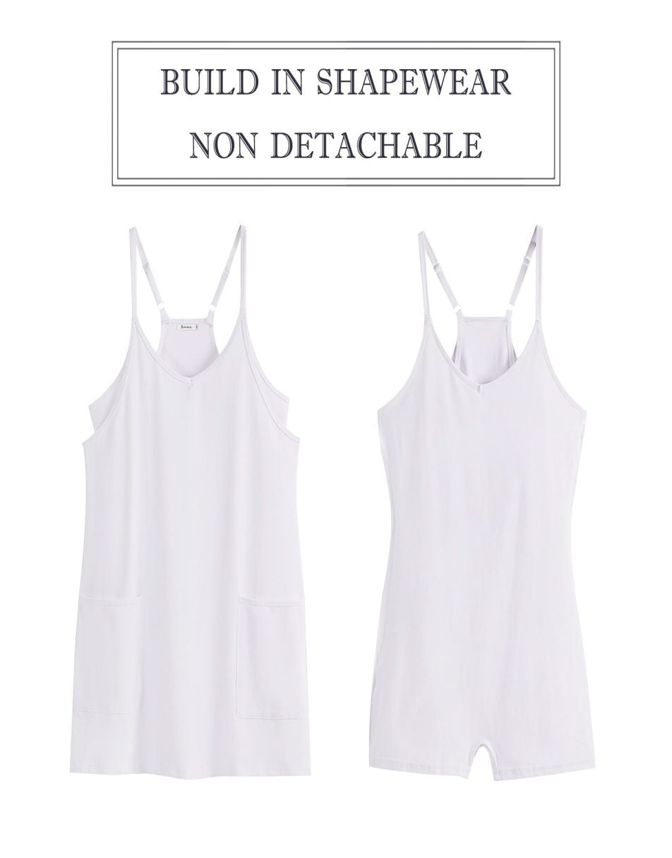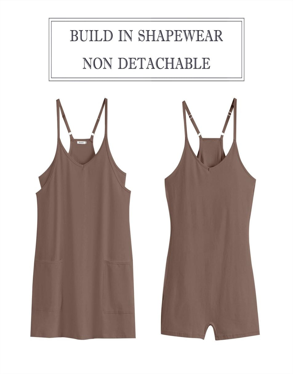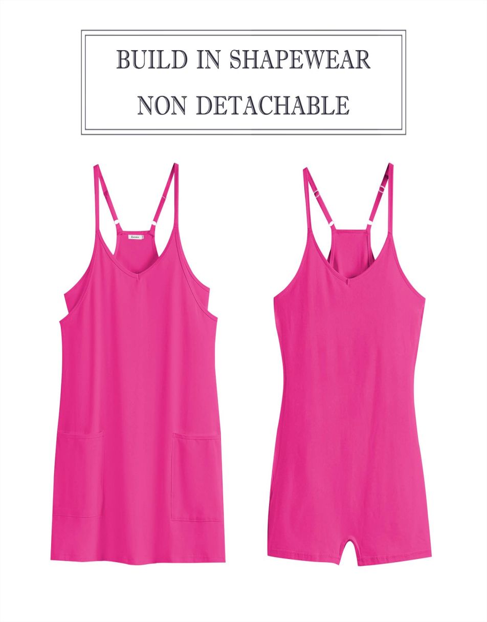 - Features - This workout mini dress build in shapewear featured spaghetti straps, V neck, patch pockets, solid color, making it perfect for staying cool and stylish during hot summer days.