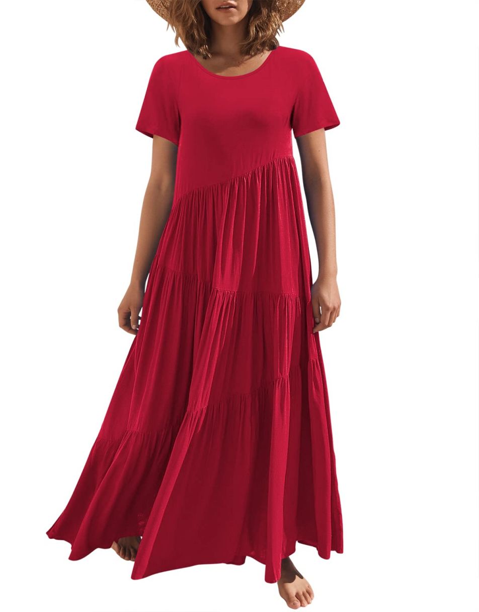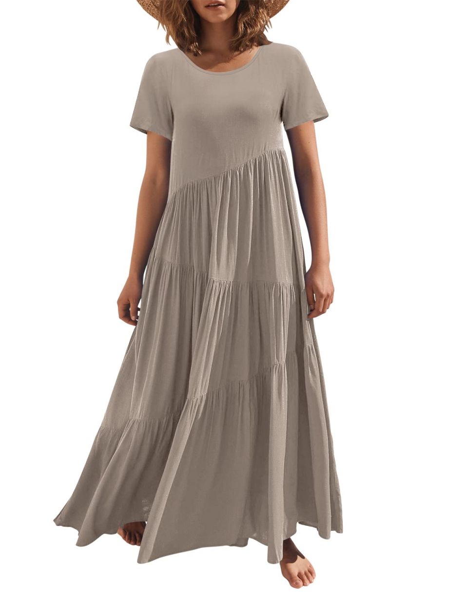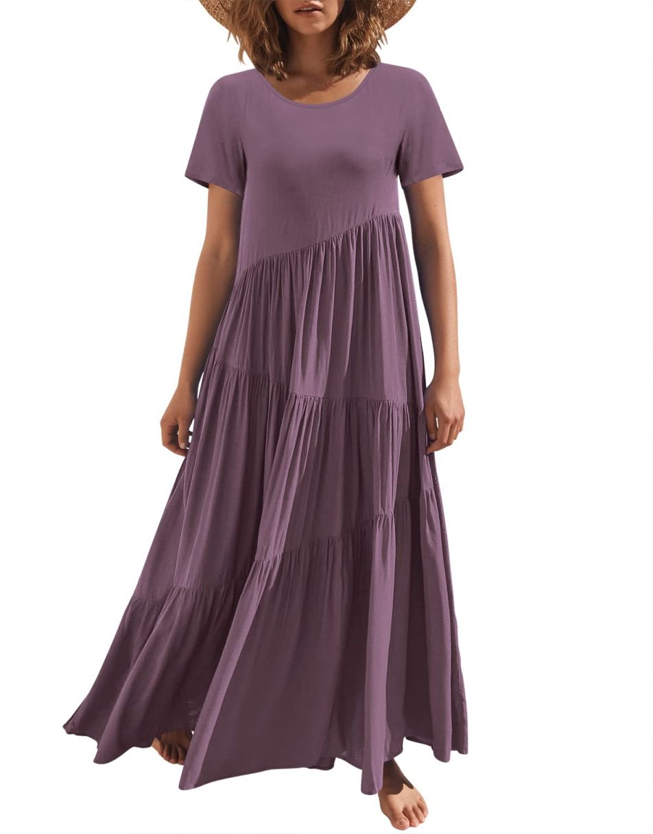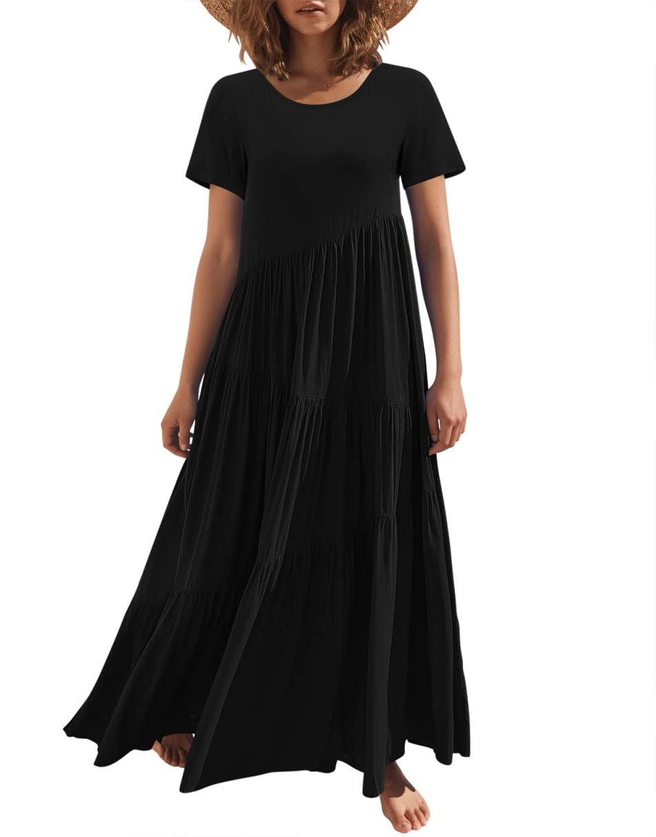 Features - Full length,short sleeve, crewneck,tiered skirt,asymmetric,beach cover up maxi dress