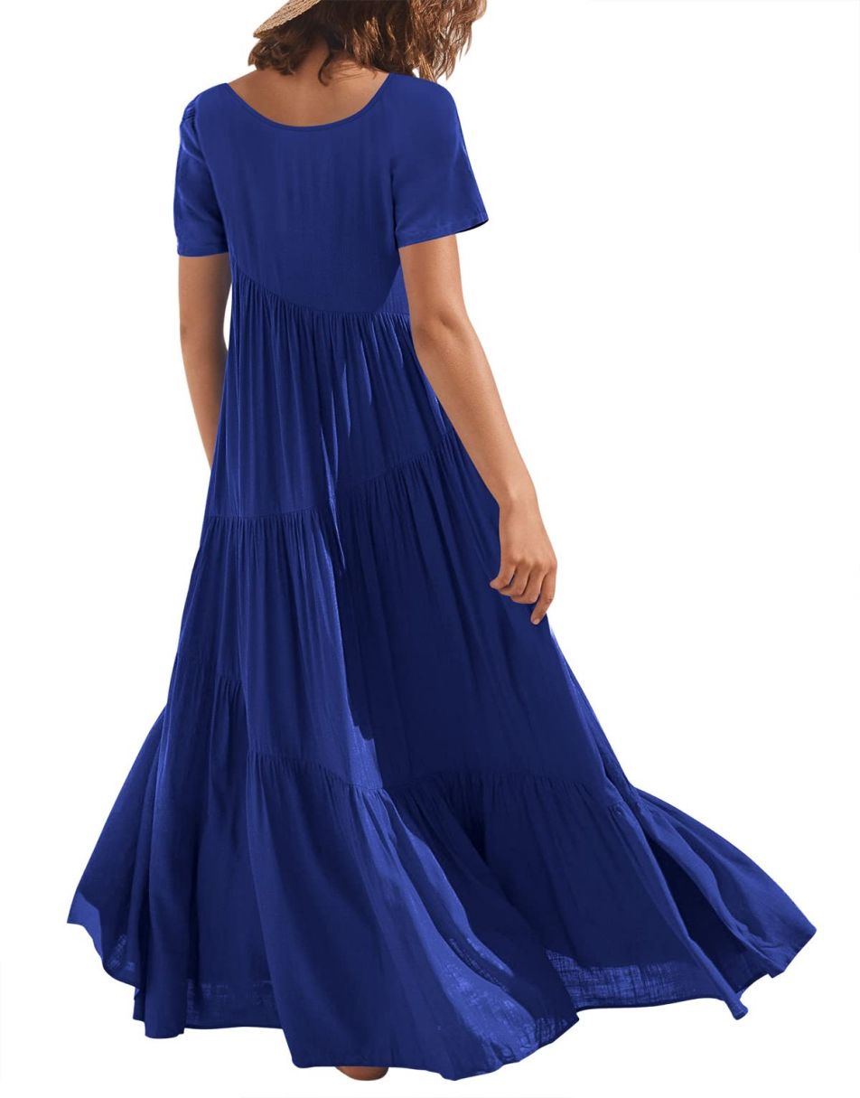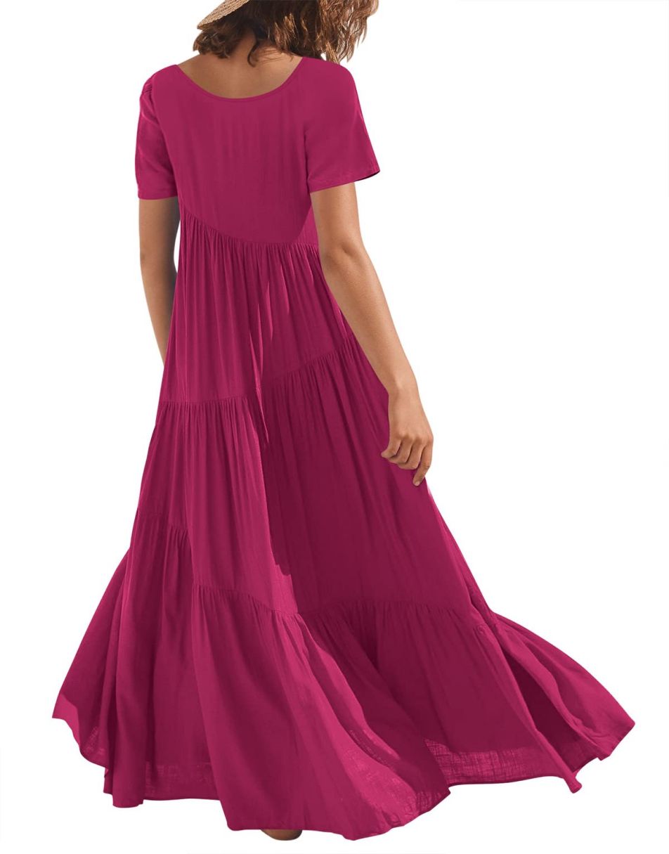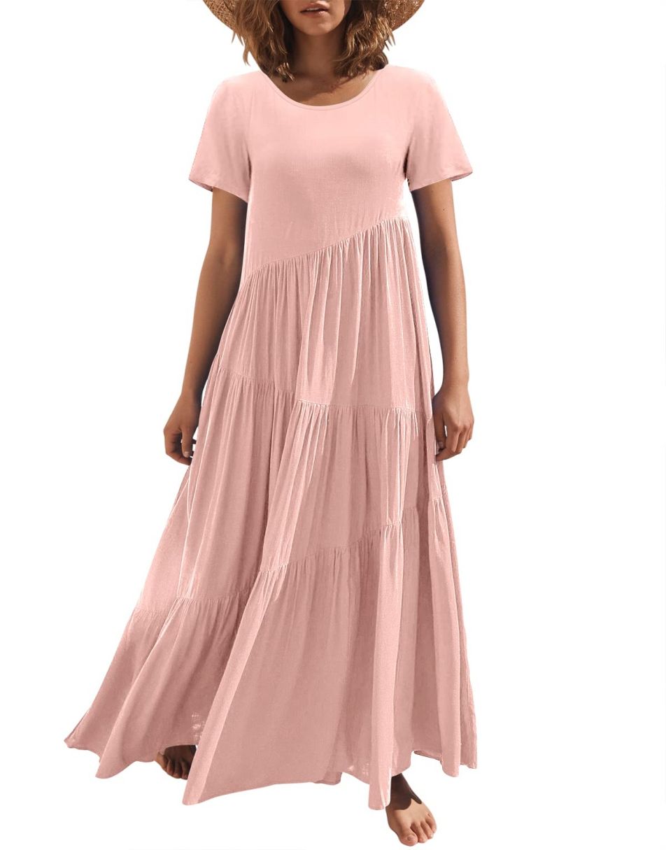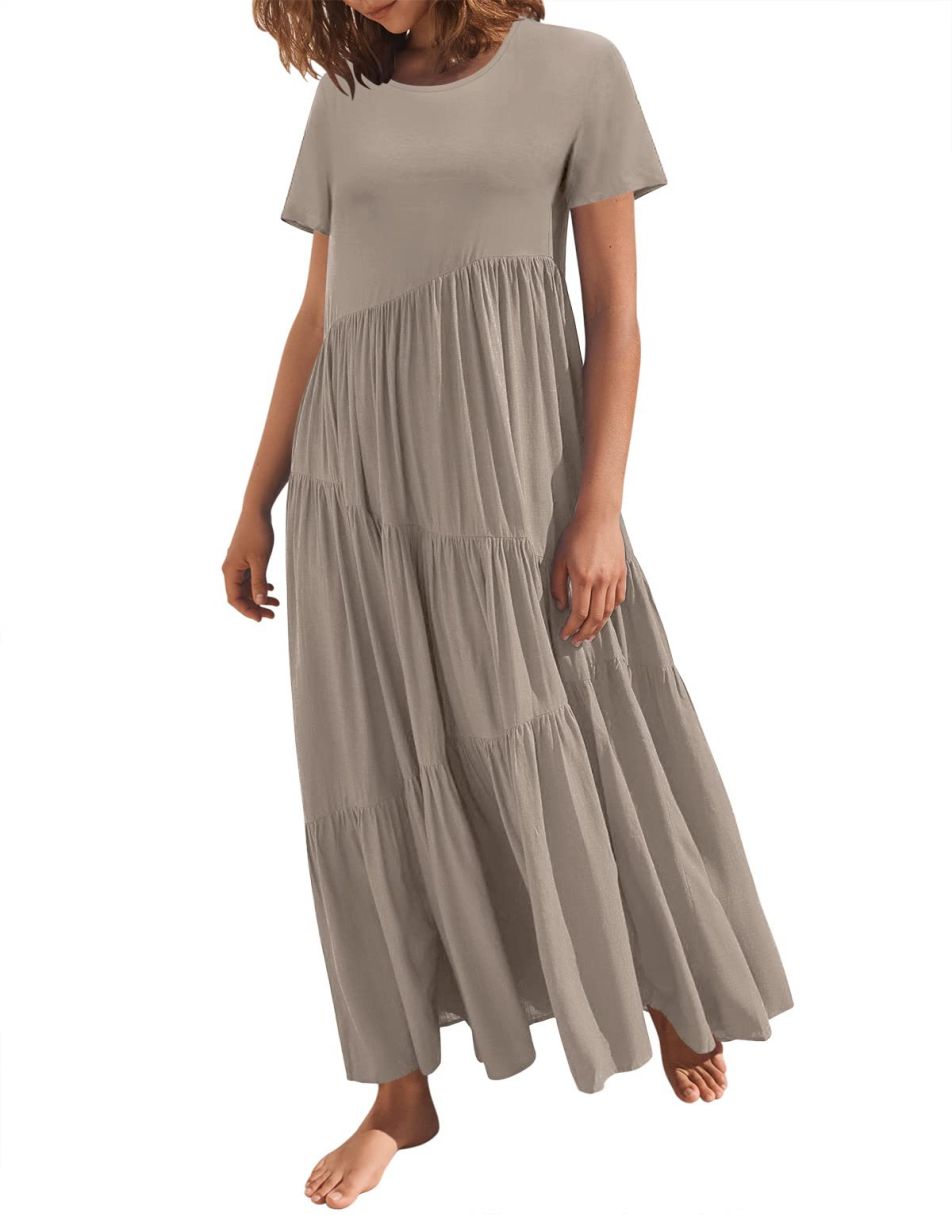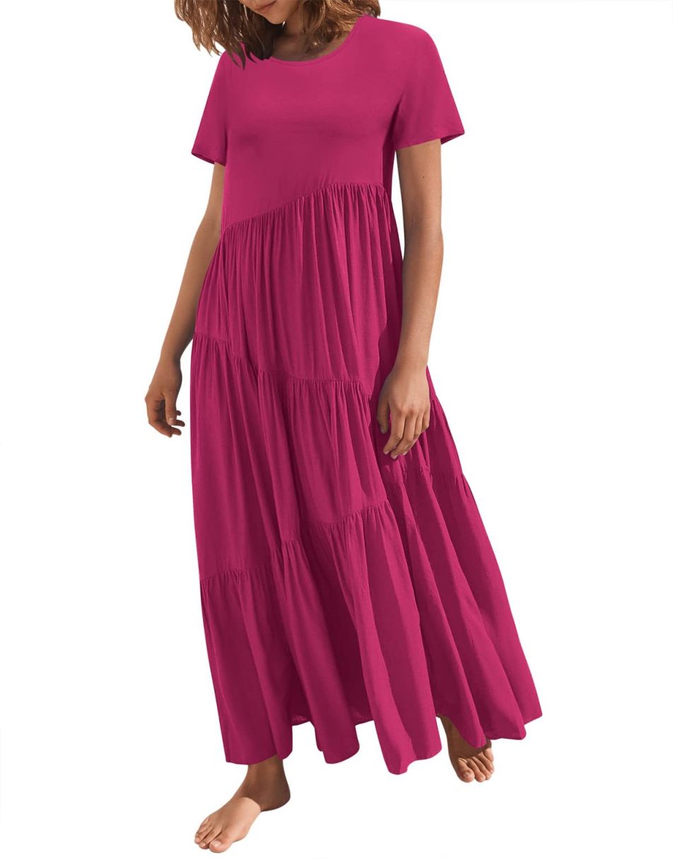 Features - Full length,short sleeve, crewneck,tiered skirt,asymmetric,beach cover up maxi dress