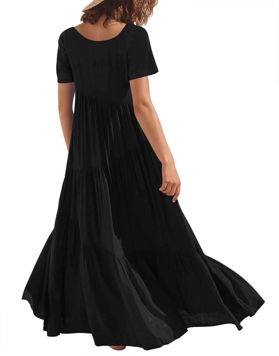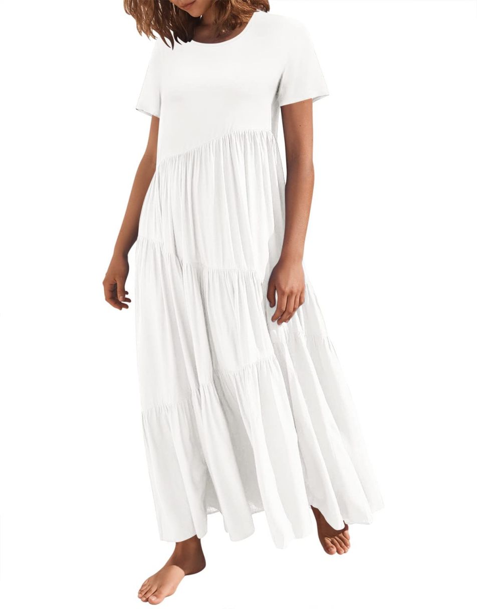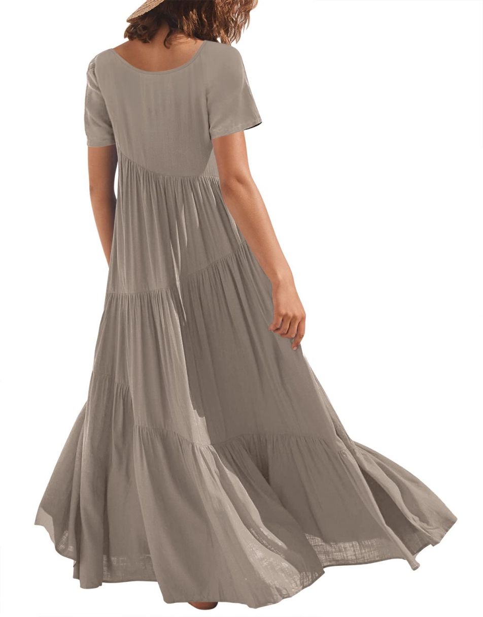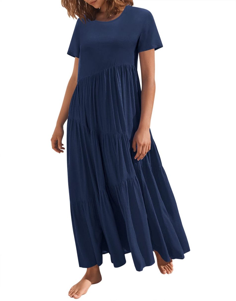 Features - Full length,short sleeve, crewneck,tiered skirt,asymmetric,beach cover up maxi dress