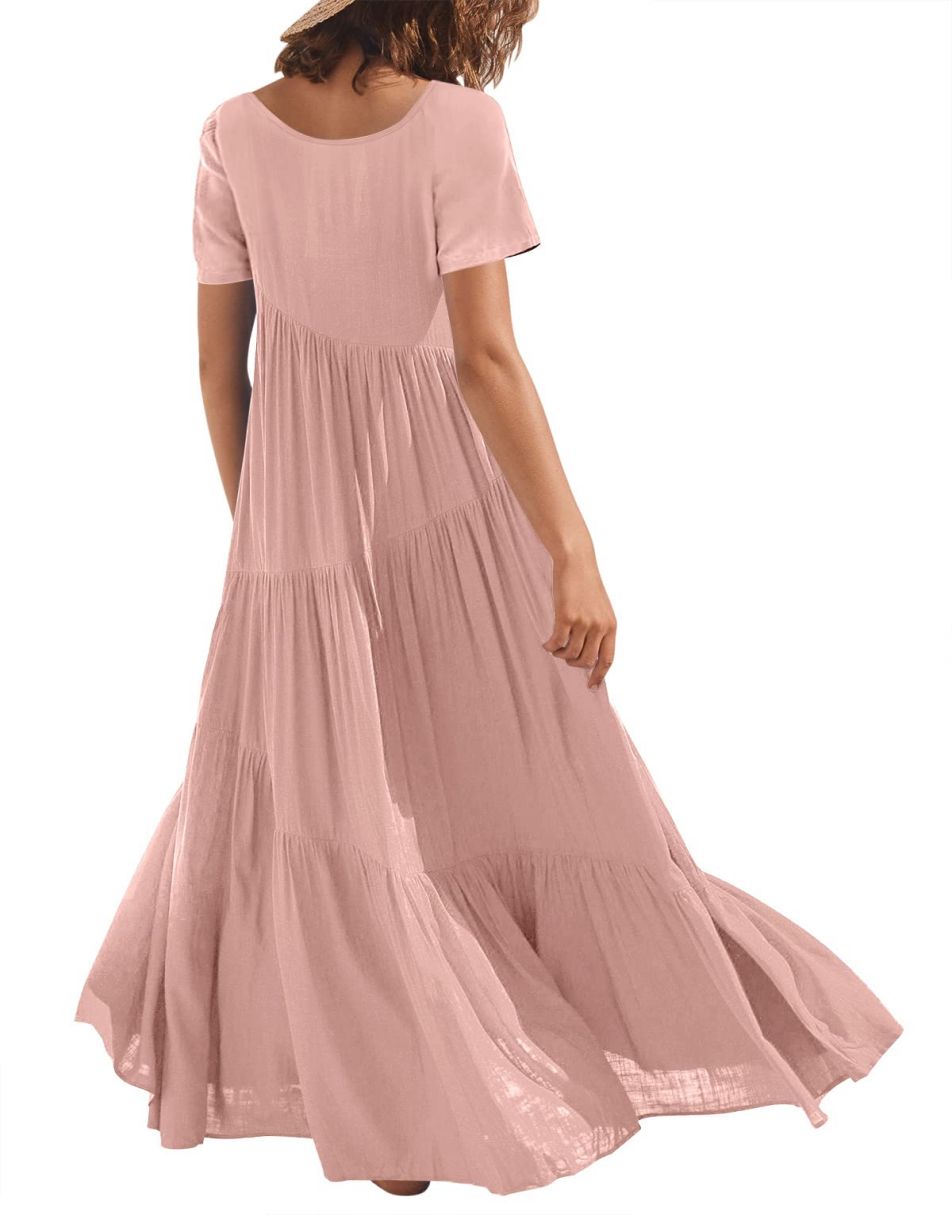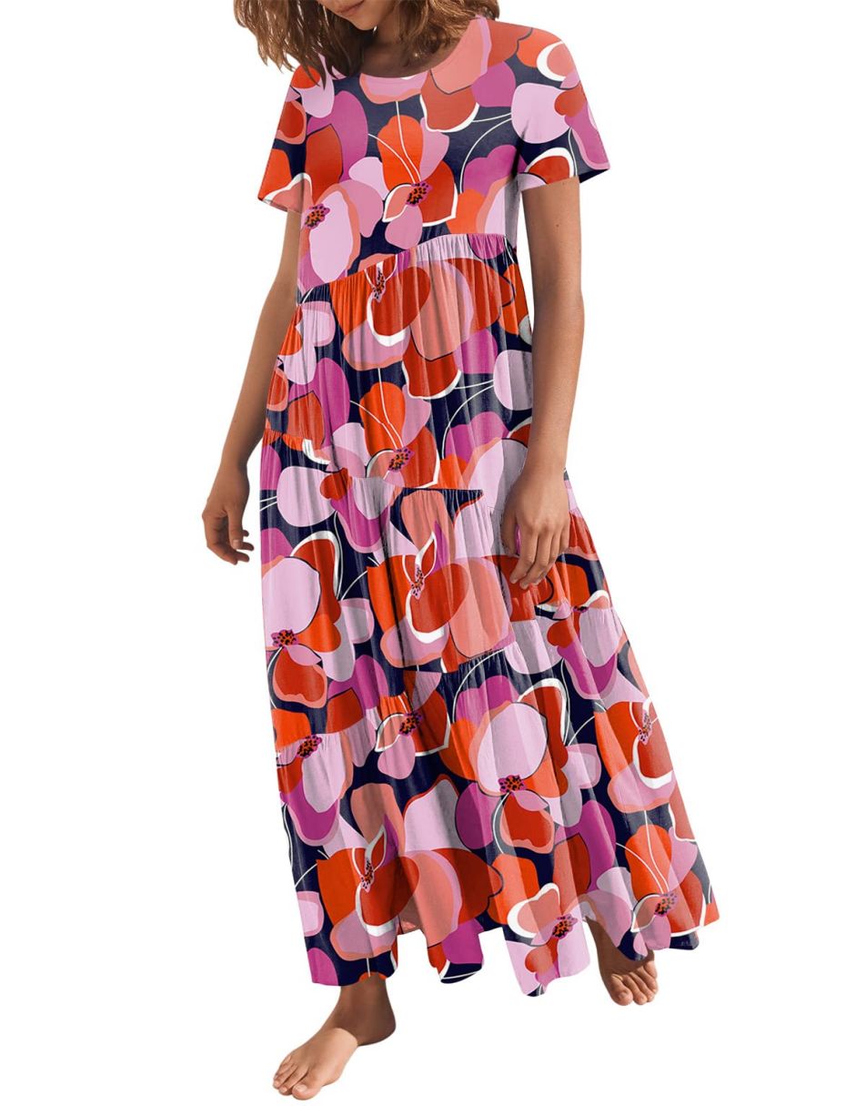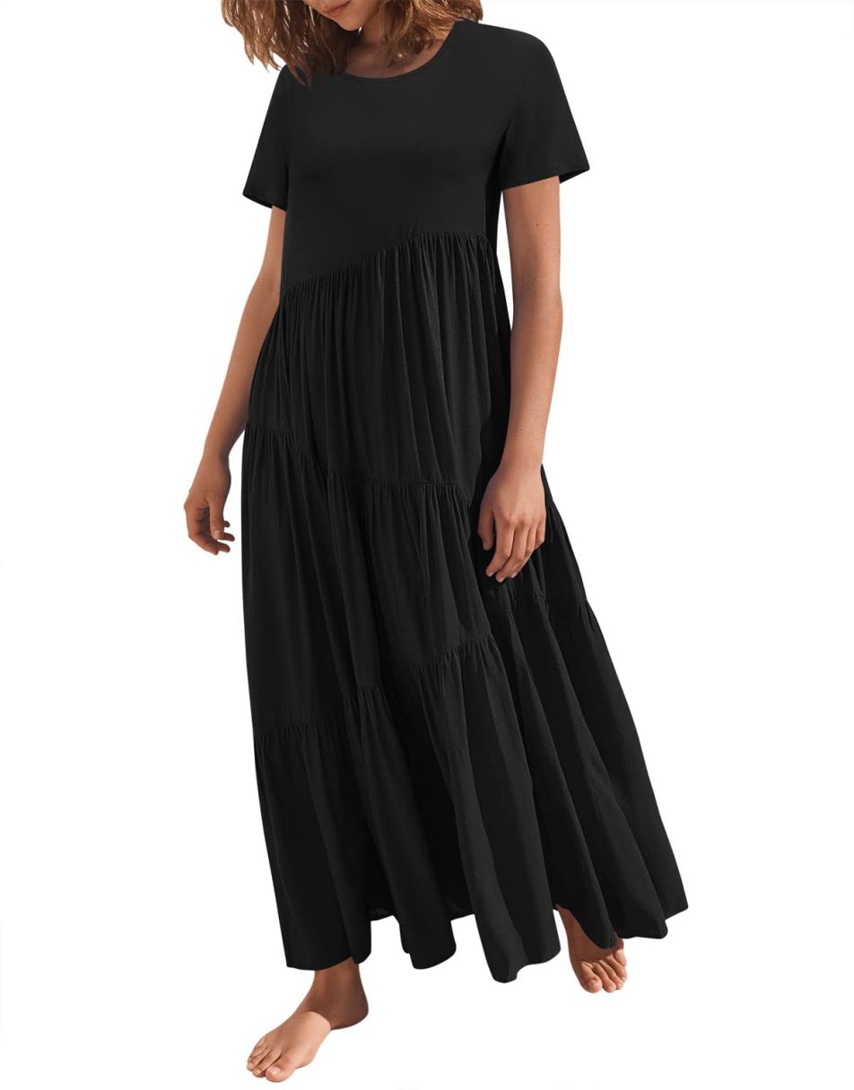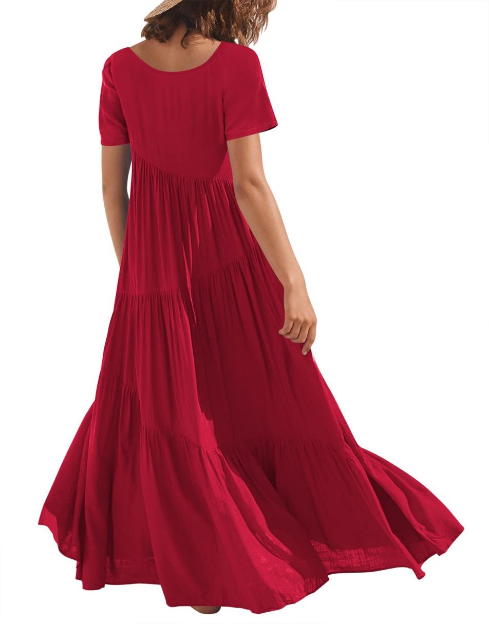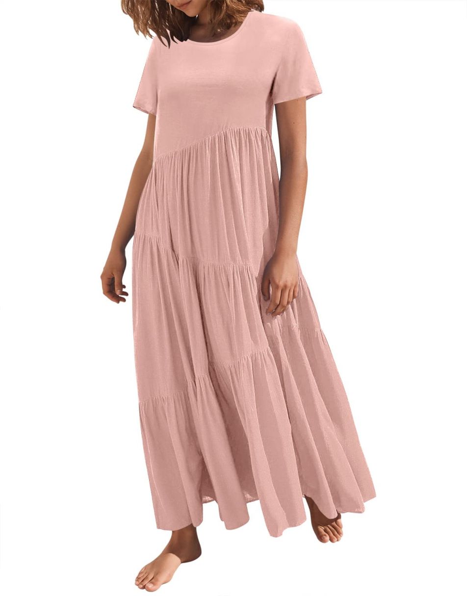 Features - Full length,short sleeve, crewneck,tiered skirt,asymmetric,beach cover up maxi dress