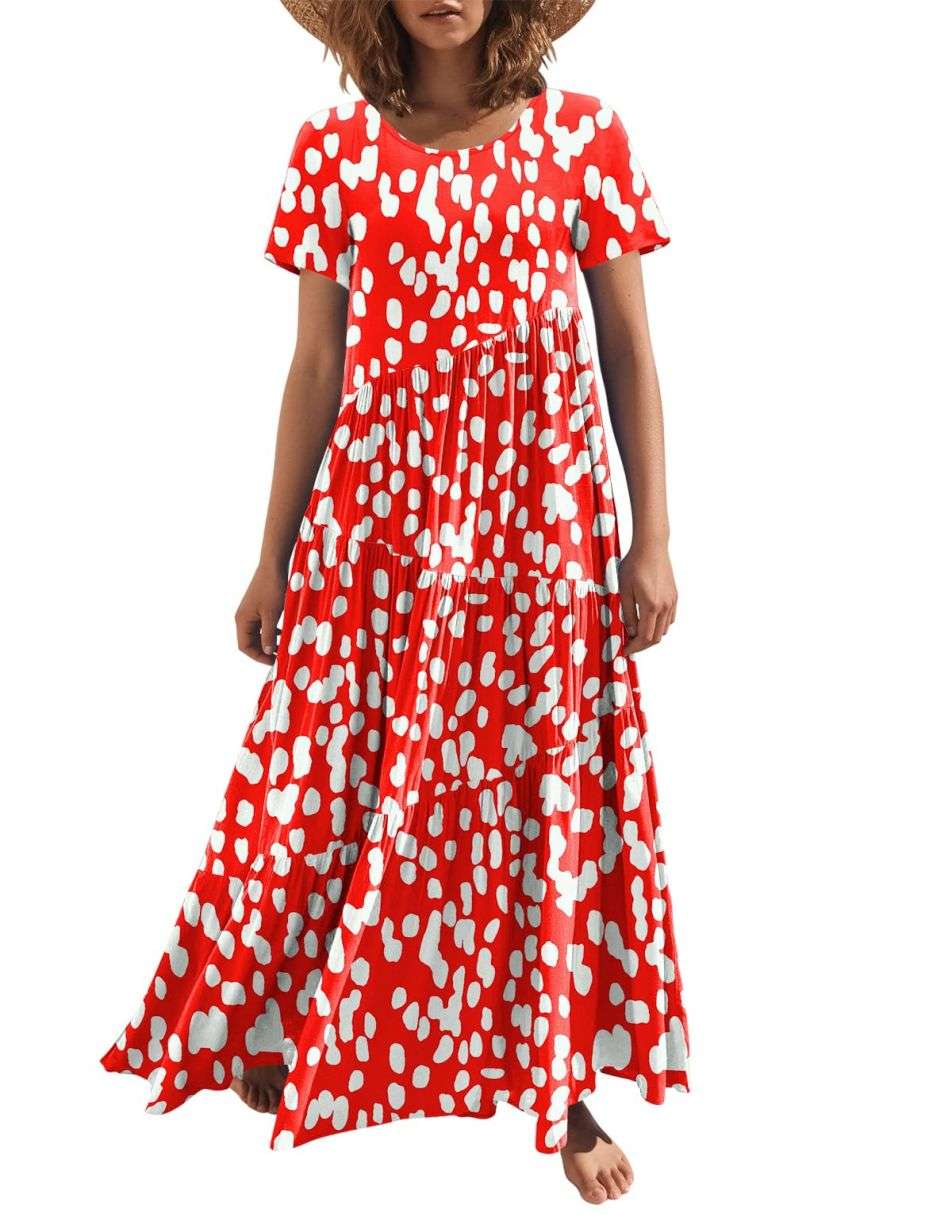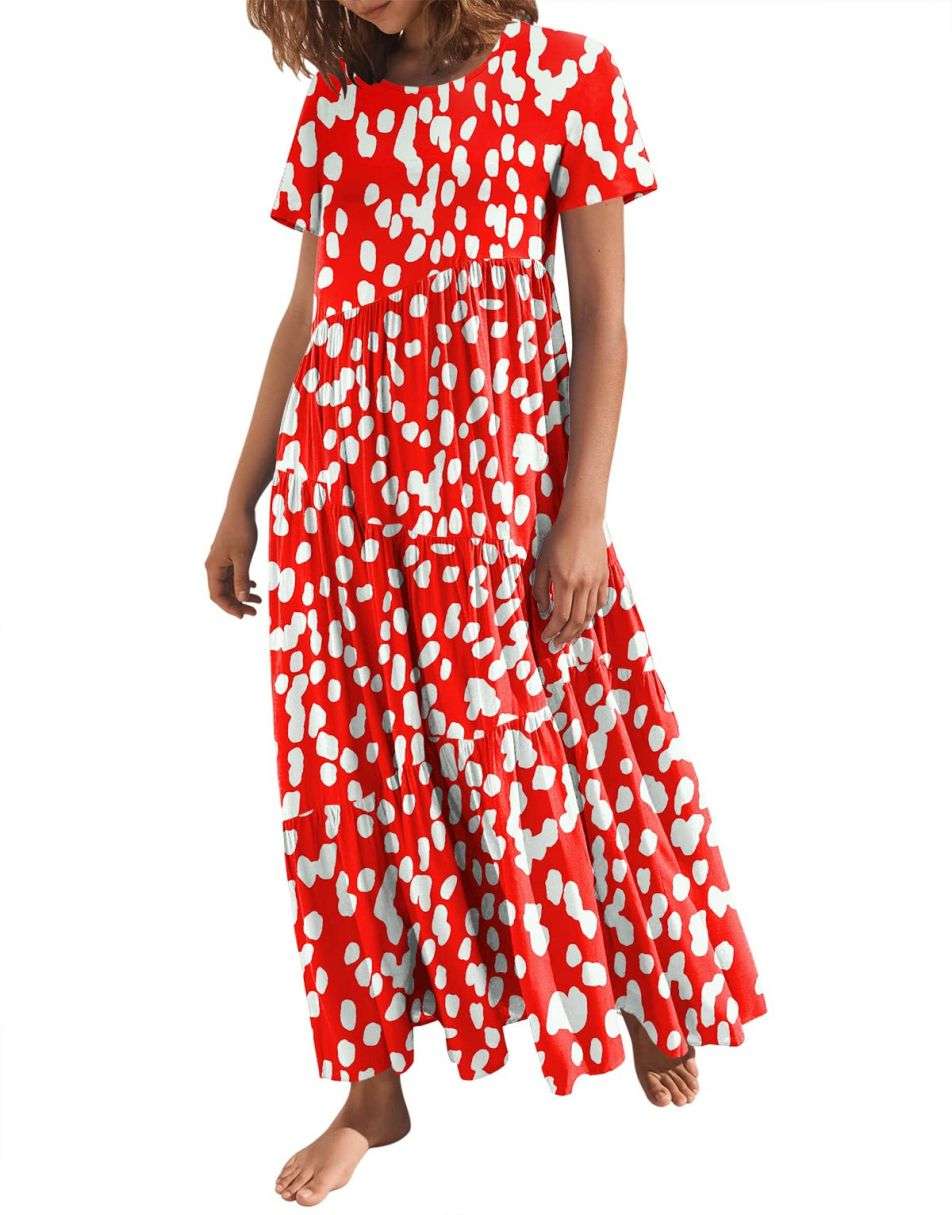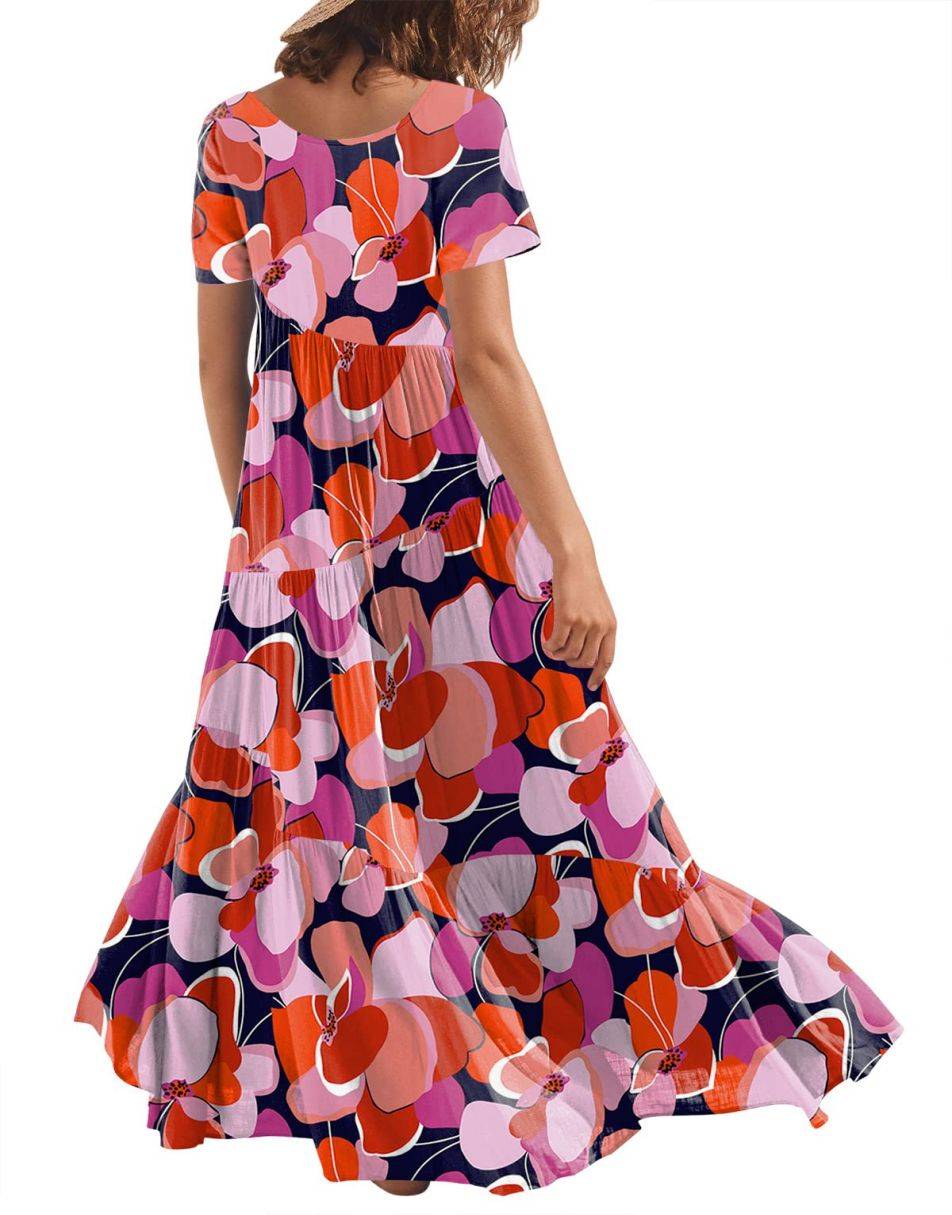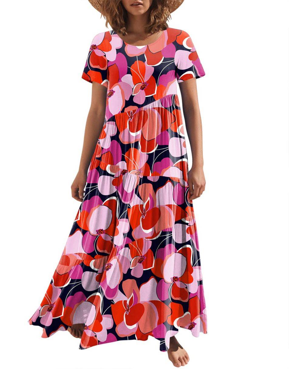 Features - Full length,short sleeve, crewneck,tiered skirt,asymmetric,beach cover up maxi dress