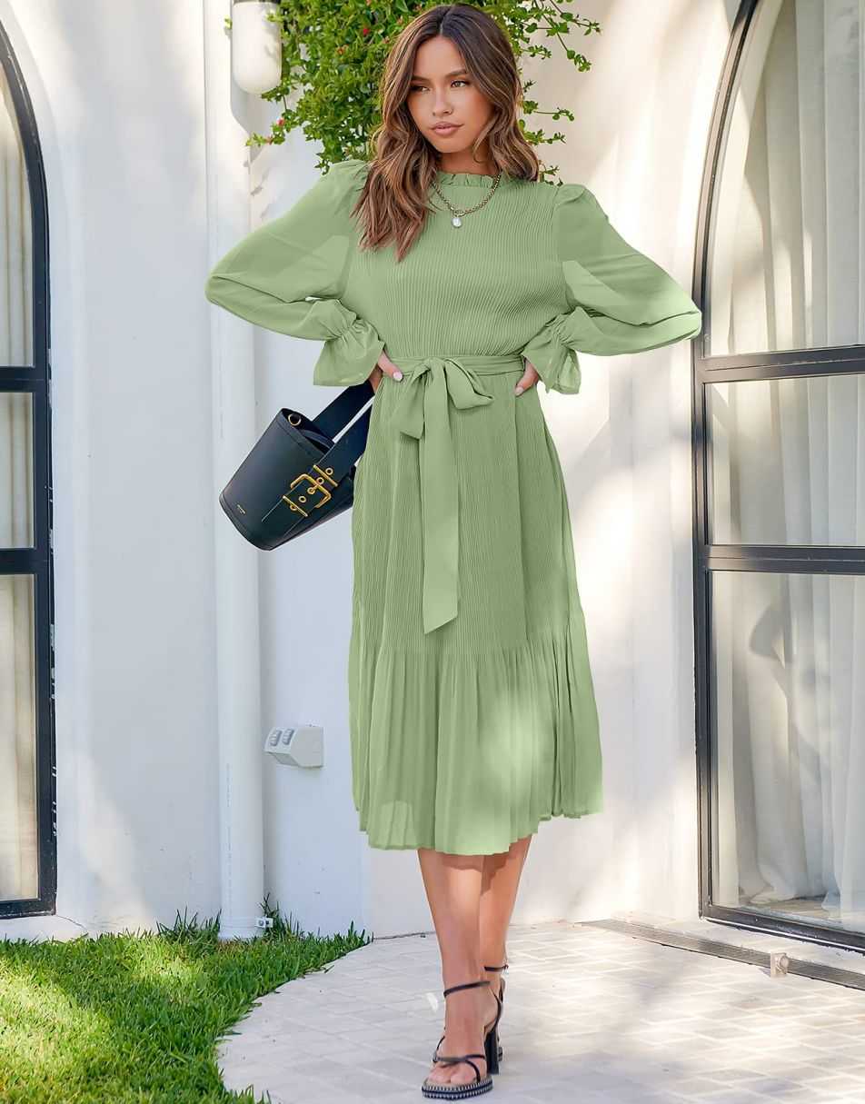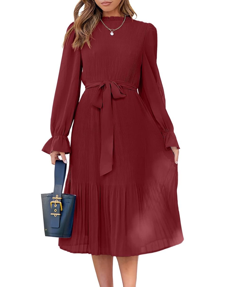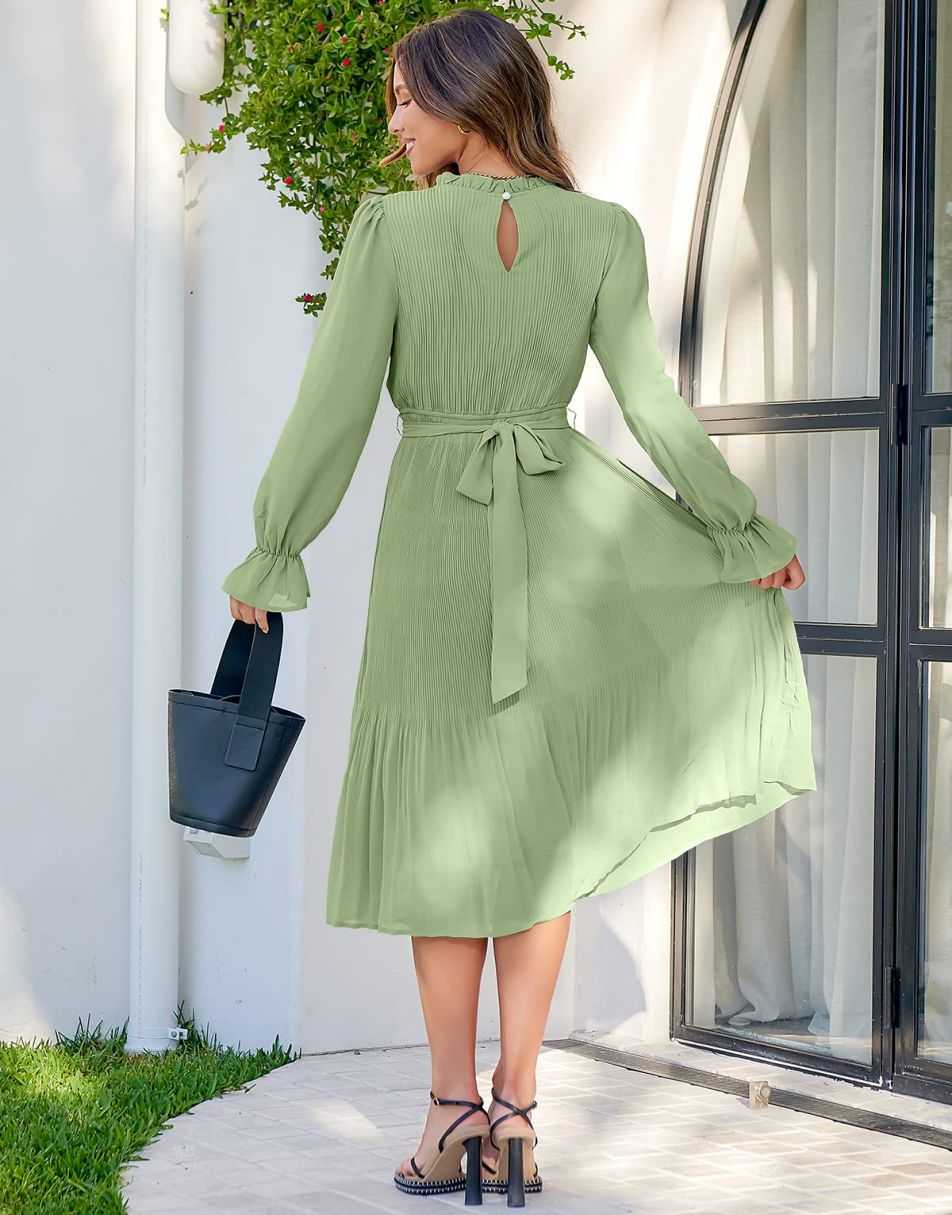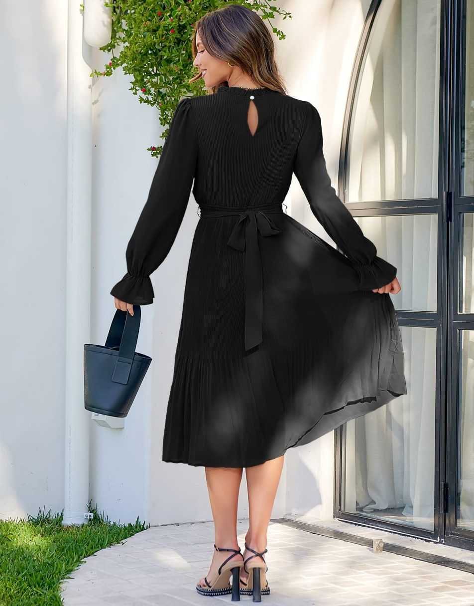 Features - this elegant midi dress is ANRABESS fall recommendation,which featured ruffle trim neckine,smocked and pleated A-Line body shape,chiffon fabrication make flowy swing skirt,pull long sleeve with elastic cuff,wasit belt for a cute decoration.