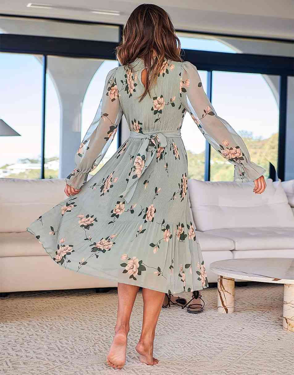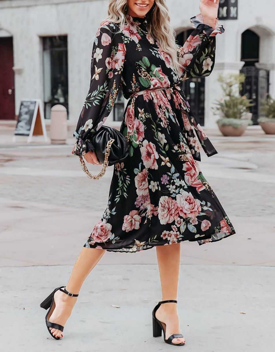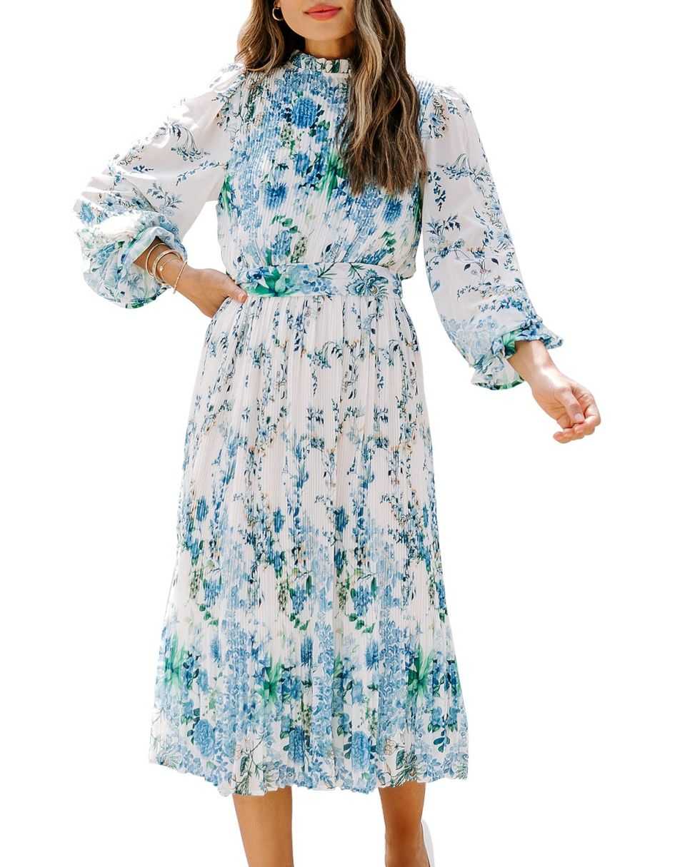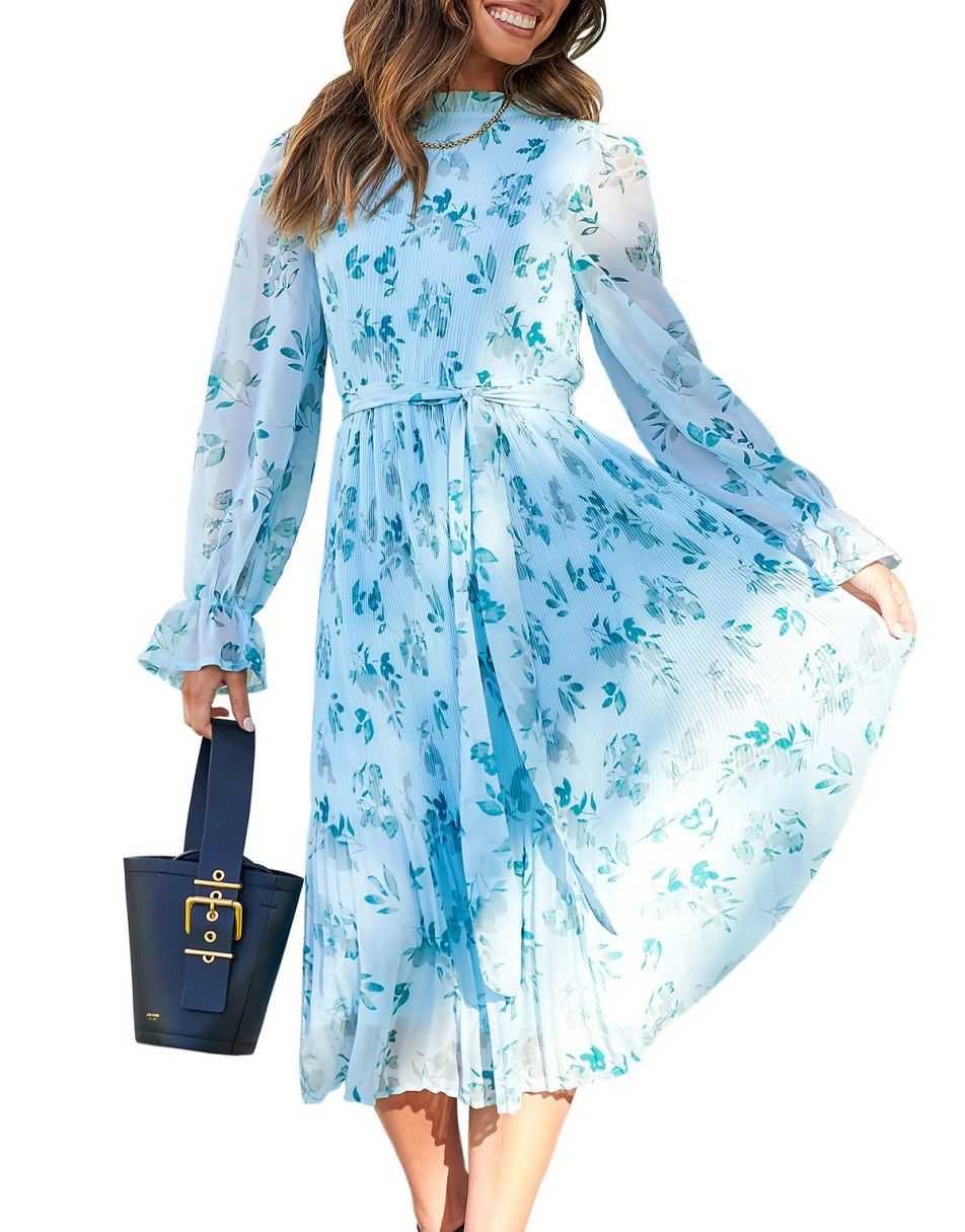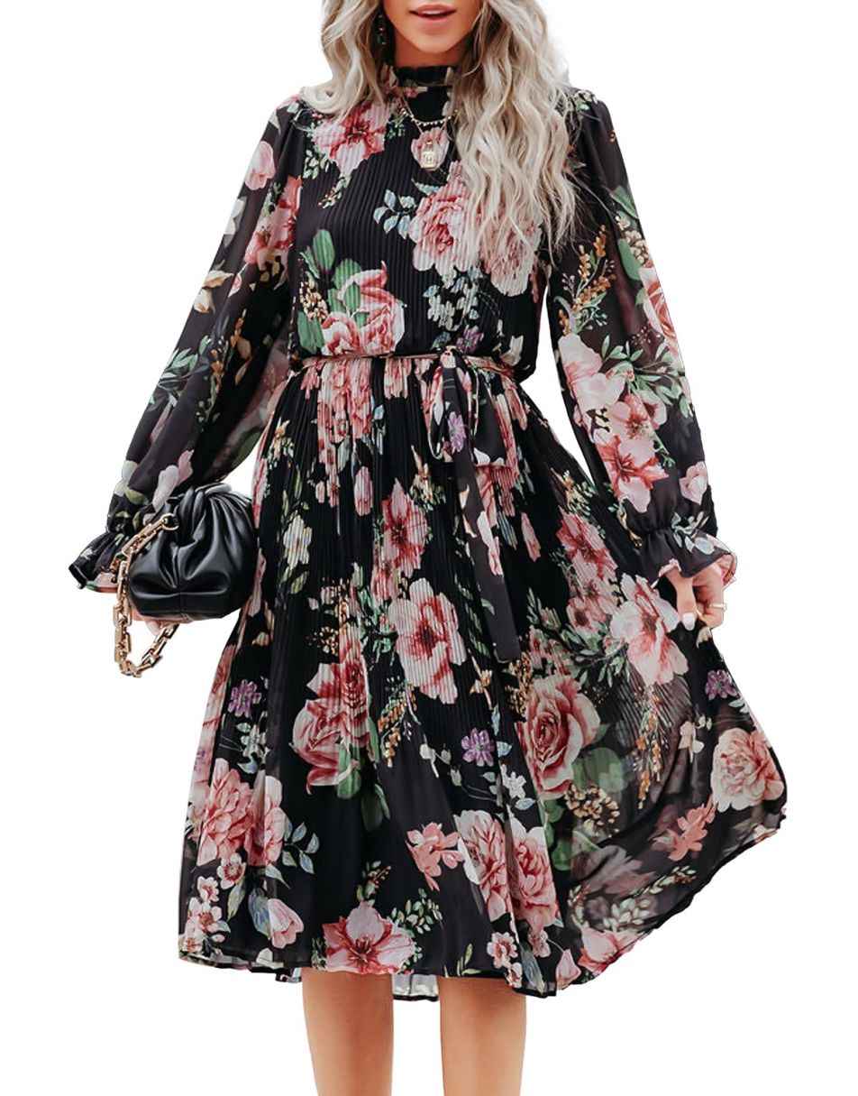 Features - this elegant midi dress is ANRABESS fall recommendation,which featured ruffle trim neckine,smocked and pleated A-Line body shape,chiffon fabrication make flowy swing skirt,pull long sleeve with elastic cuff,wasit belt for a cute decoration.