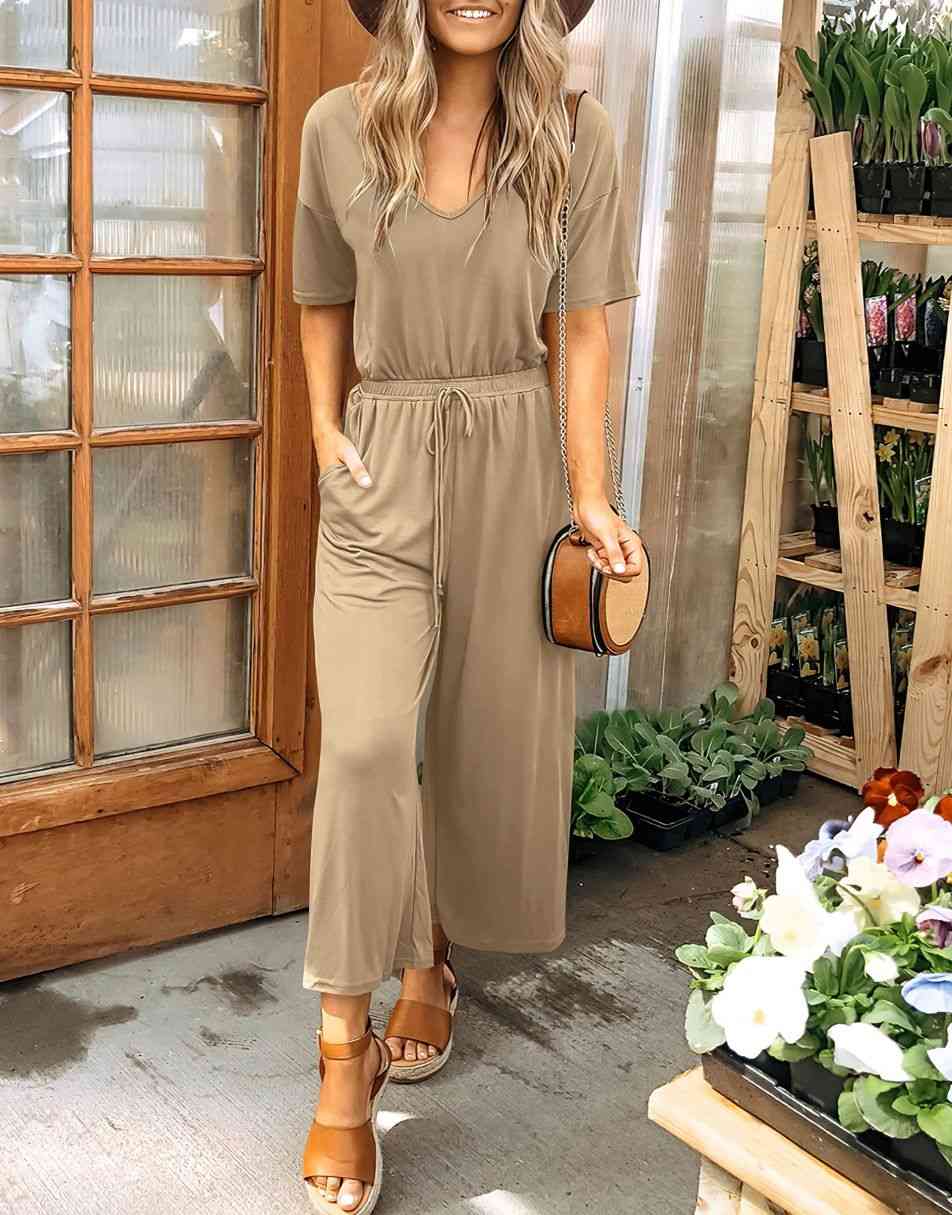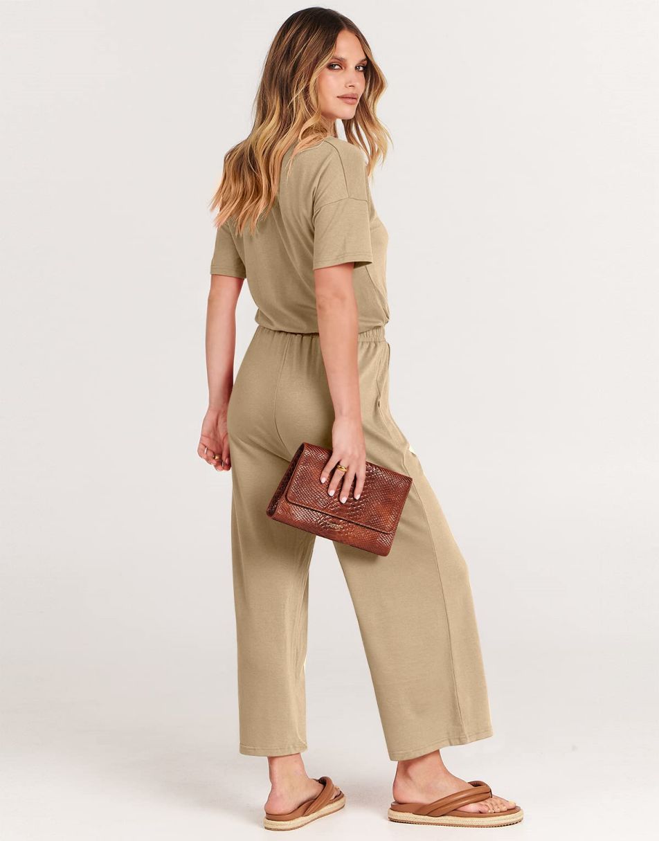 • ANRABESS Short Sleeve V Neck Elastic Waist Wide Leg Cropped Pant Jumpsuits Rompers