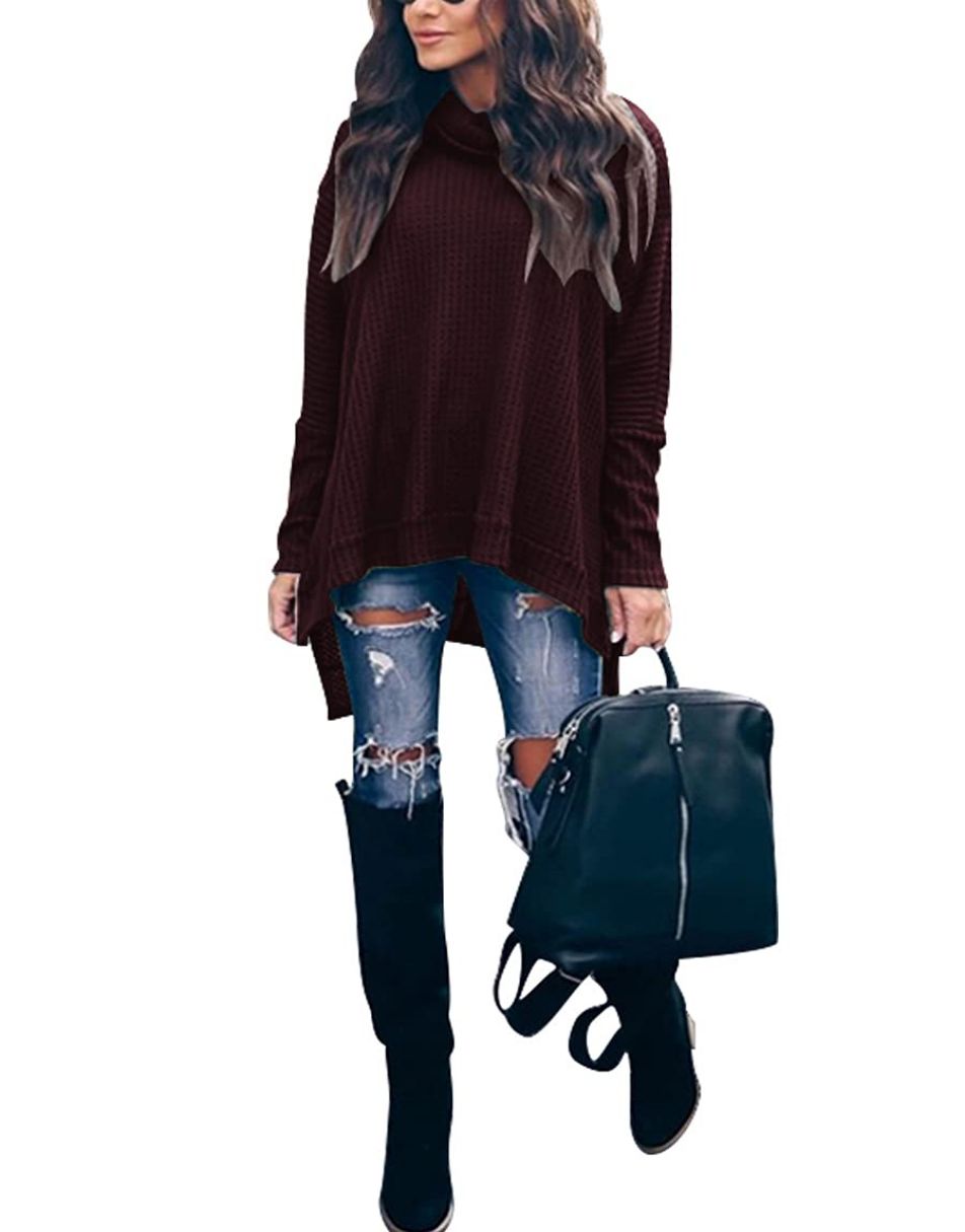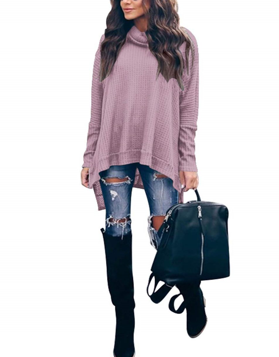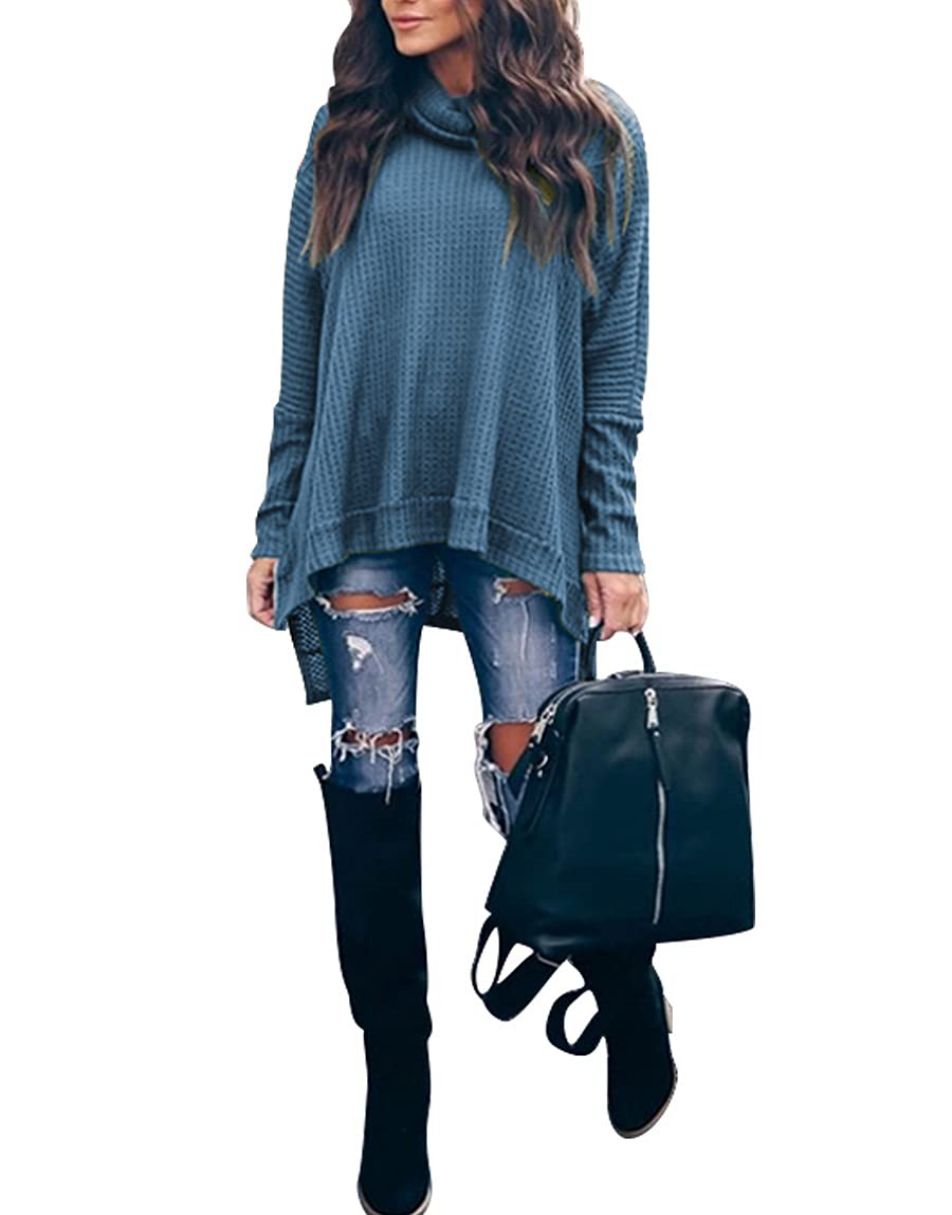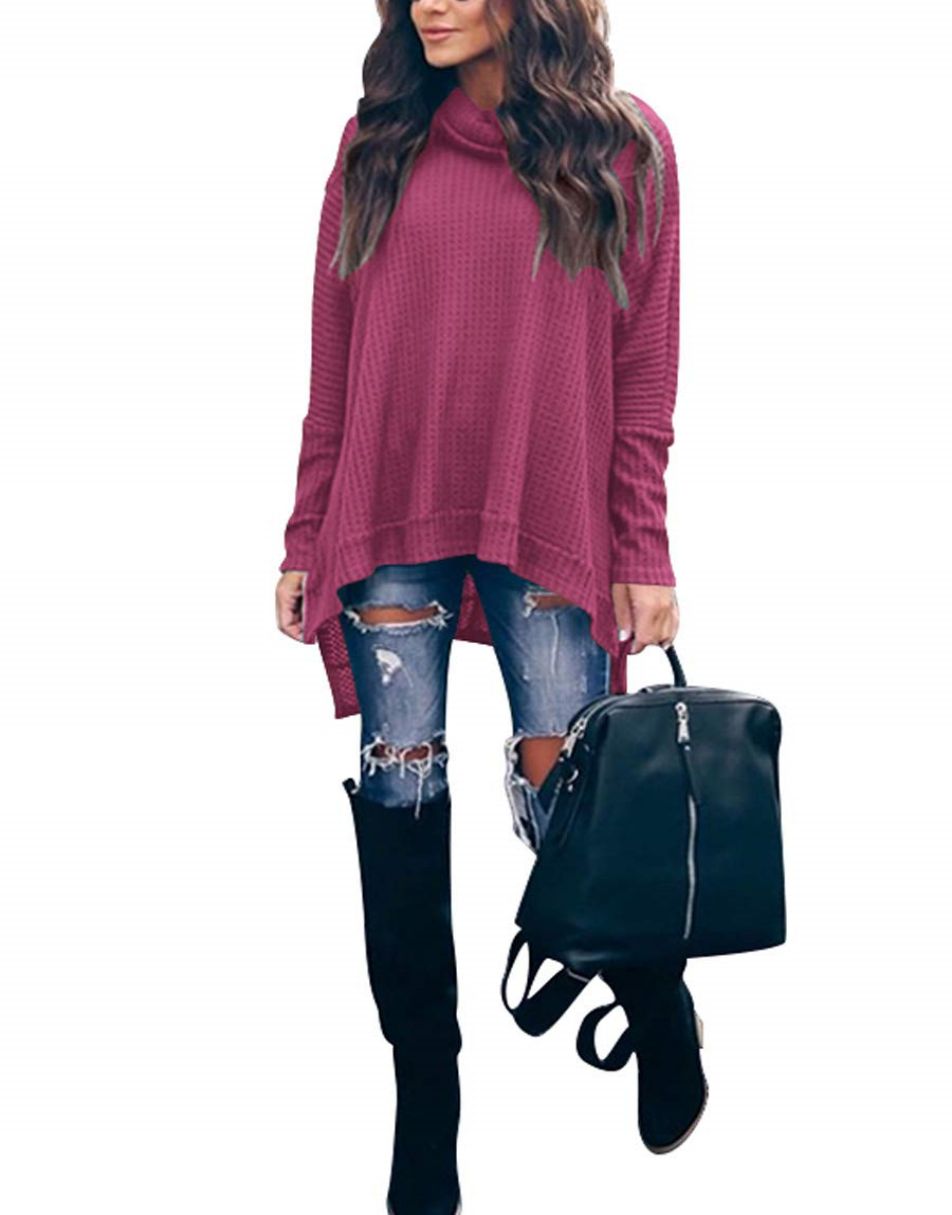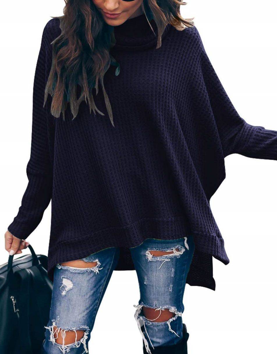 • Features - This casual oversized pullover sweaters designed turtle cowl neck,waffle knit fabri,batwing sleeve,high low hem,side slit,flattering tunic tops.