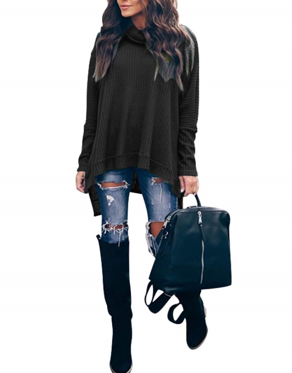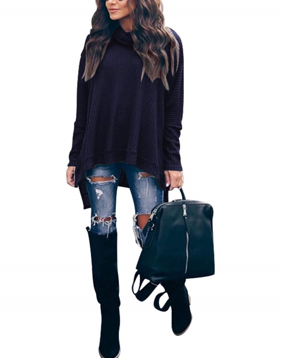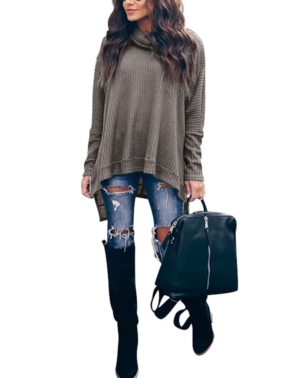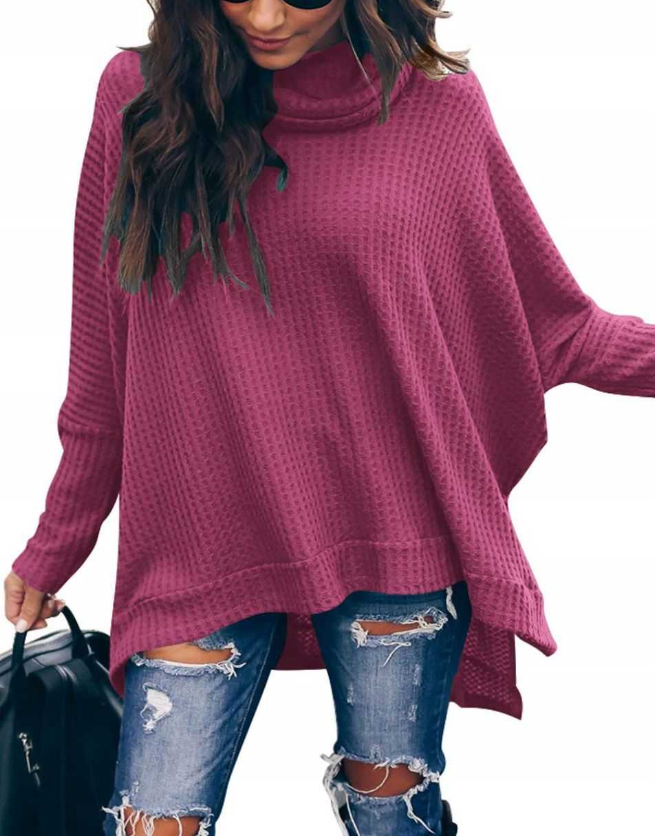 • Features - This casual oversized pullover sweaters designed turtle cowl neck,waffle knit fabri,batwing sleeve,high low hem,side slit,flattering tunic tops.