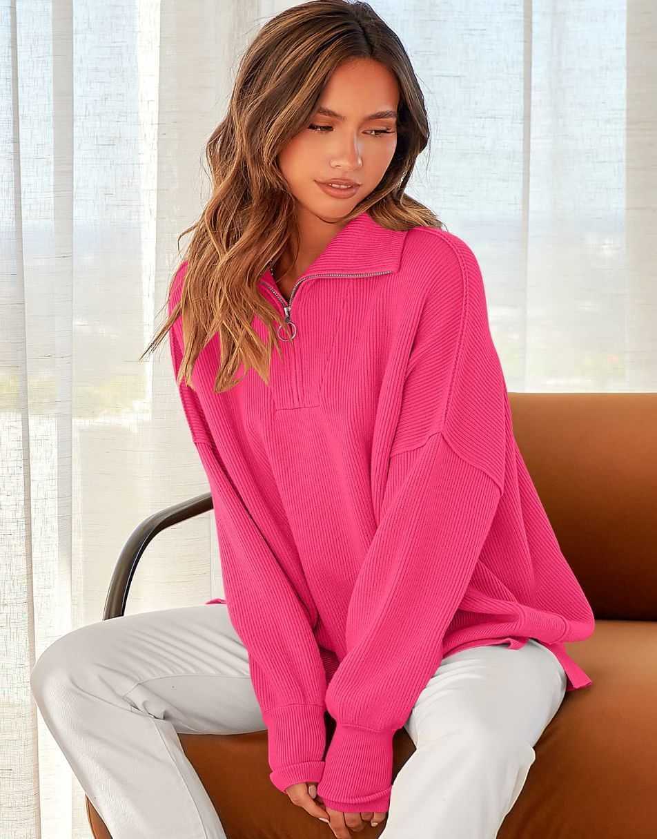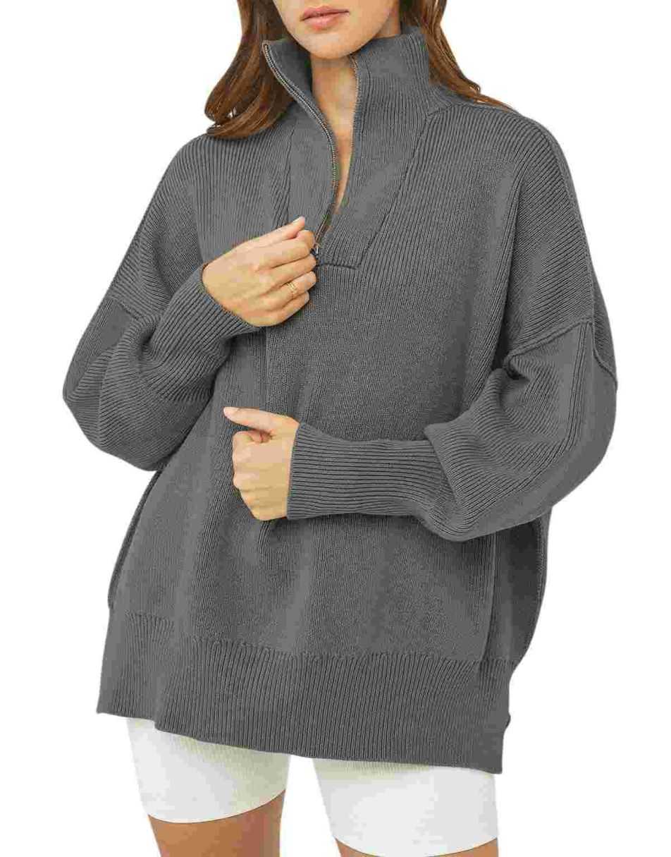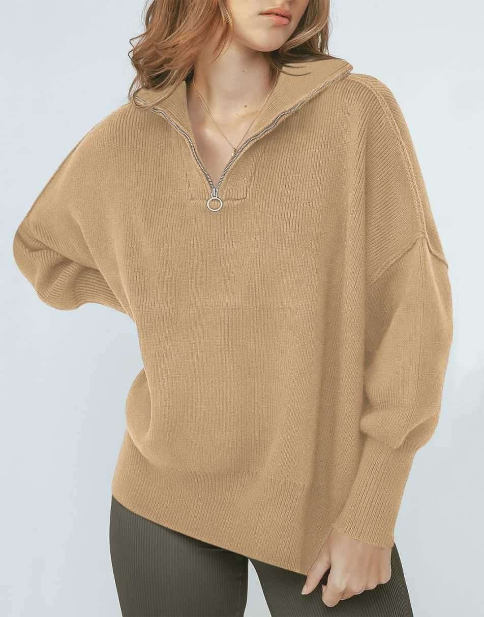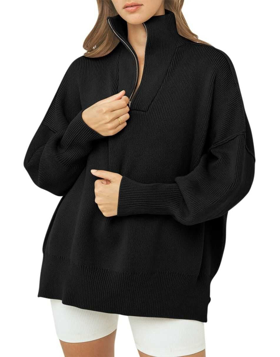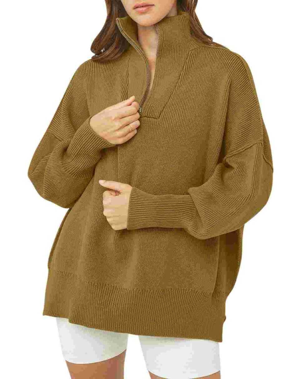 • ANRABESS Women's Oversized Sweater 2023 Fall Long Sleeve Quarter Zipper Collar Drop Shoulder Slouchy Pullover Tops