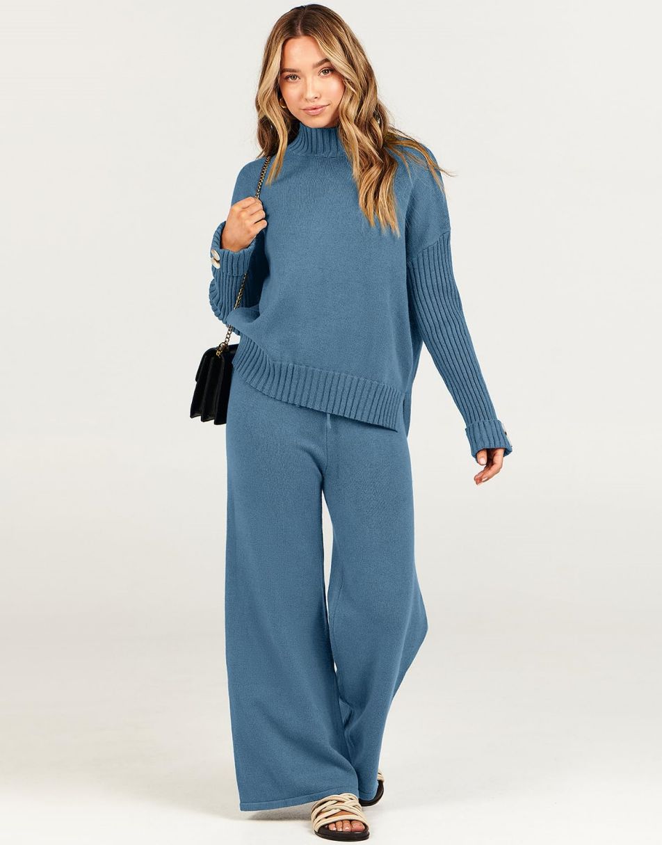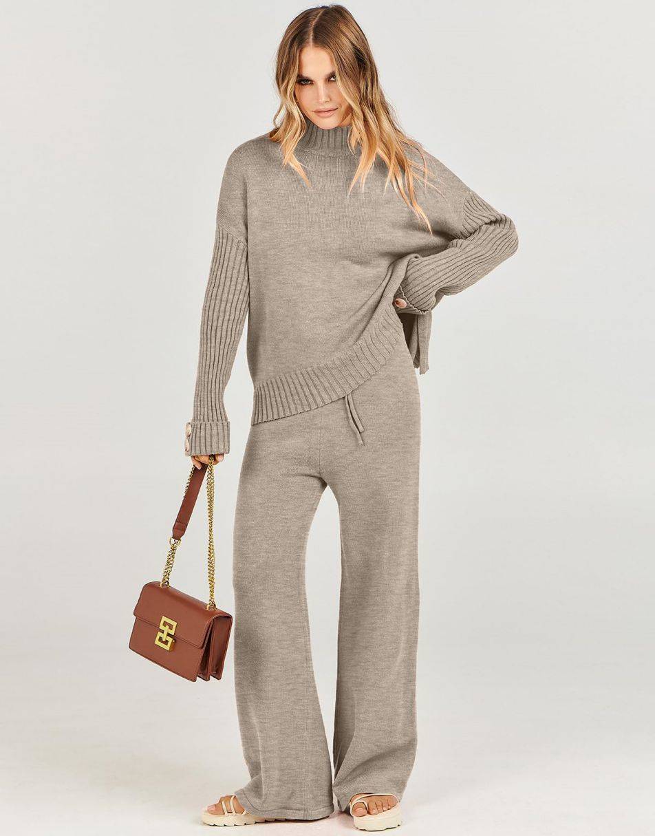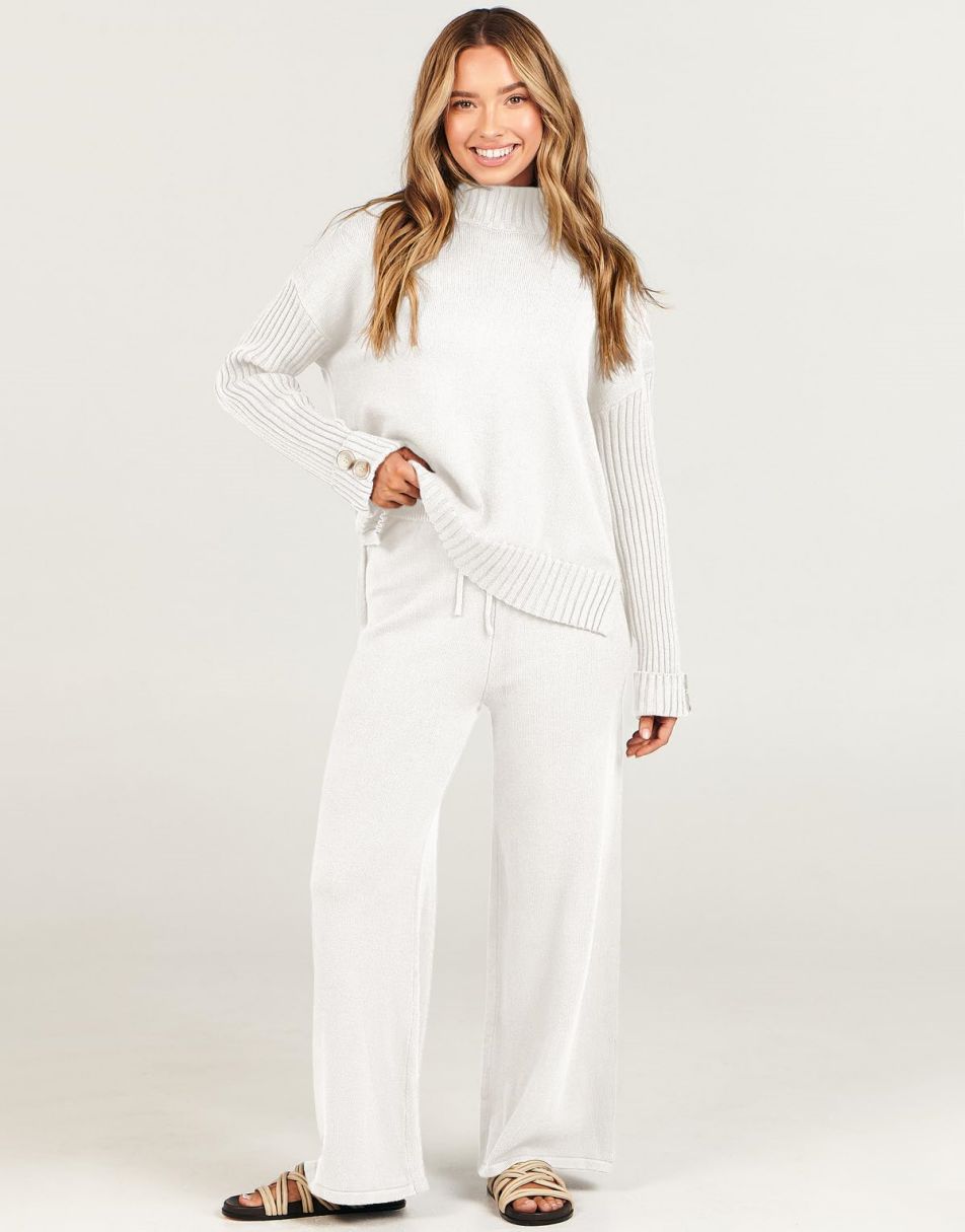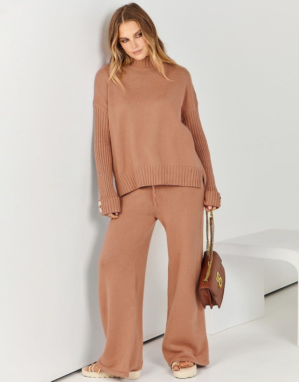 - Fabric - Perfect in a so soft knit fabrication, this two piece matching set is a cozy instant outfit. Slouchy, relaxed fit with wide-leg pants.