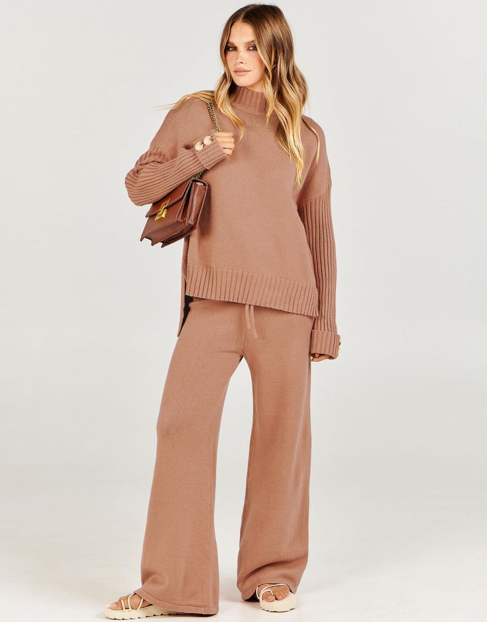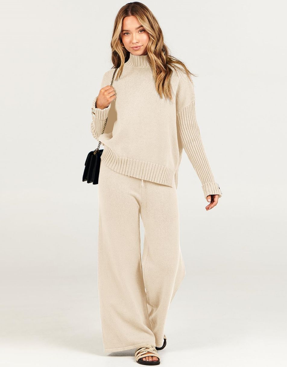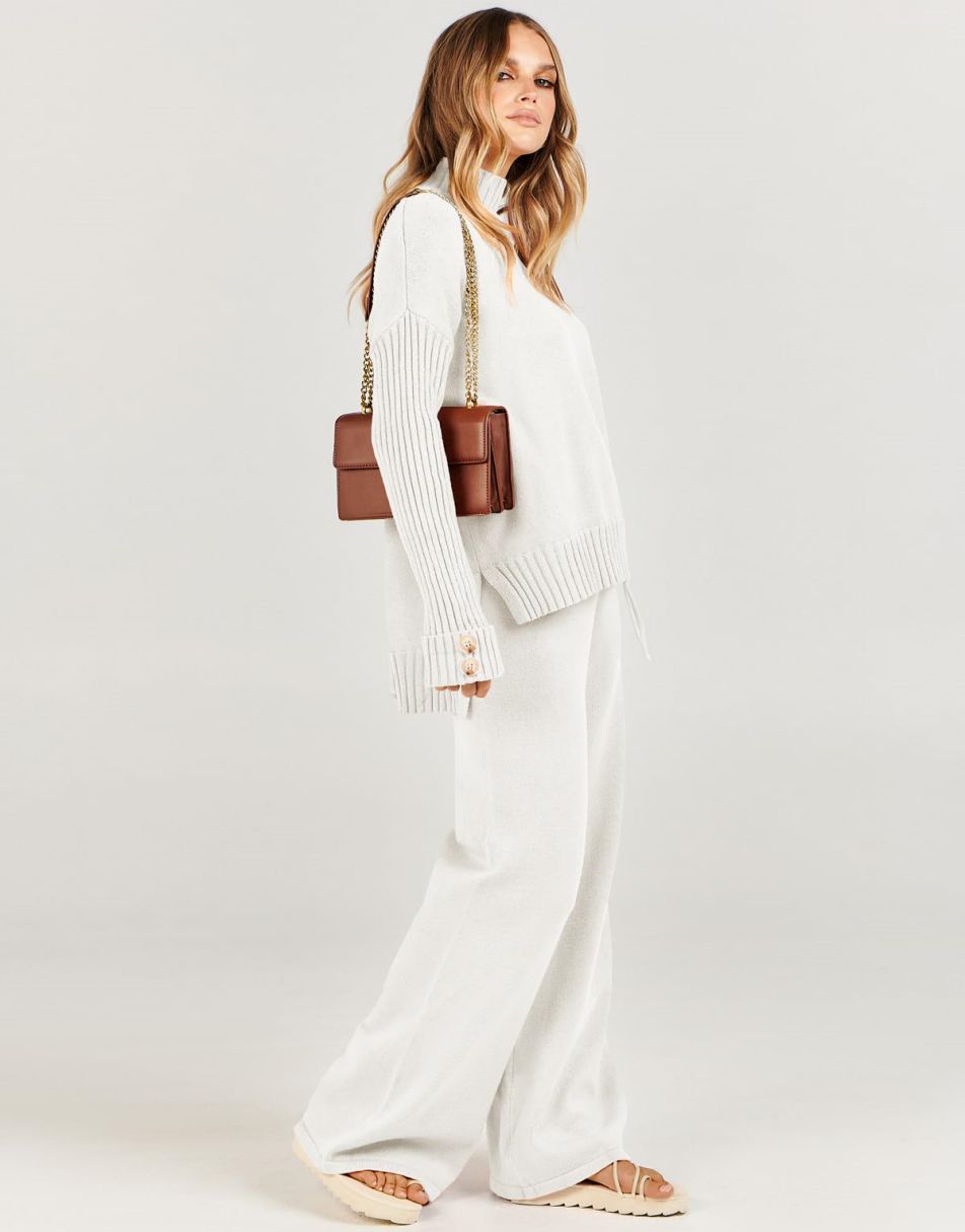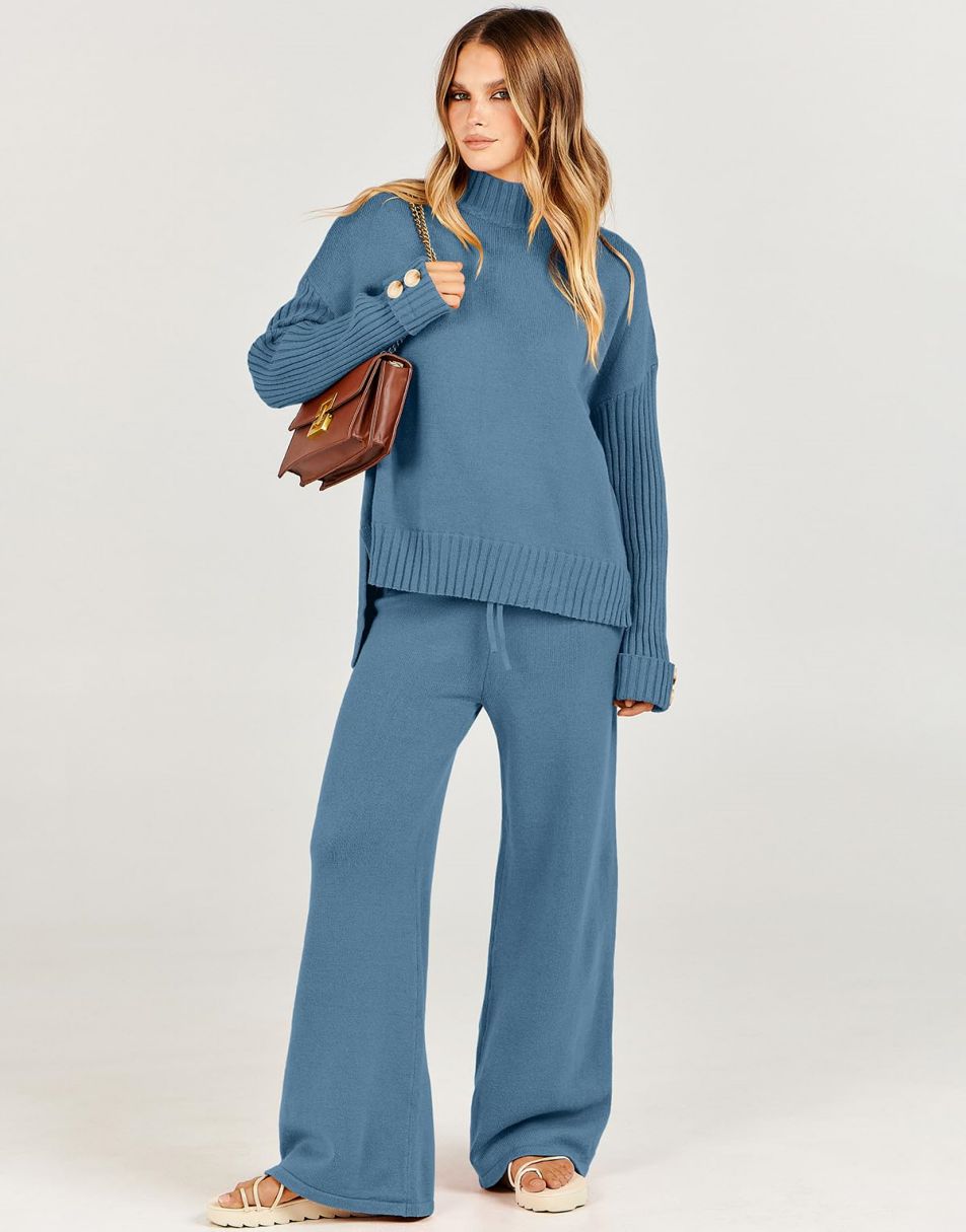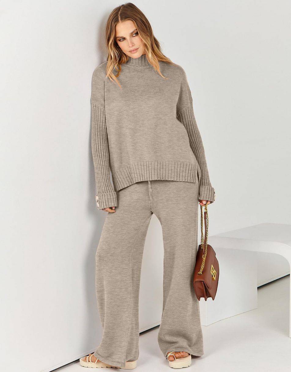 - Fabric - Perfect in a so soft knit fabrication, this two piece matching set is a cozy instant outfit. Slouchy, relaxed fit with wide-leg pants.